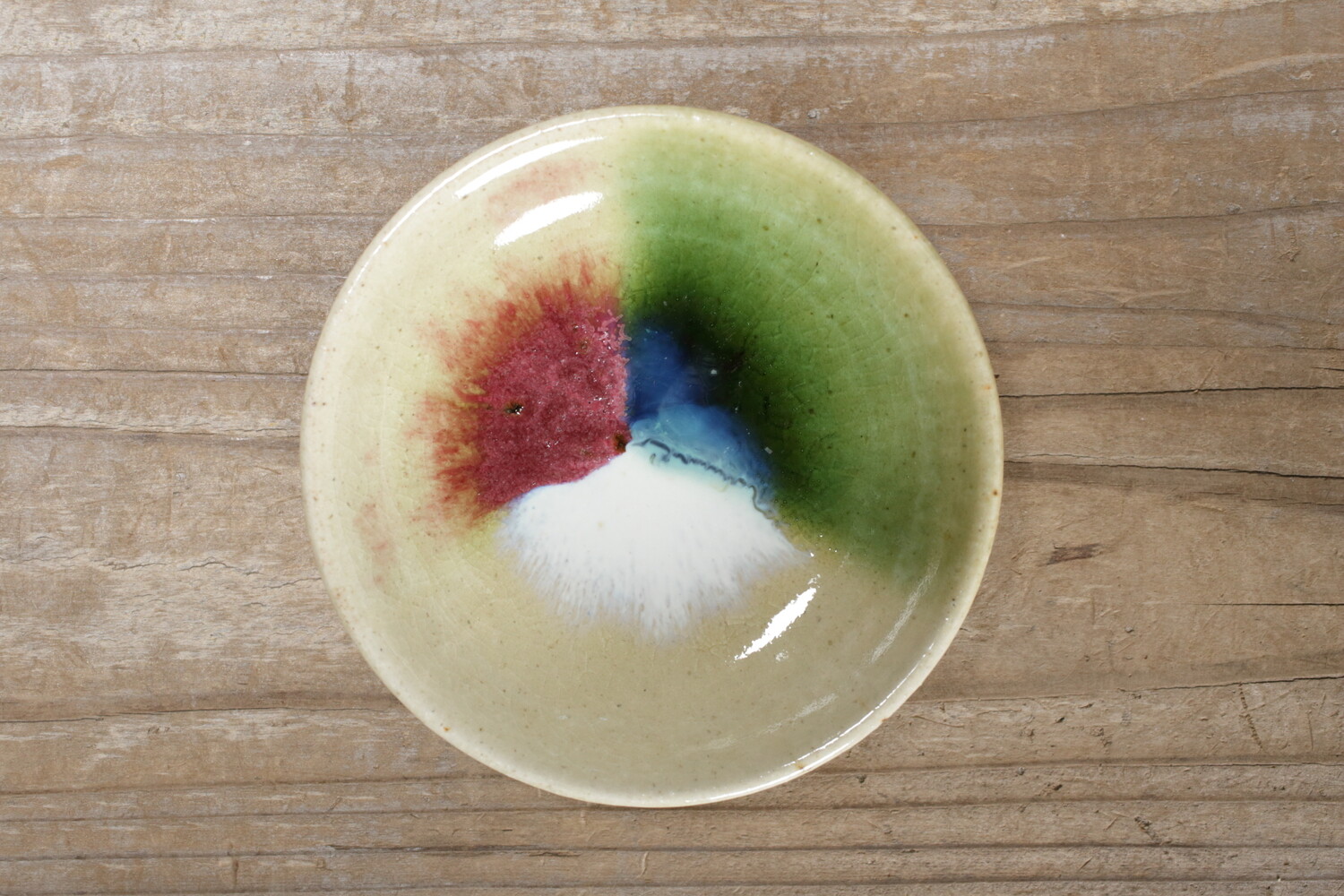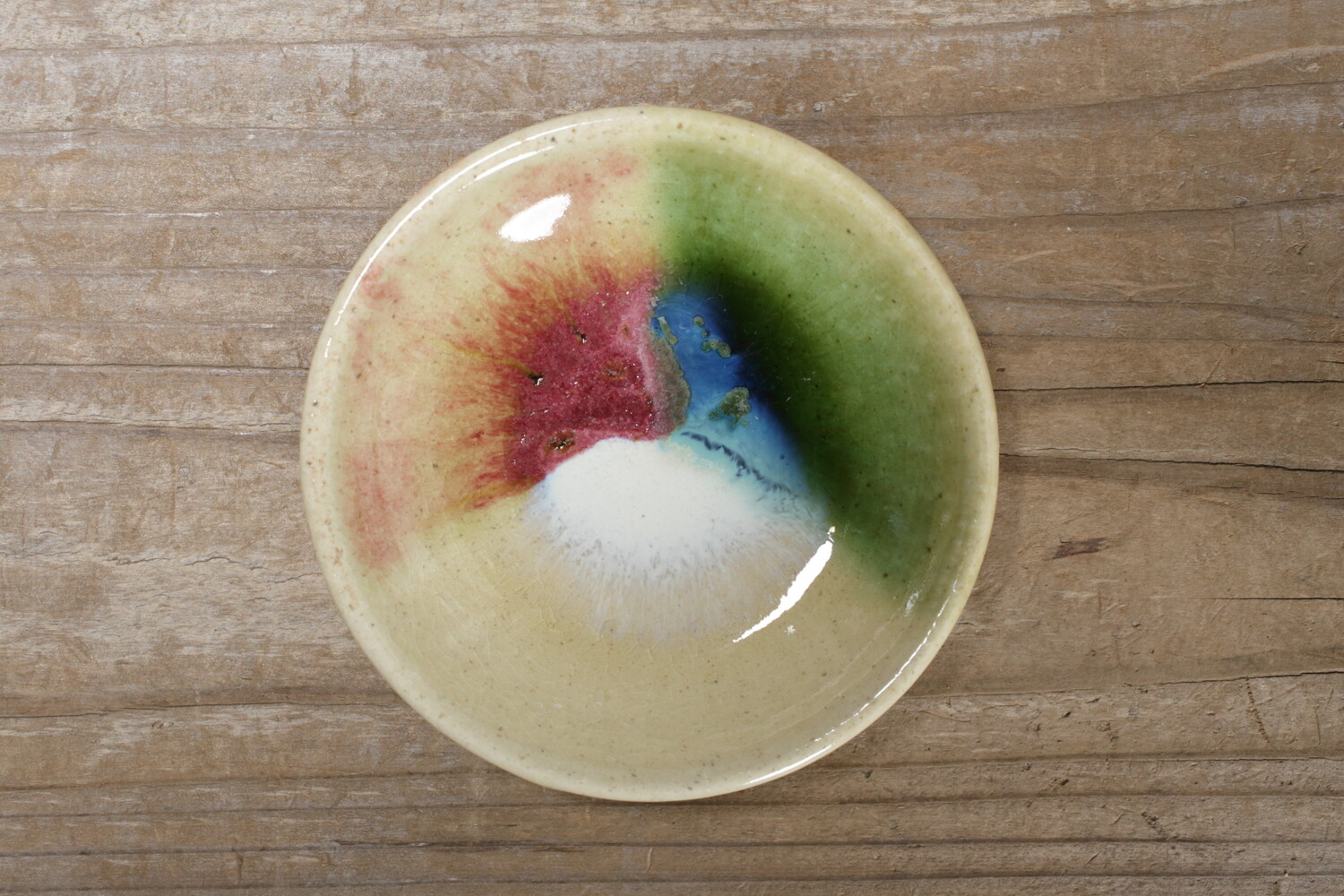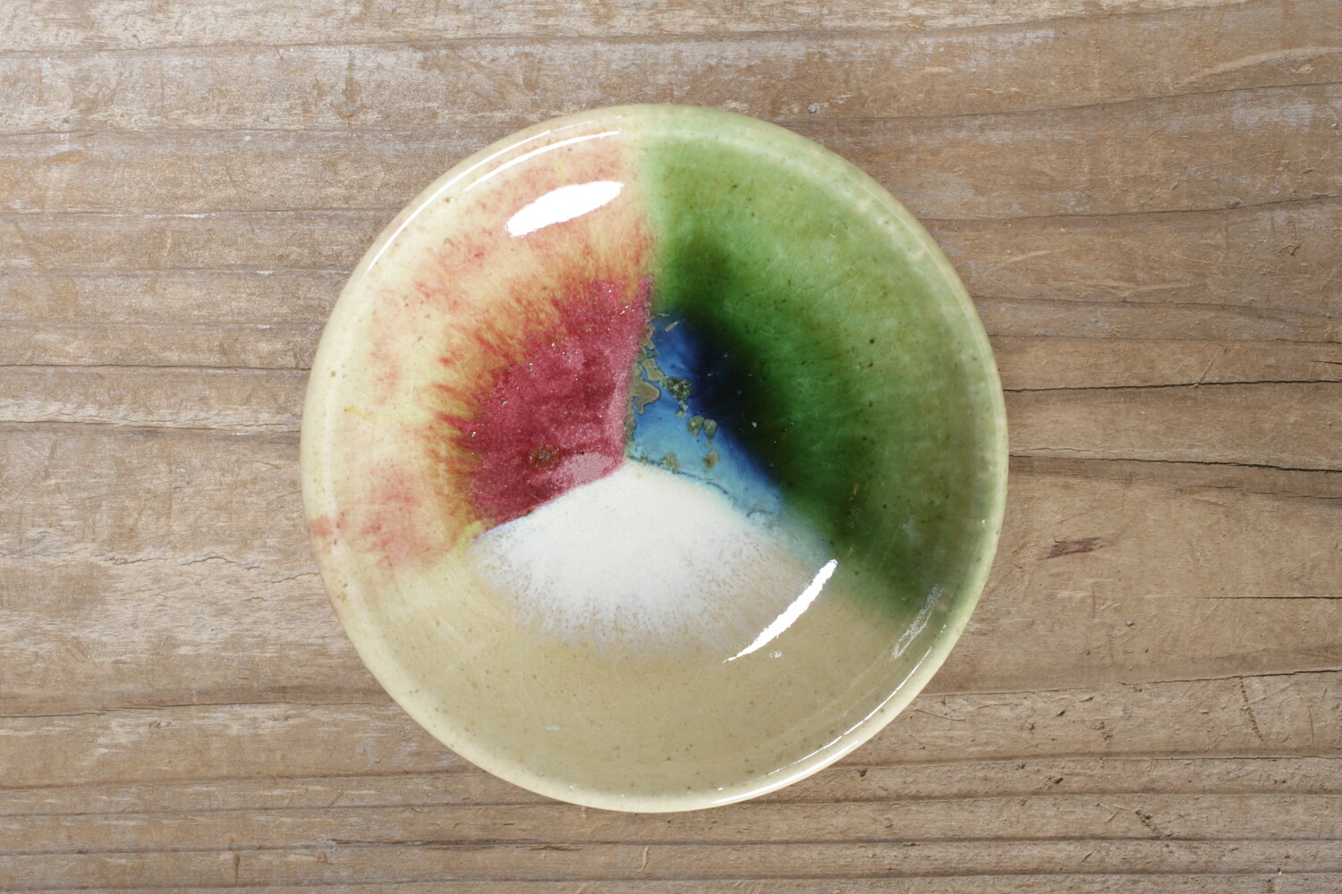 直径11.3cmほどの楽しい配色の小皿。瀬戸の白い陶土だからこその美しい色合いです。