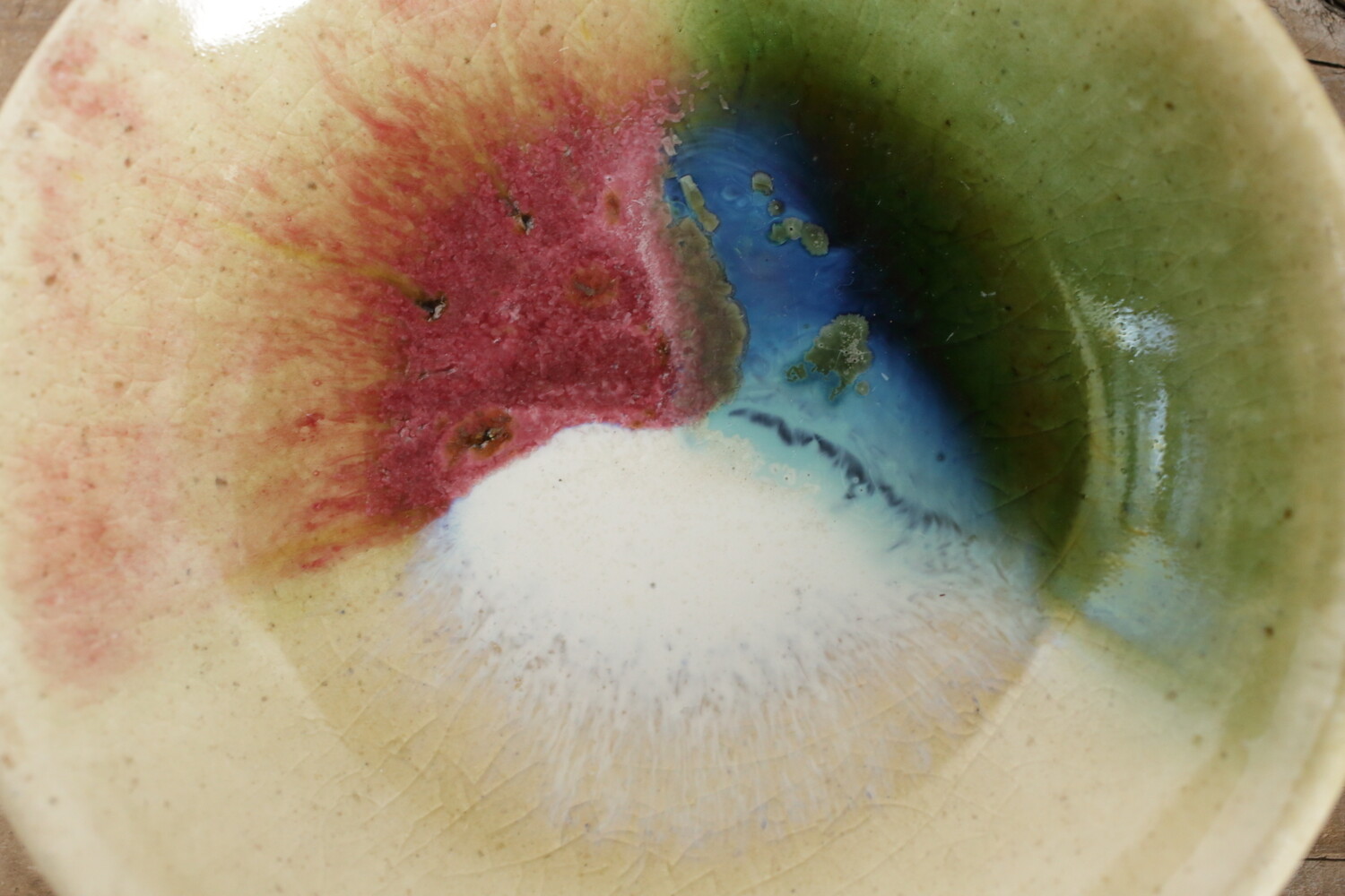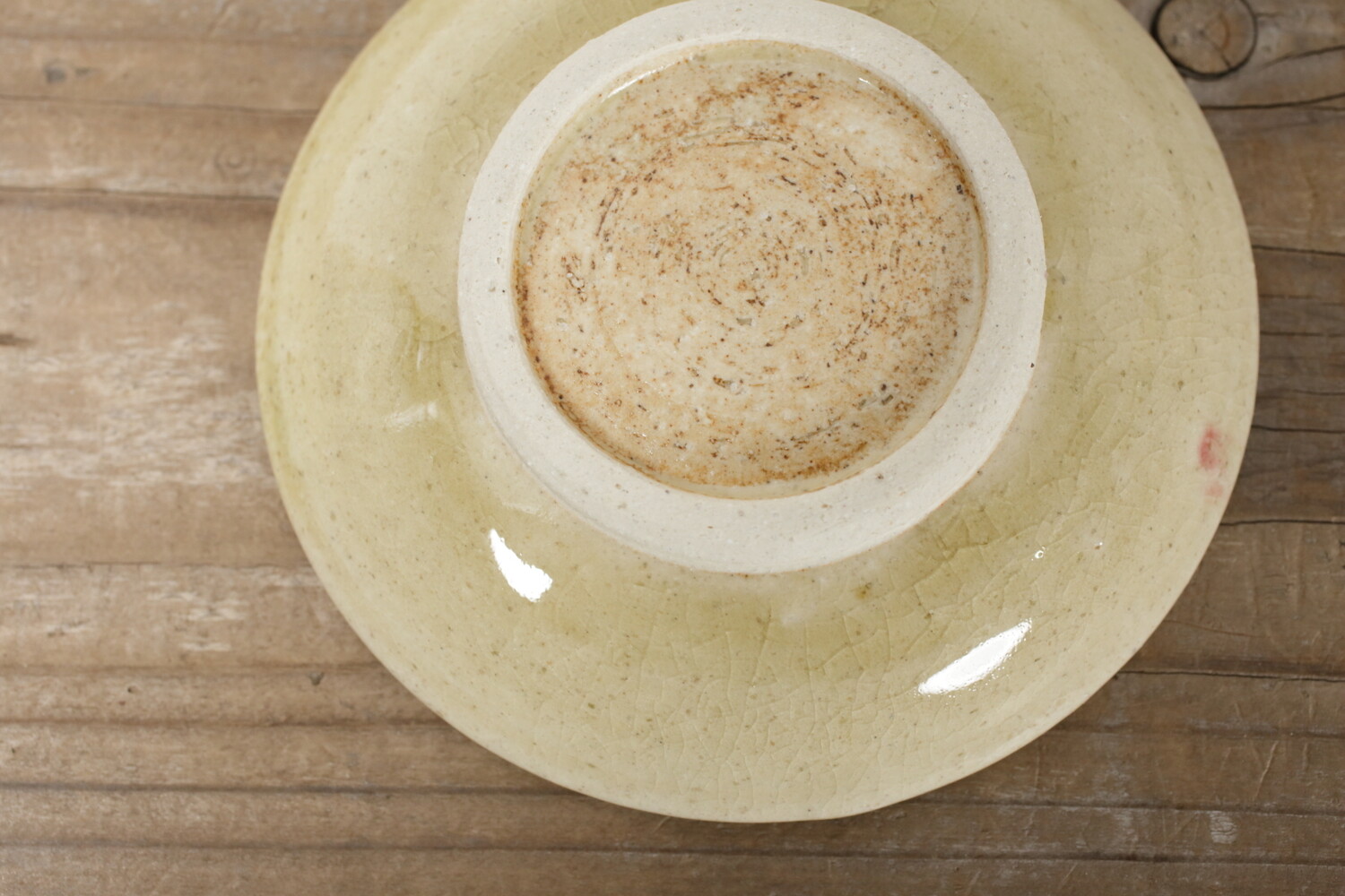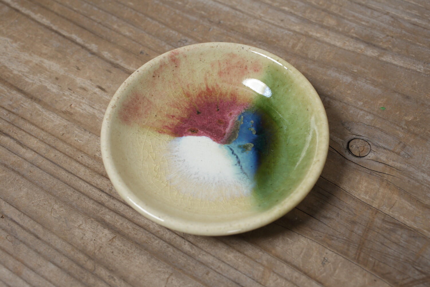 直径11.3cmほどの楽しい配色の小皿。瀬戸の白い陶土だからこその美しい色合いです。