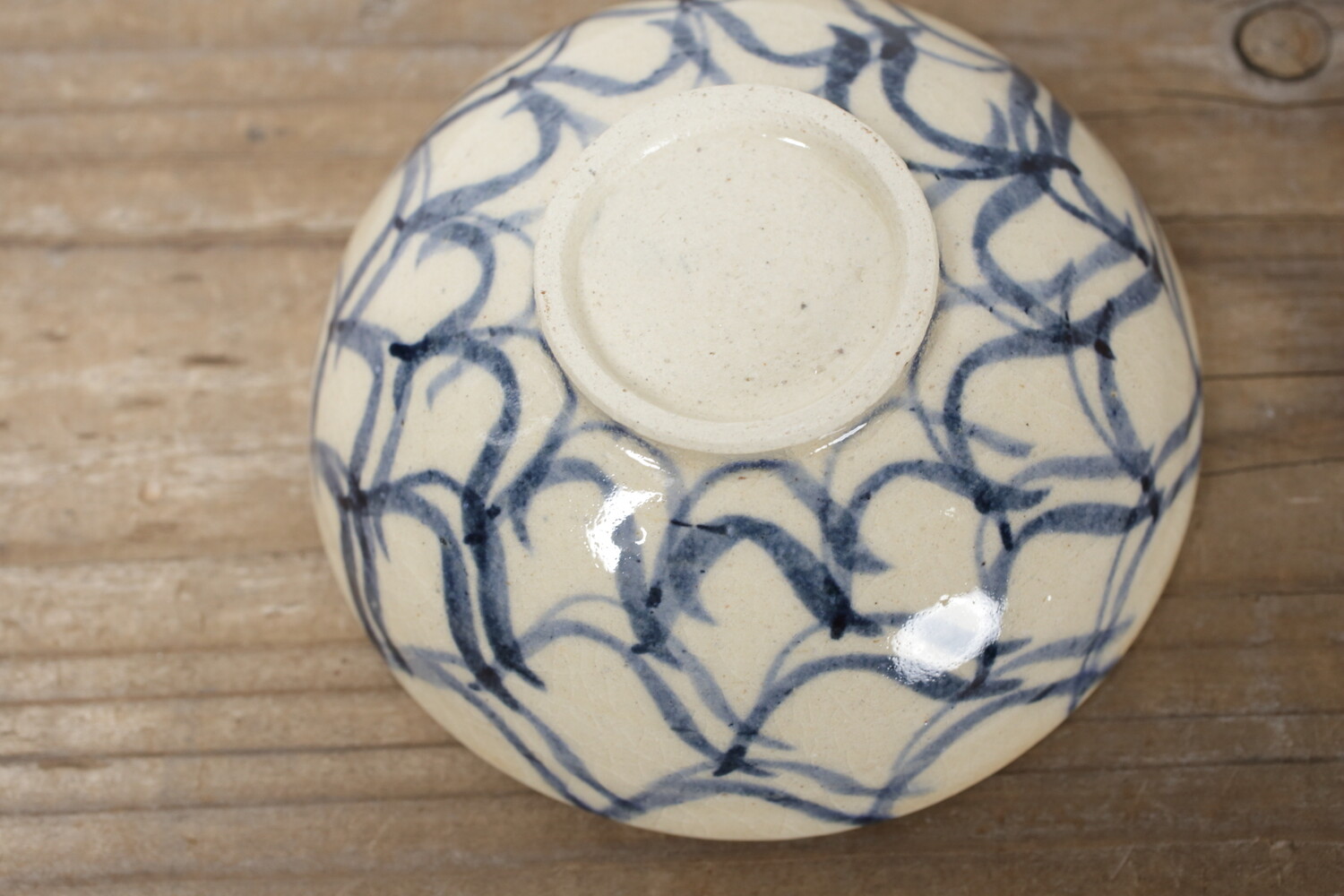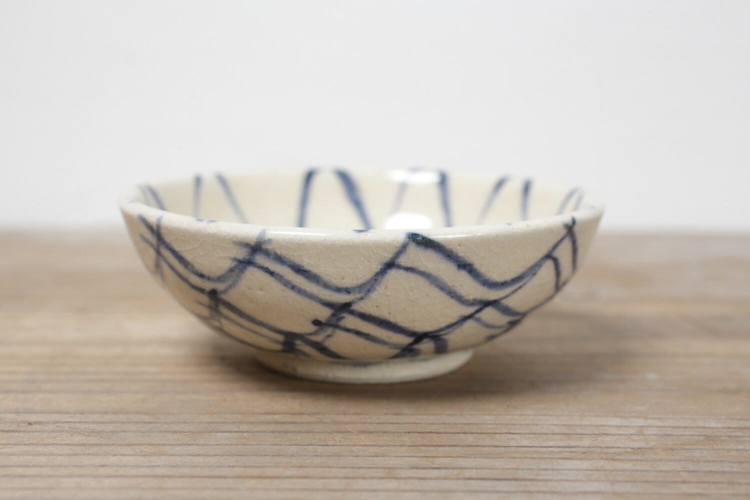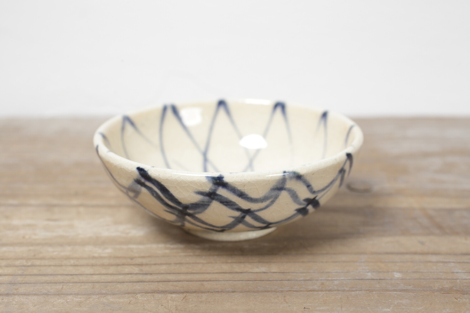 呉須釉で網目模様が描かれた直径11cmほどの小鉢。和え物や酢の物、デザートにもいいでしょう。