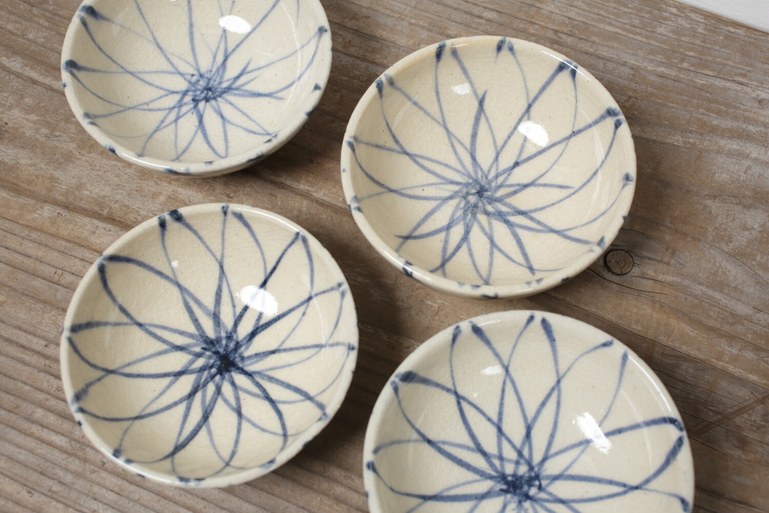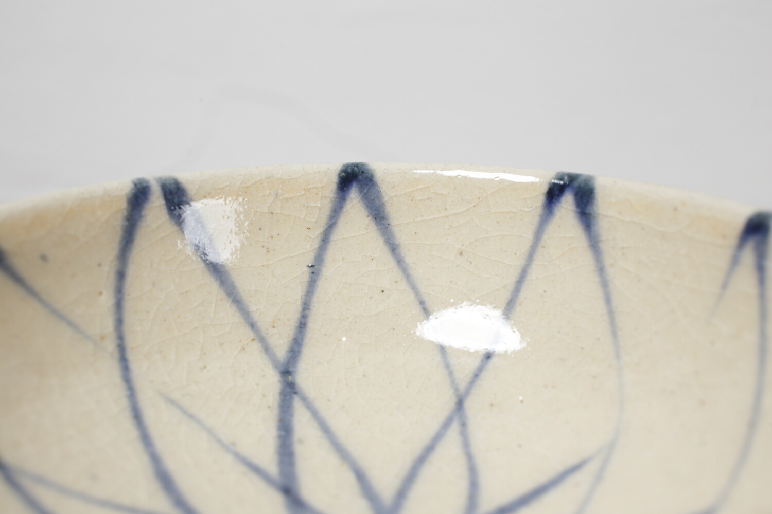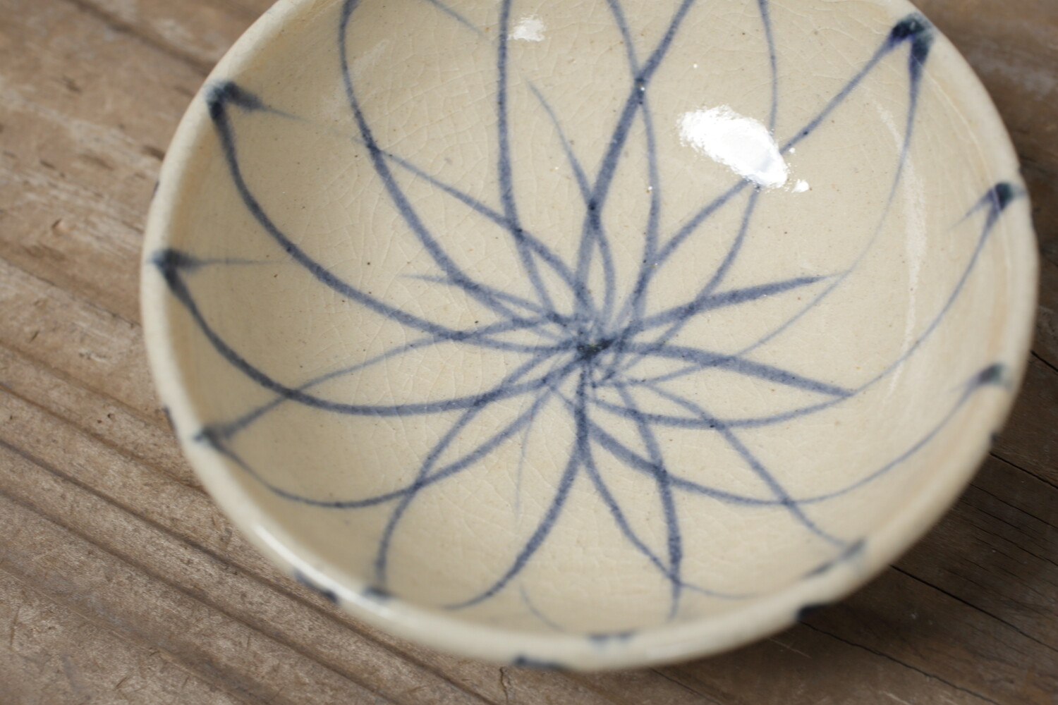 呉須釉で網目模様が描かれた直径11cmほどの小鉢。和え物や酢の物、デザートにもいいでしょう。