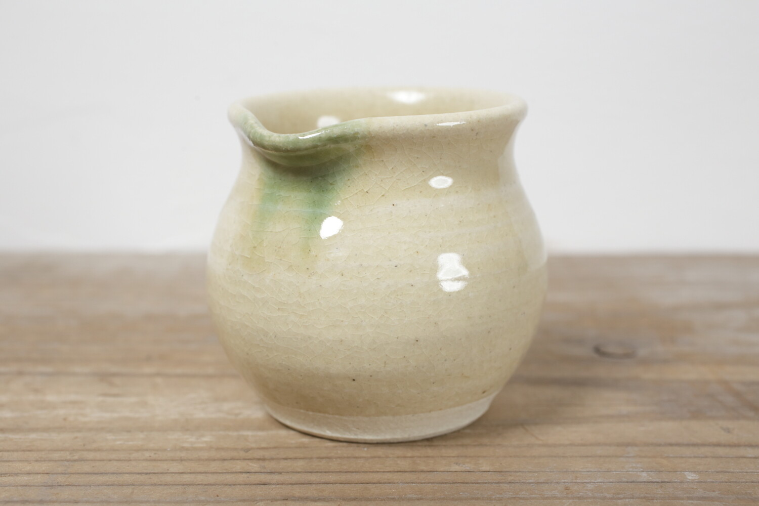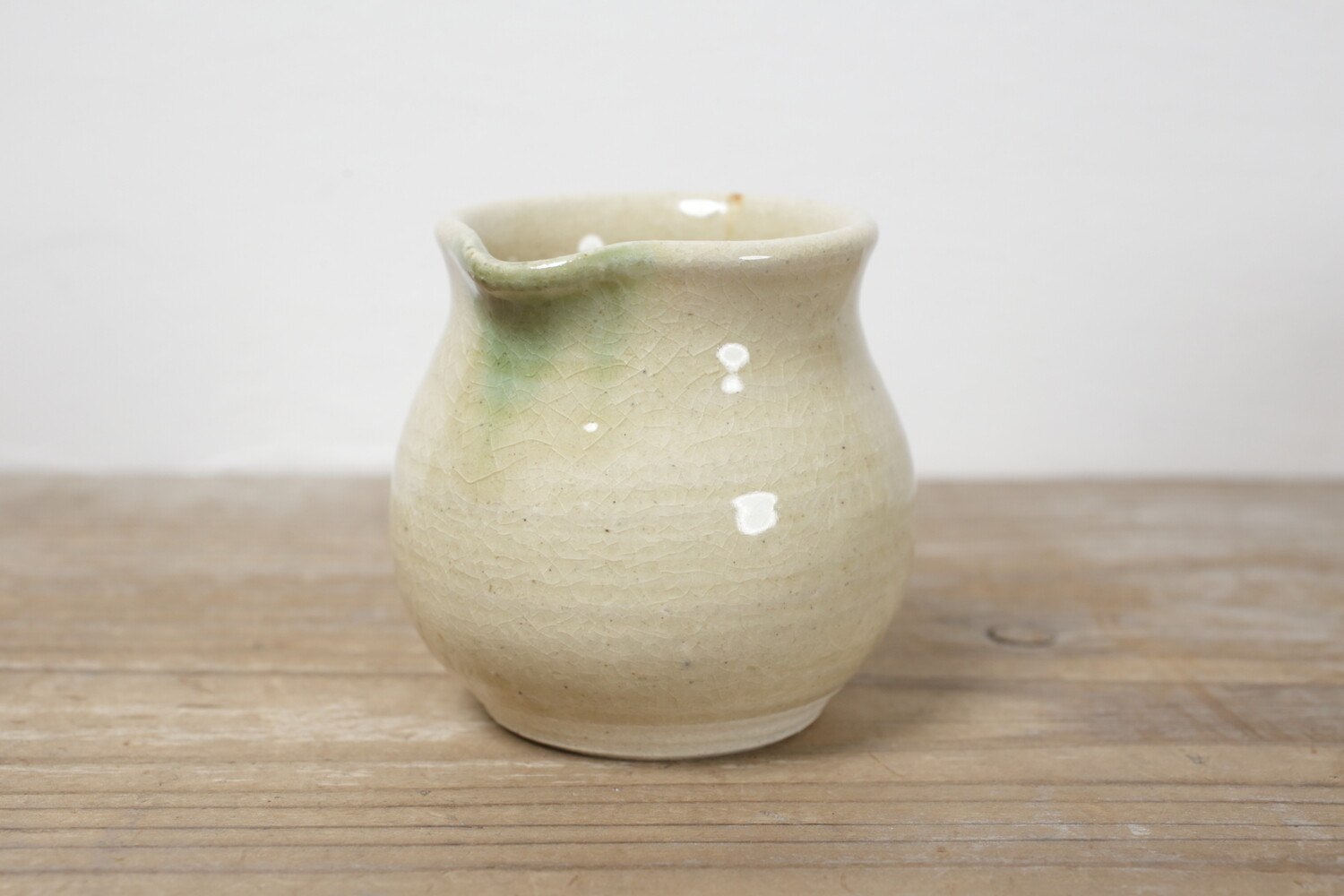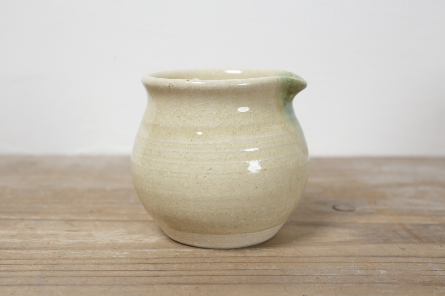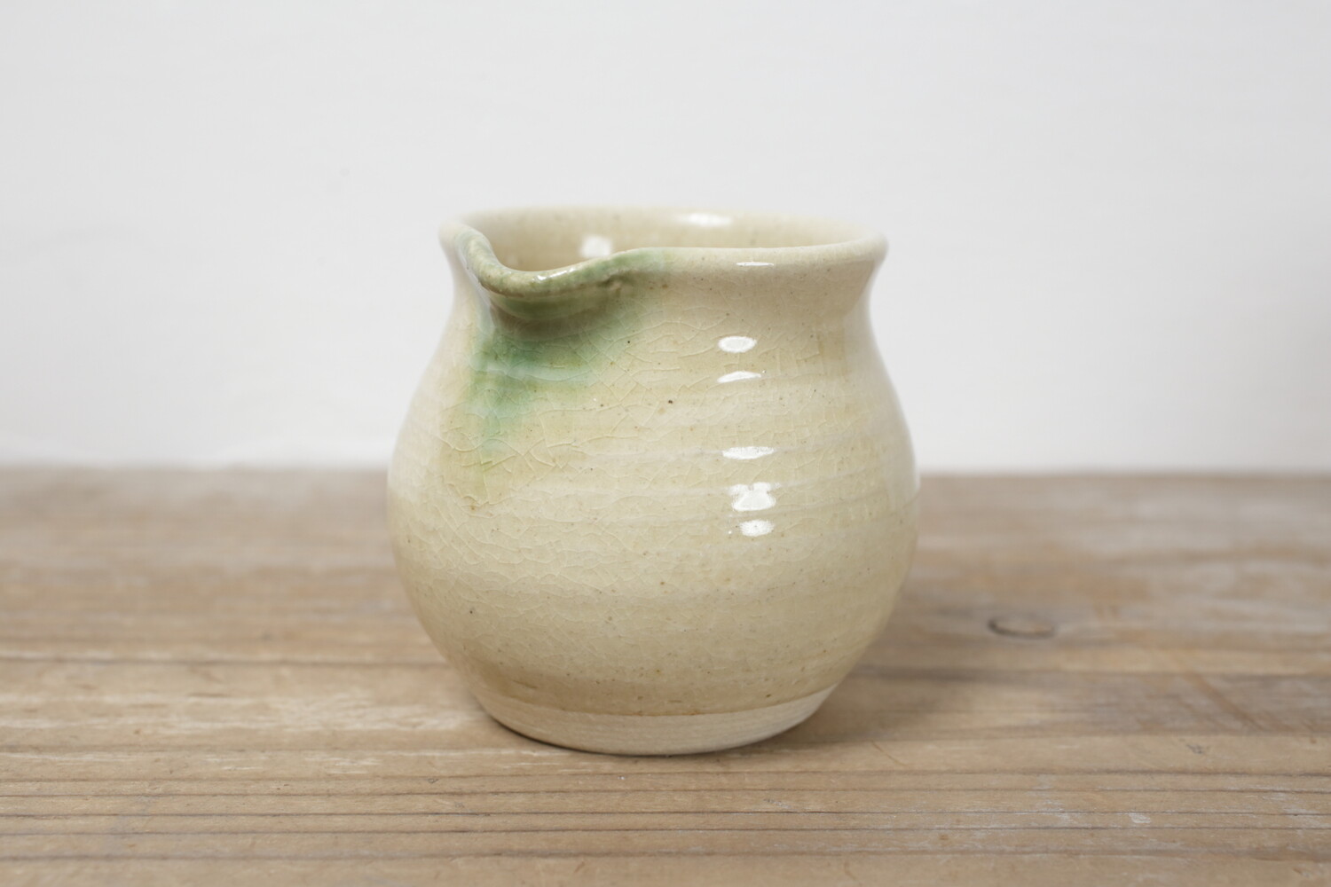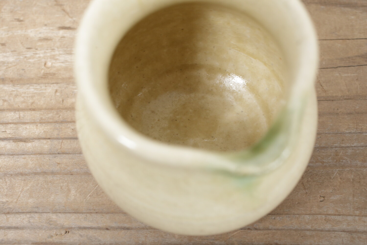 ころんとした丸みが可愛らしい瀬戸本業窯の片口。瀬戸の白土にほんのりと口元に掛かった緑釉が軽やかなアクセントになっています。