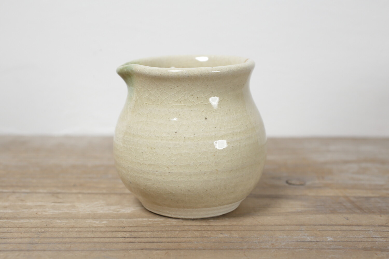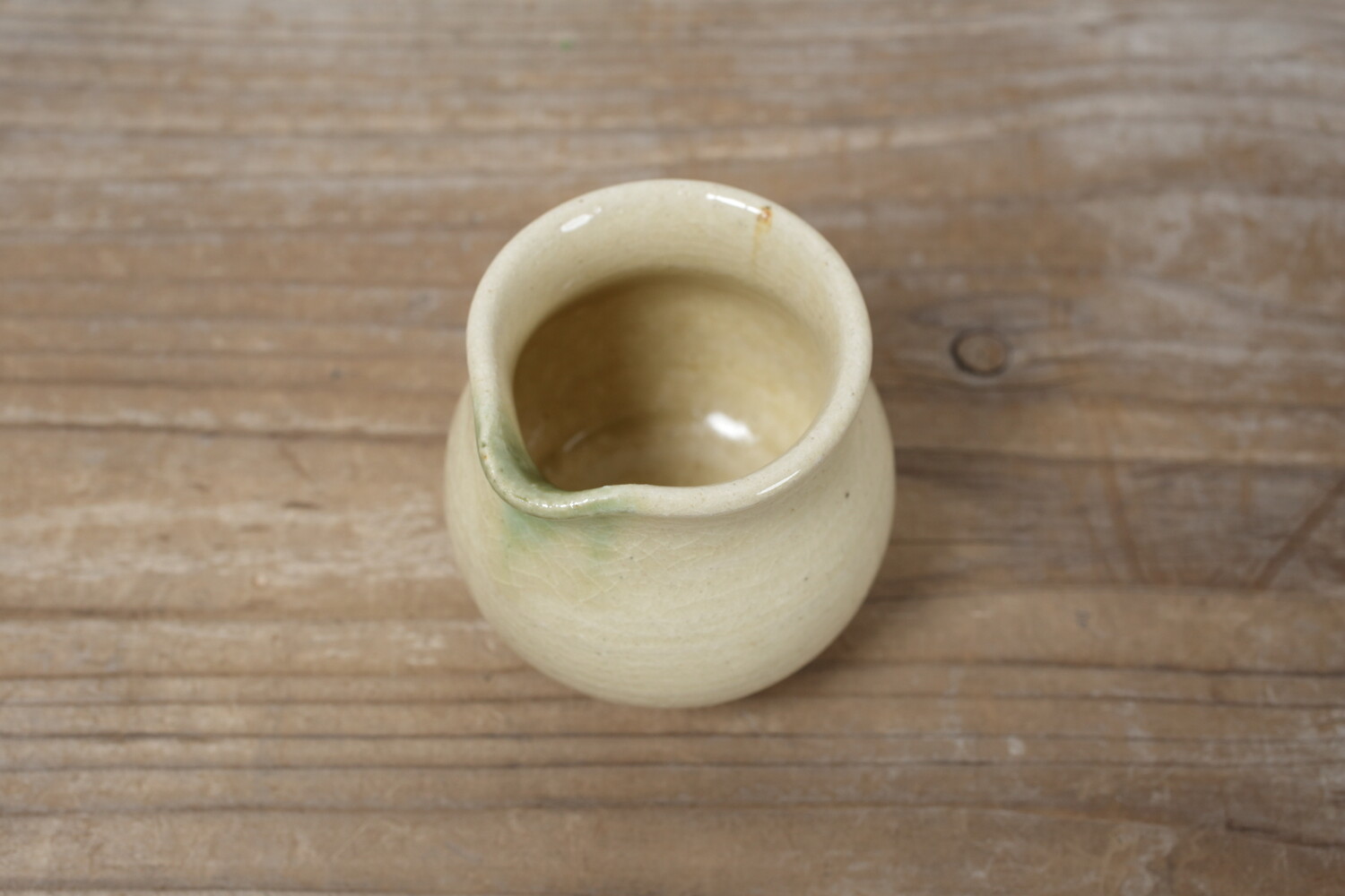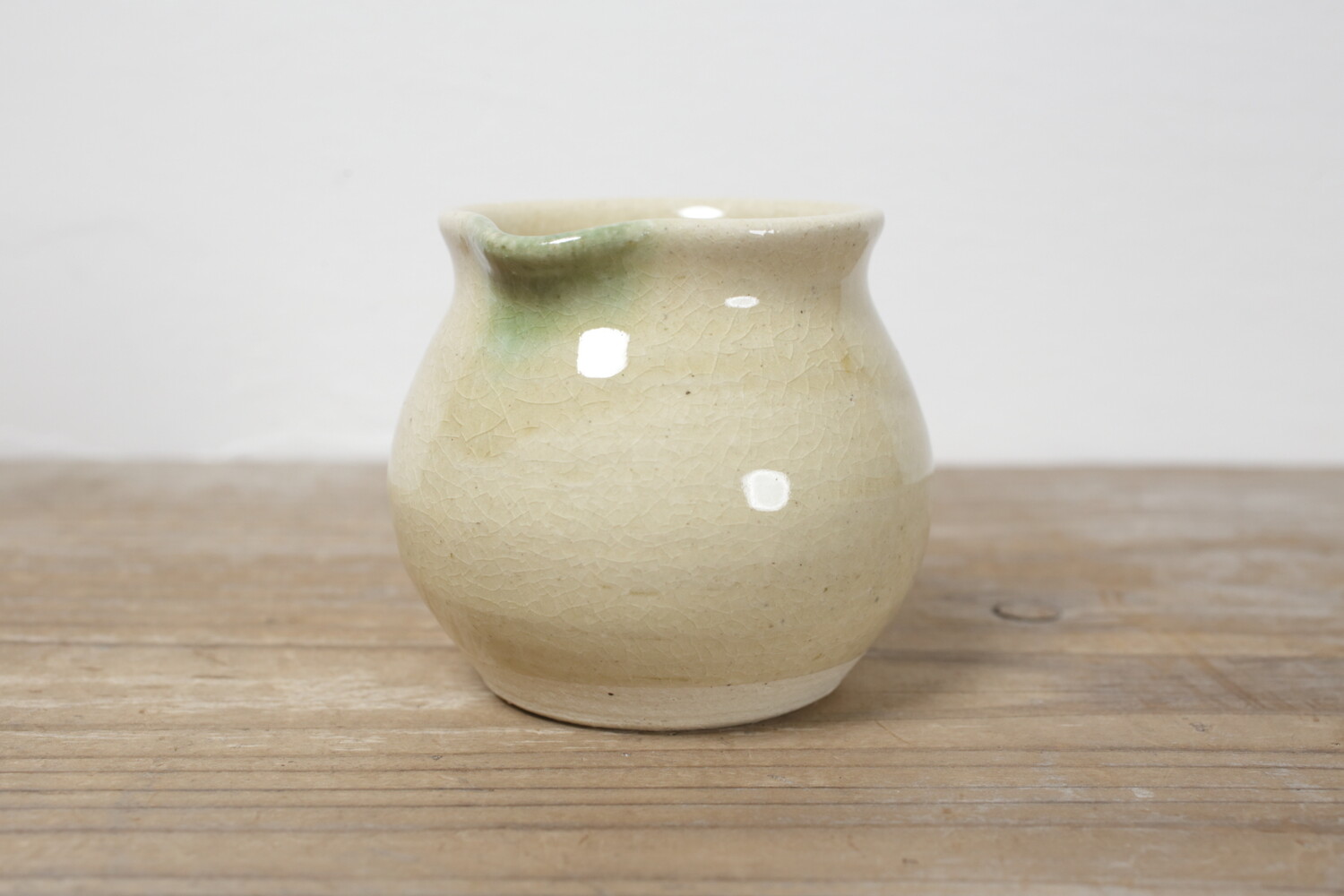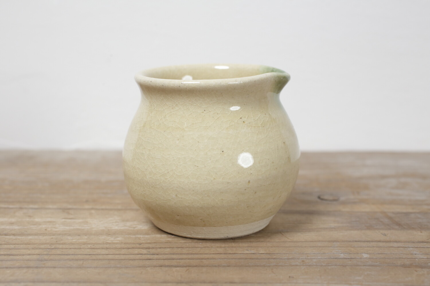 ころんとした丸みが可愛らしい瀬戸本業窯の片口。瀬戸の白土にほんのりと口元に掛かった緑釉が軽やかなアクセントになっています。
