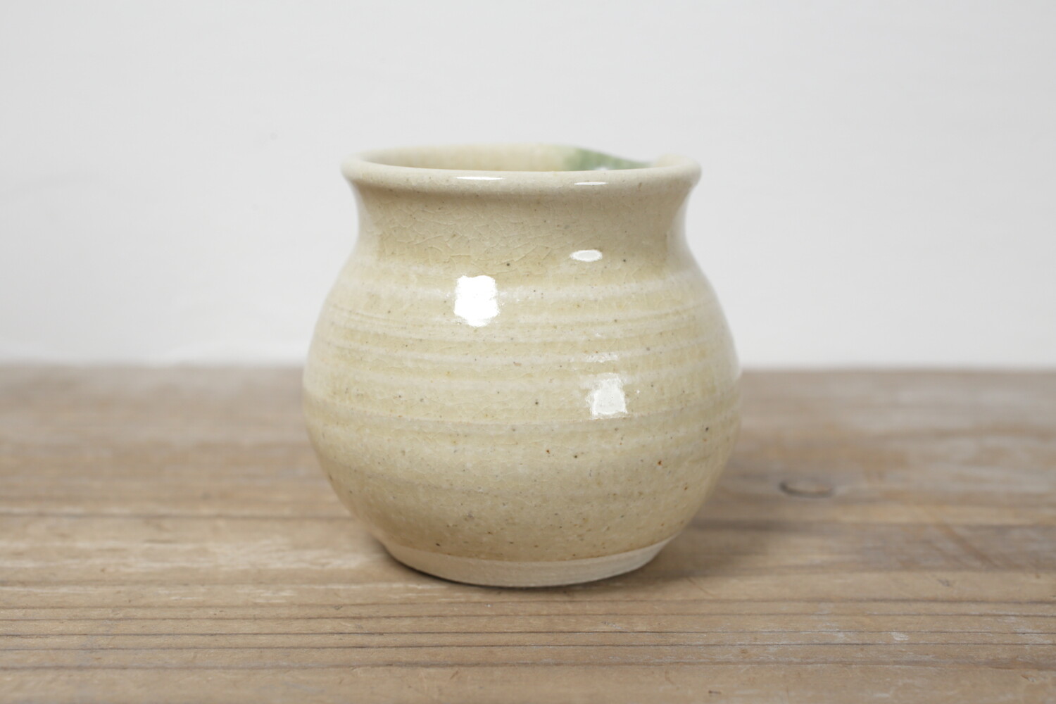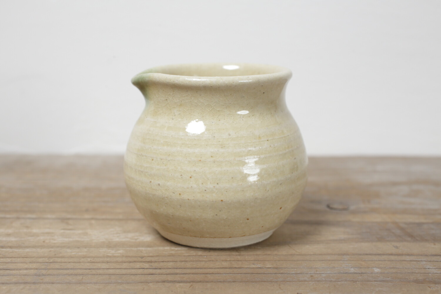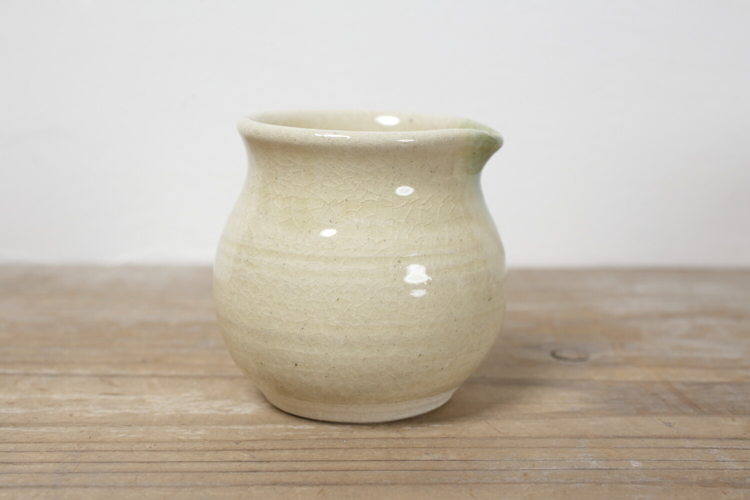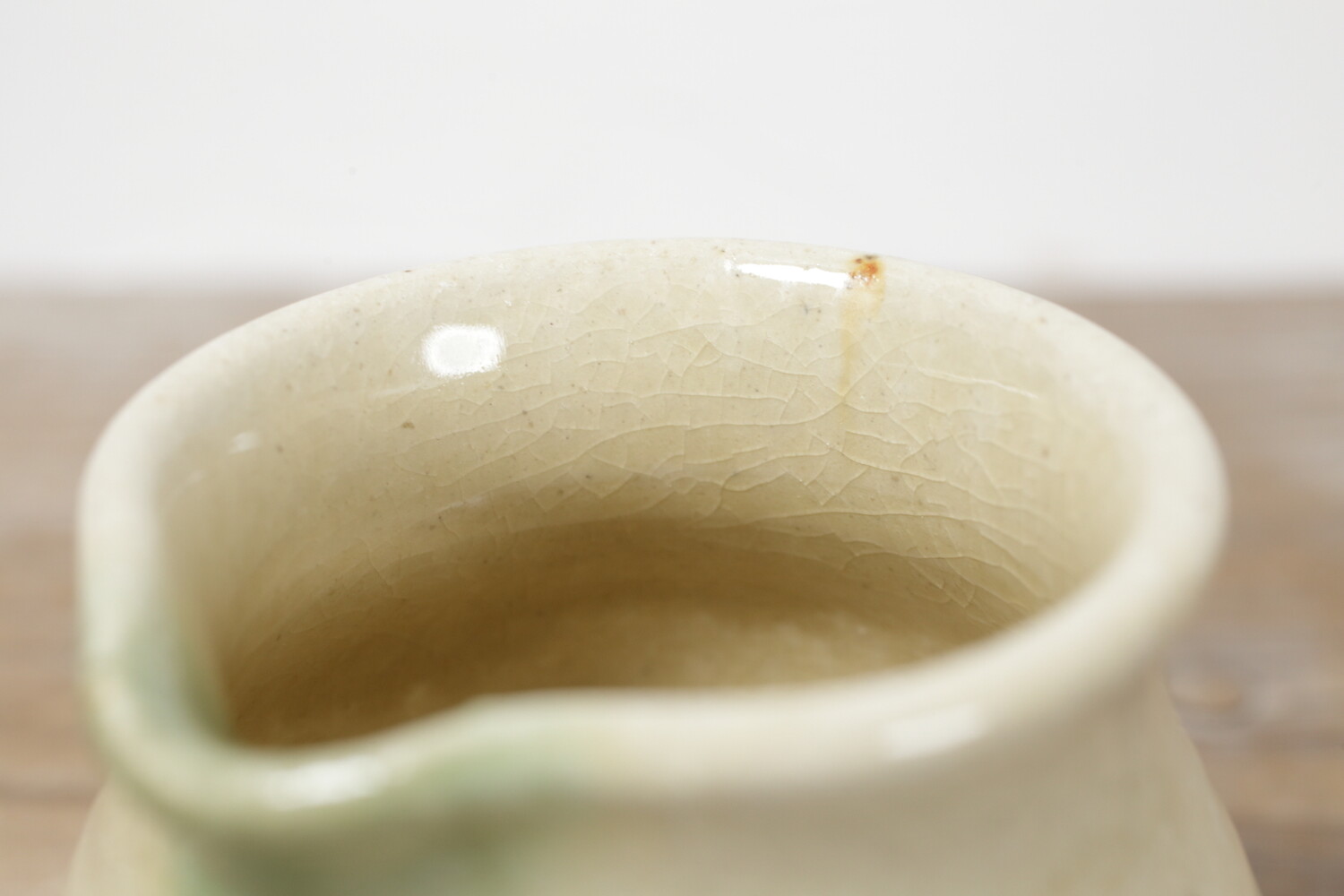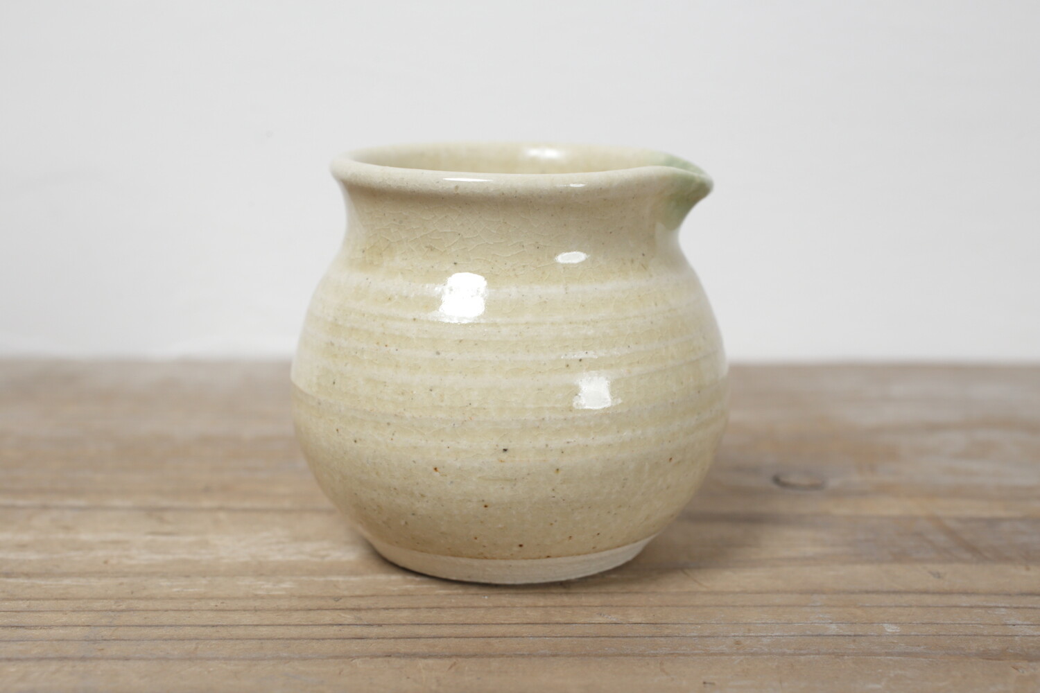 ころんとした丸みが可愛らしい瀬戸本業窯の片口。瀬戸の白土にほんのりと口元に掛かった緑釉が軽やかなアクセントになっています。