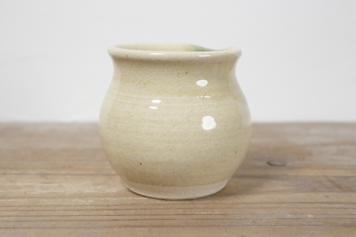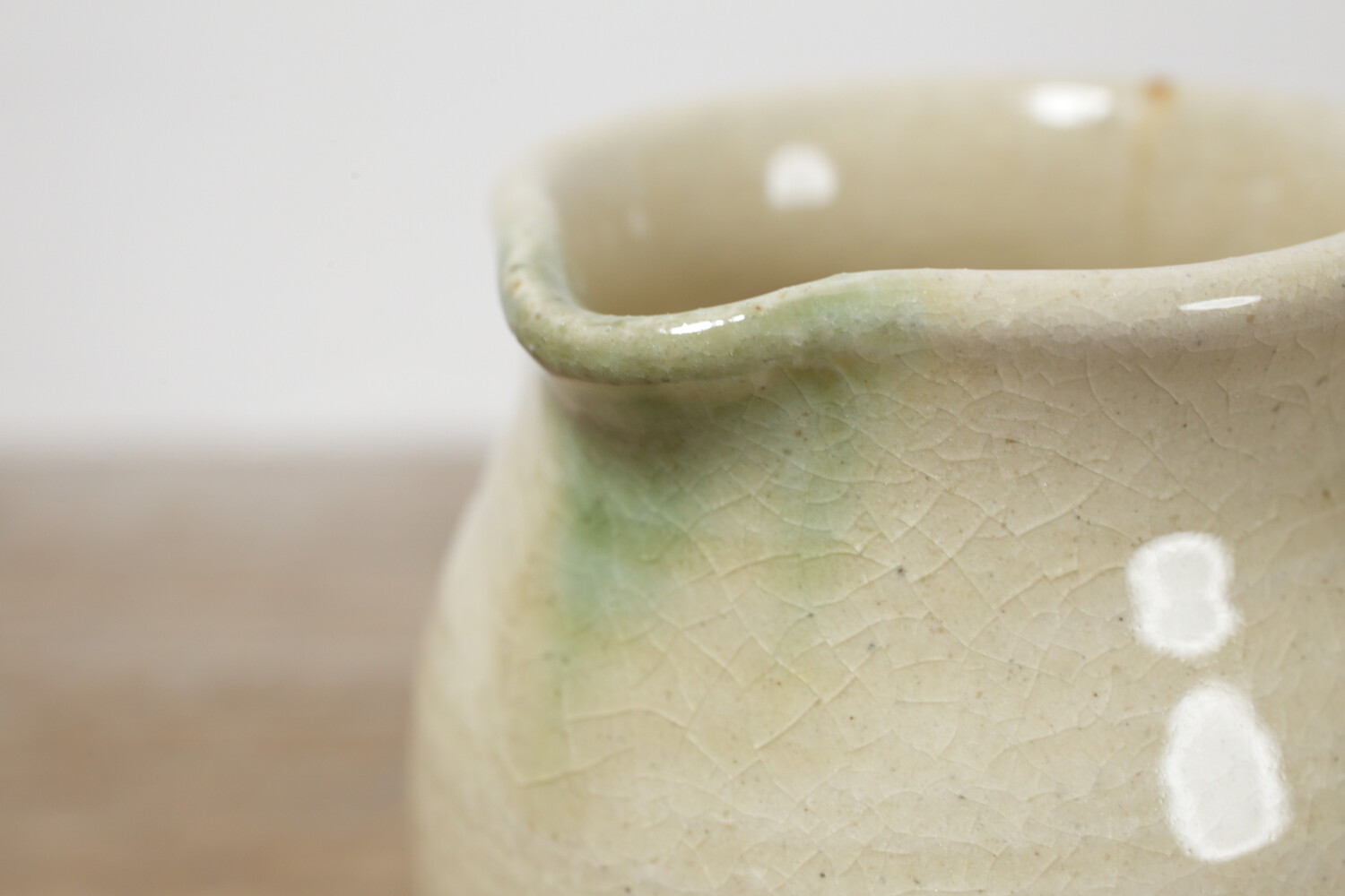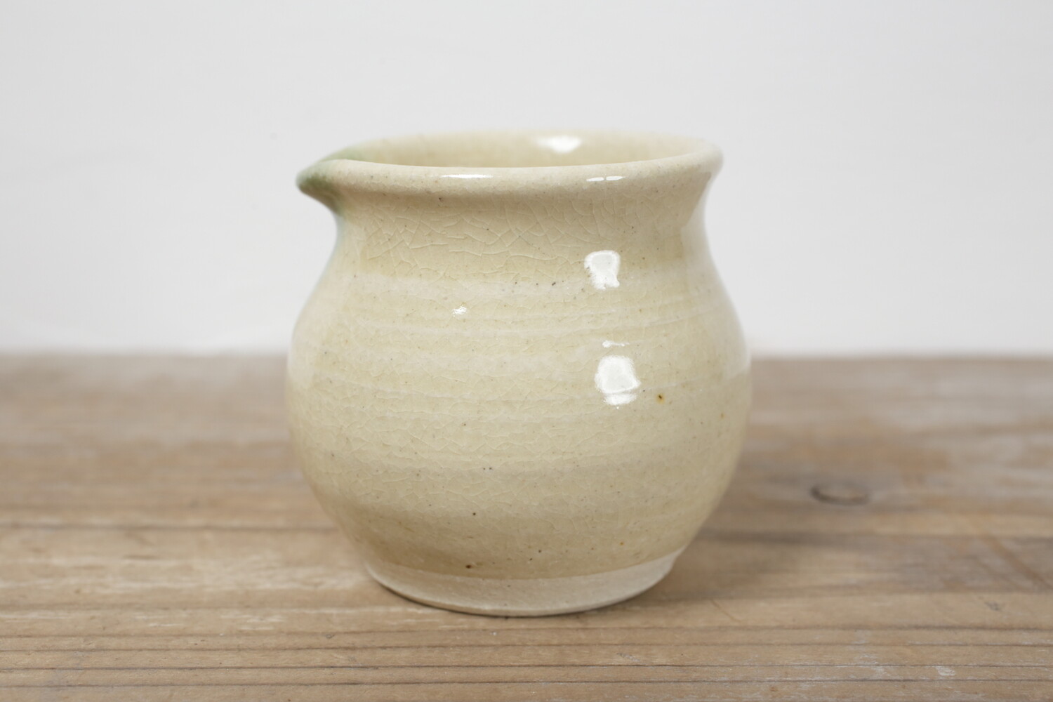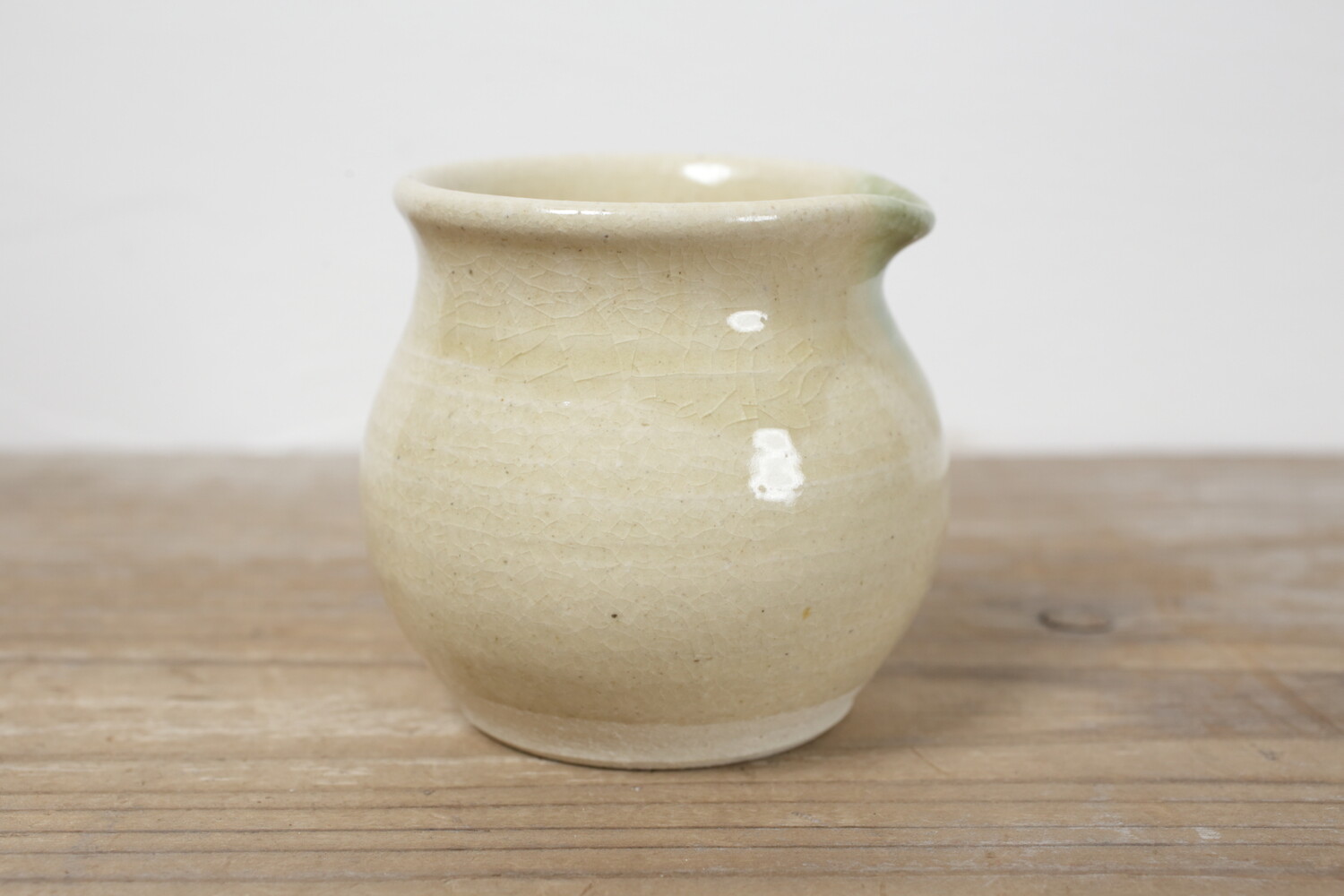 ころんとした丸みが可愛らしい瀬戸本業窯の片口。瀬戸の白土にほんのりと口元に掛かった緑釉が軽やかなアクセントになっています。