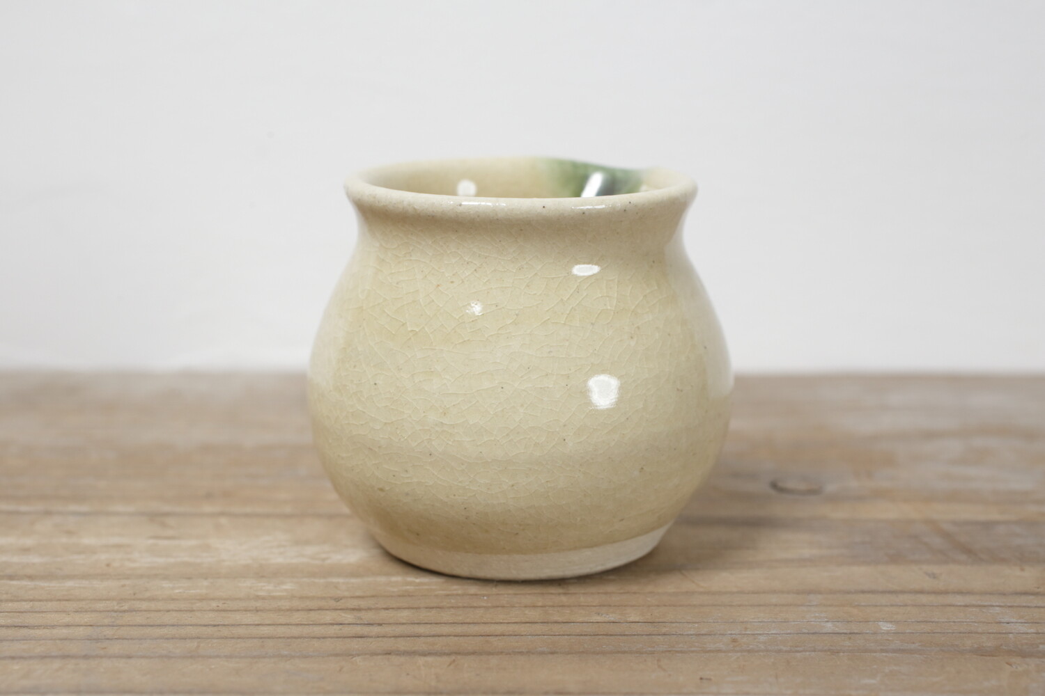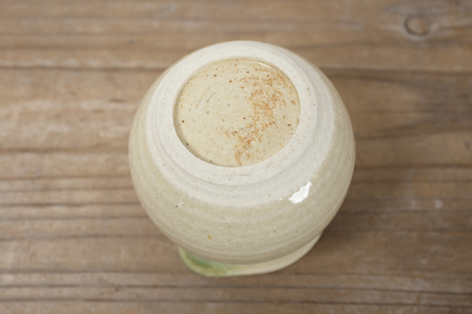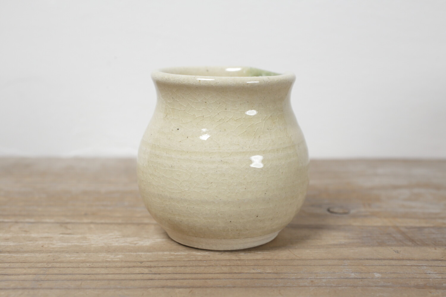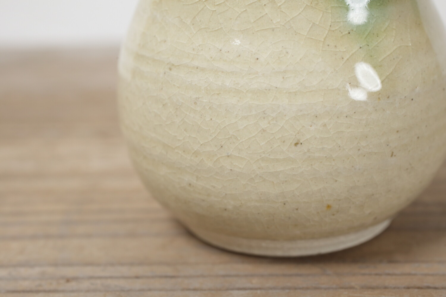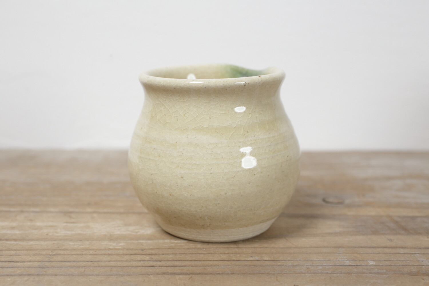 ころんとした丸みが可愛らしい瀬戸本業窯の片口。瀬戸の白土にほんのりと口元に掛かった緑釉が軽やかなアクセントになっています。