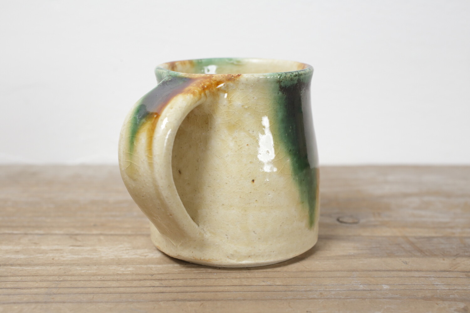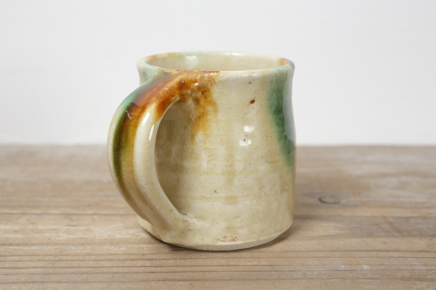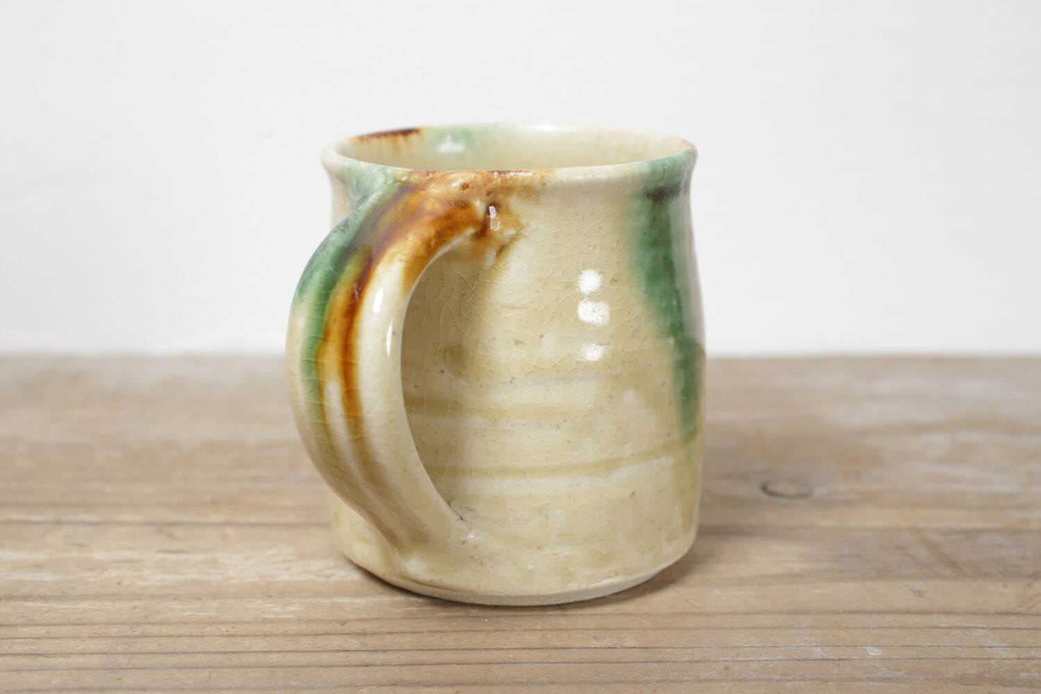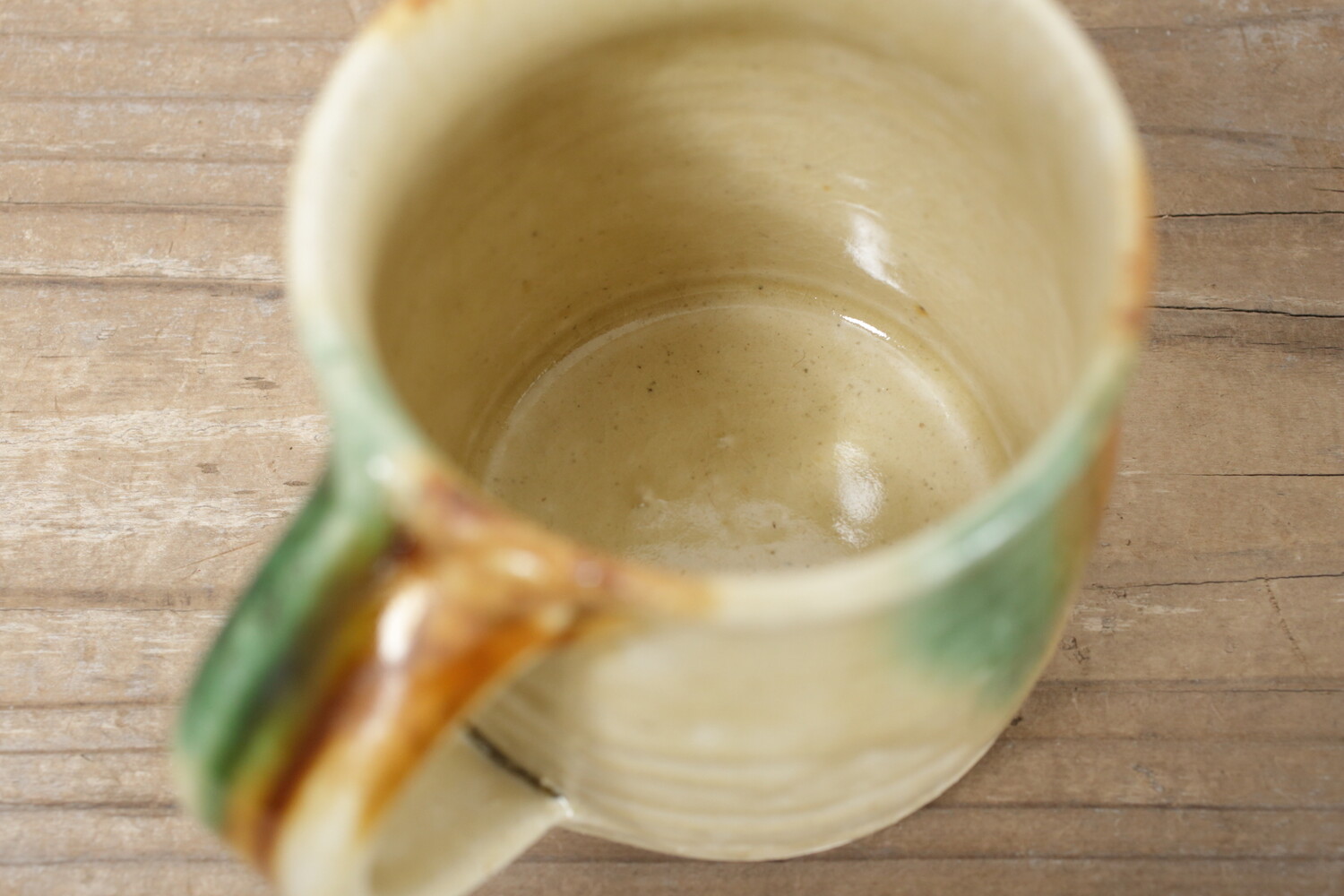 高麗茶碗の代表的な伊羅保(いらぼ)茶碗に使われる釉薬(ゆうやく)で、土灰釉の一種を指す伊羅保釉を掛けた後に、飴釉と緑釉の二彩を掛けたマグカップ。高さ8cmほどと現代のマグカップサイズですので、朝からたっぷりとコーヒー等を頂けます。