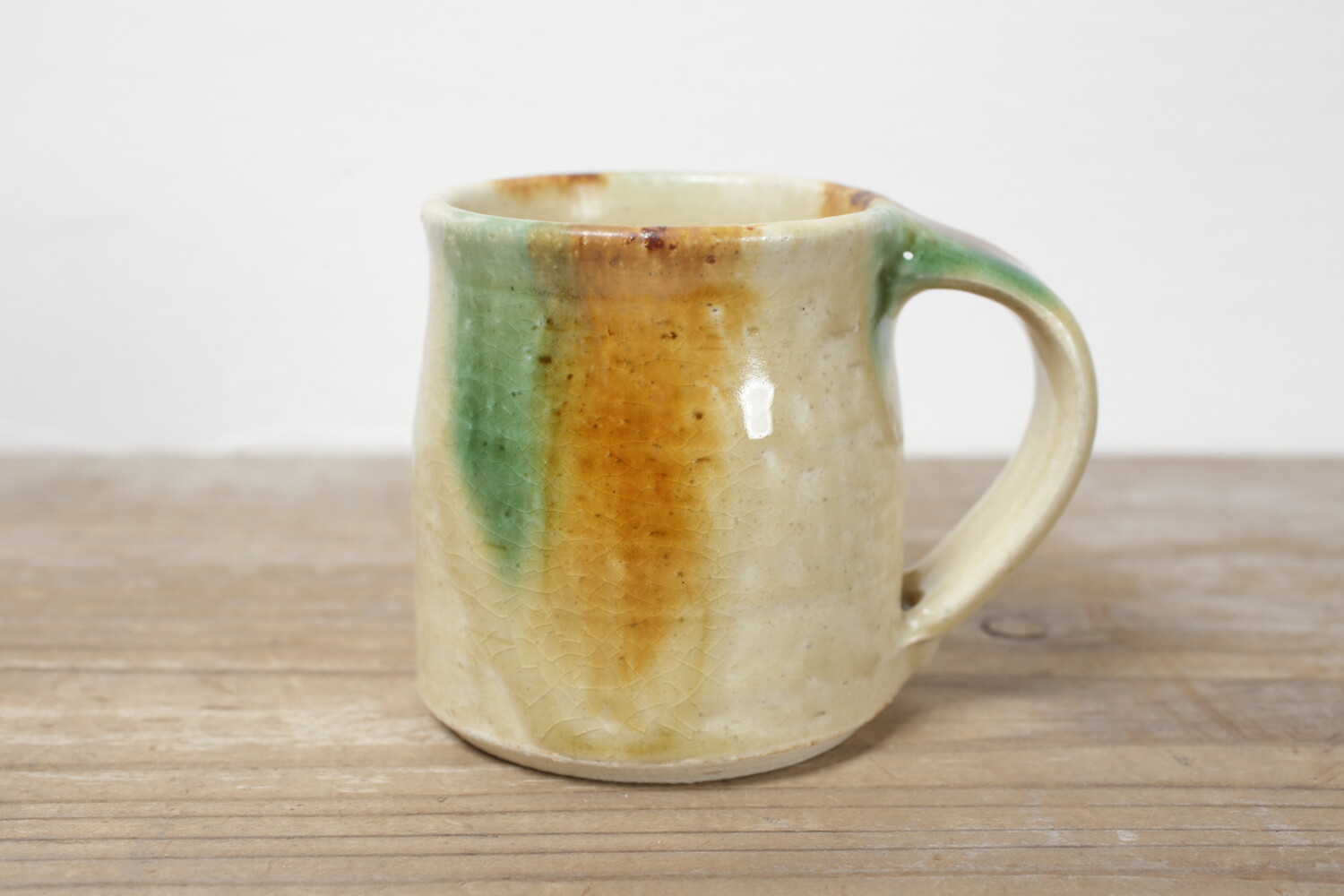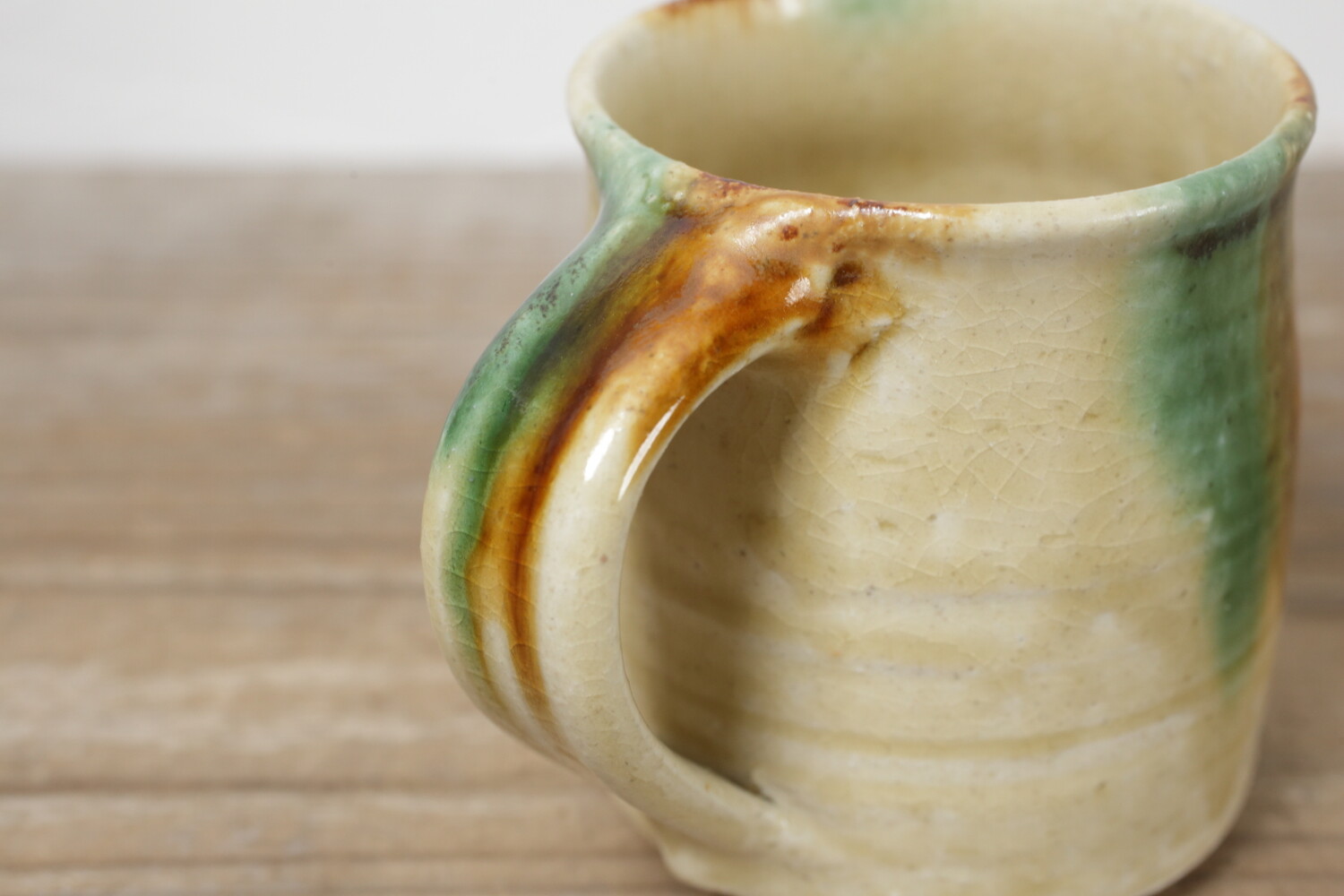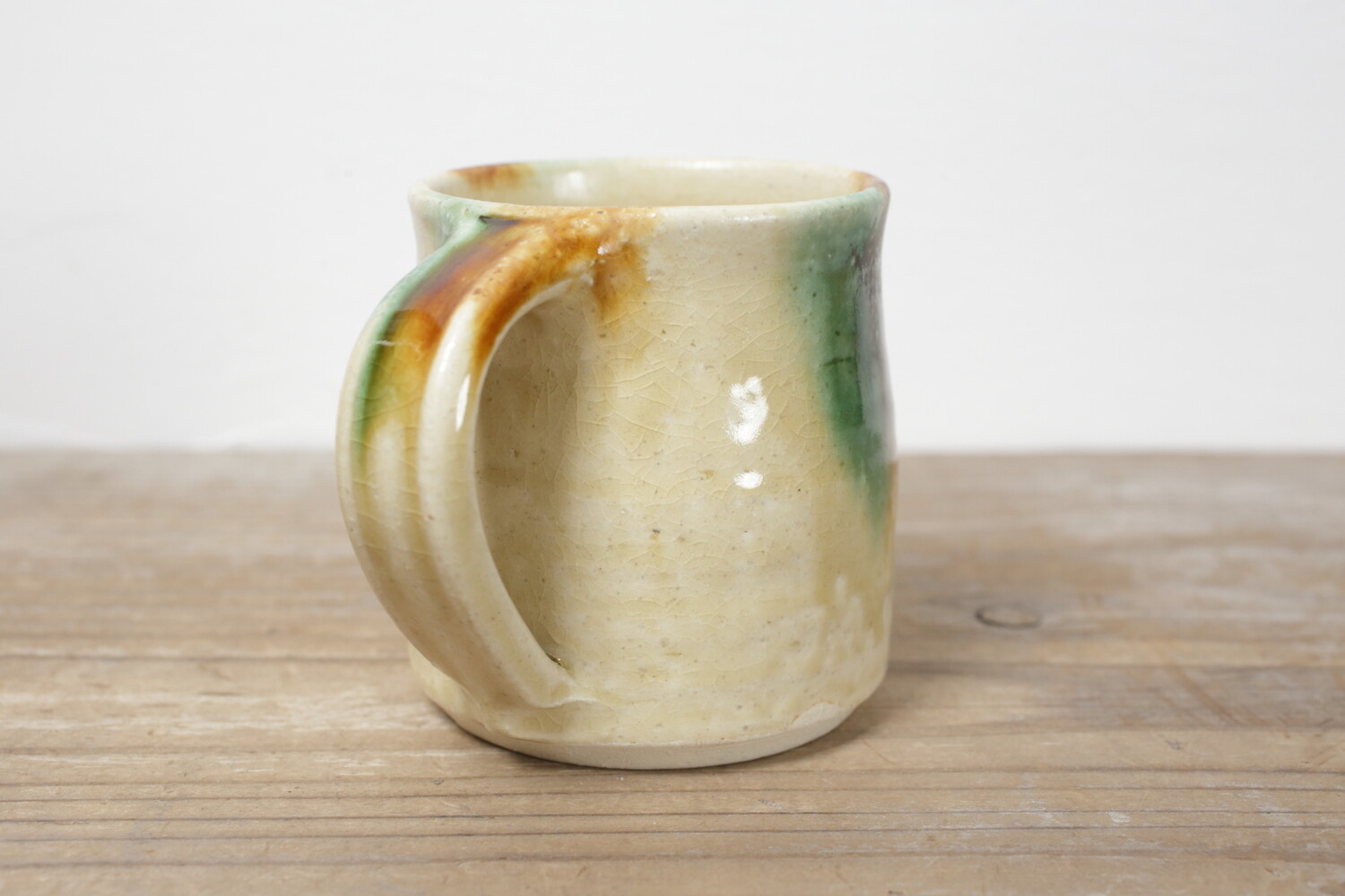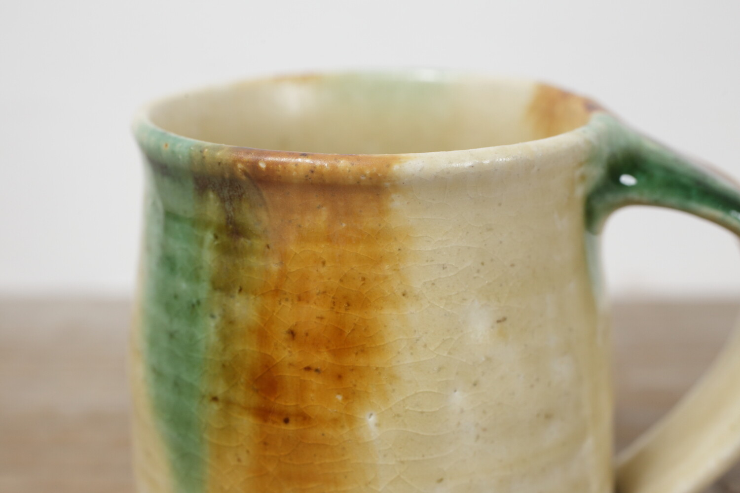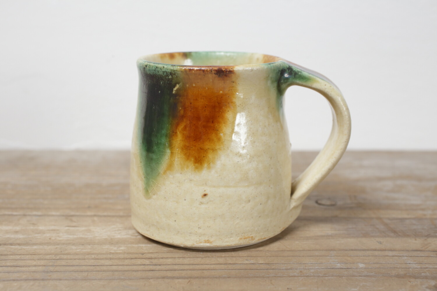 高麗茶碗の代表的な伊羅保(いらぼ)茶碗に使われる釉薬(ゆうやく)で、土灰釉の一種を指す伊羅保釉を掛けた後に、飴釉と緑釉の二彩を掛けたマグカップ。高さ8cmほどと現代のマグカップサイズですので、朝からたっぷりとコーヒー等を頂けます。