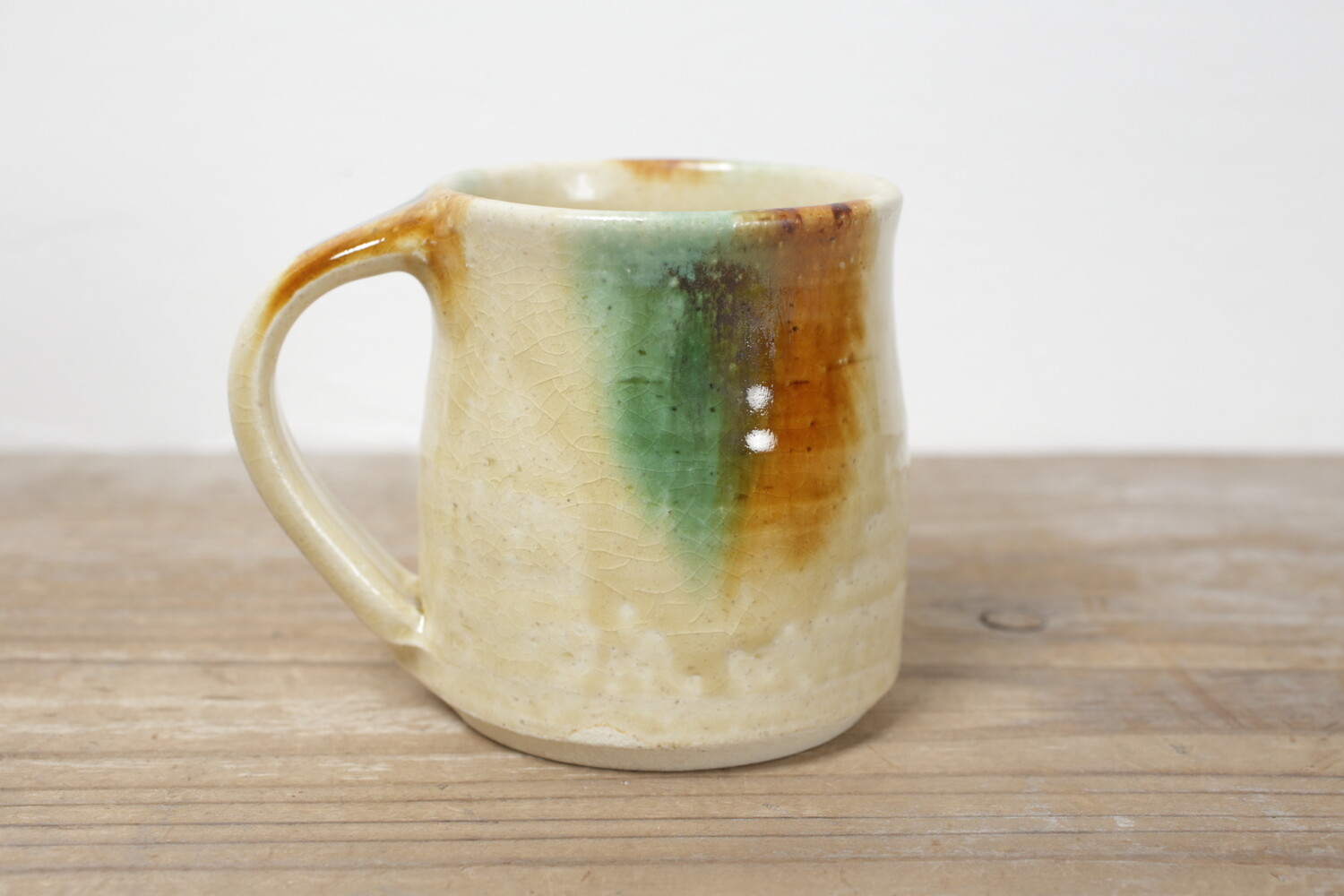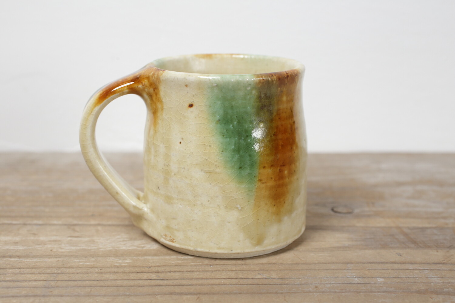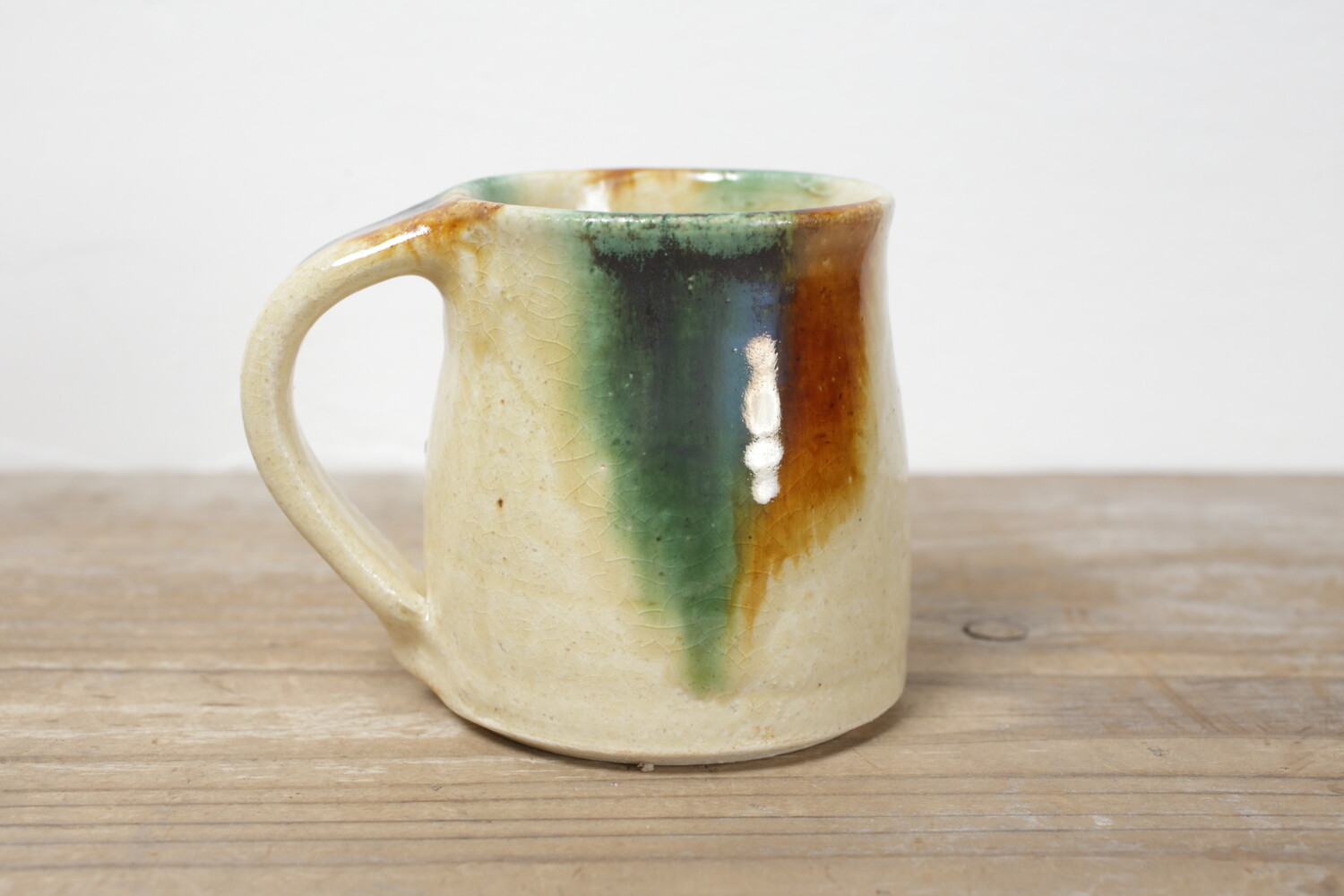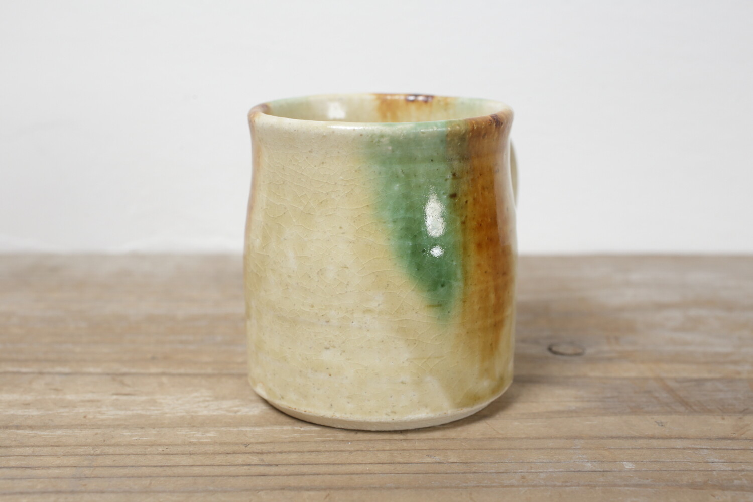 高麗茶碗の代表的な伊羅保(いらぼ)茶碗に使われる釉薬(ゆうやく)で、土灰釉の一種を指す伊羅保釉を掛けた後に、飴釉と緑釉の二彩を掛けたマグカップ。高さ8cmほどと現代のマグカップサイズですので、朝からたっぷりとコーヒー等を頂けます。
