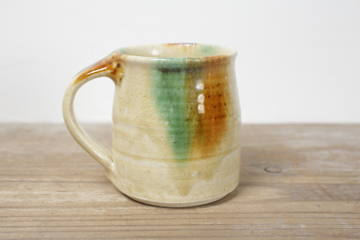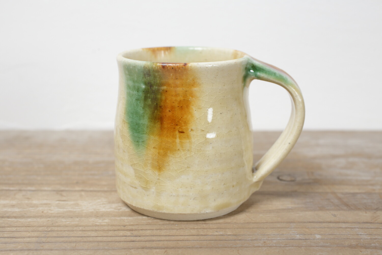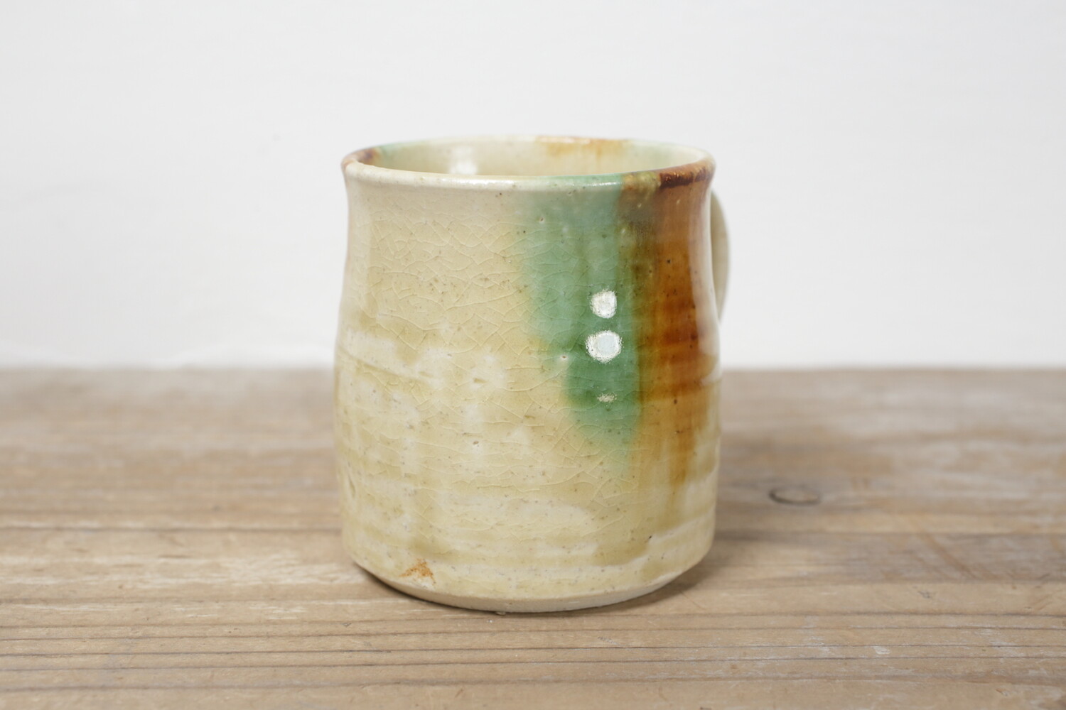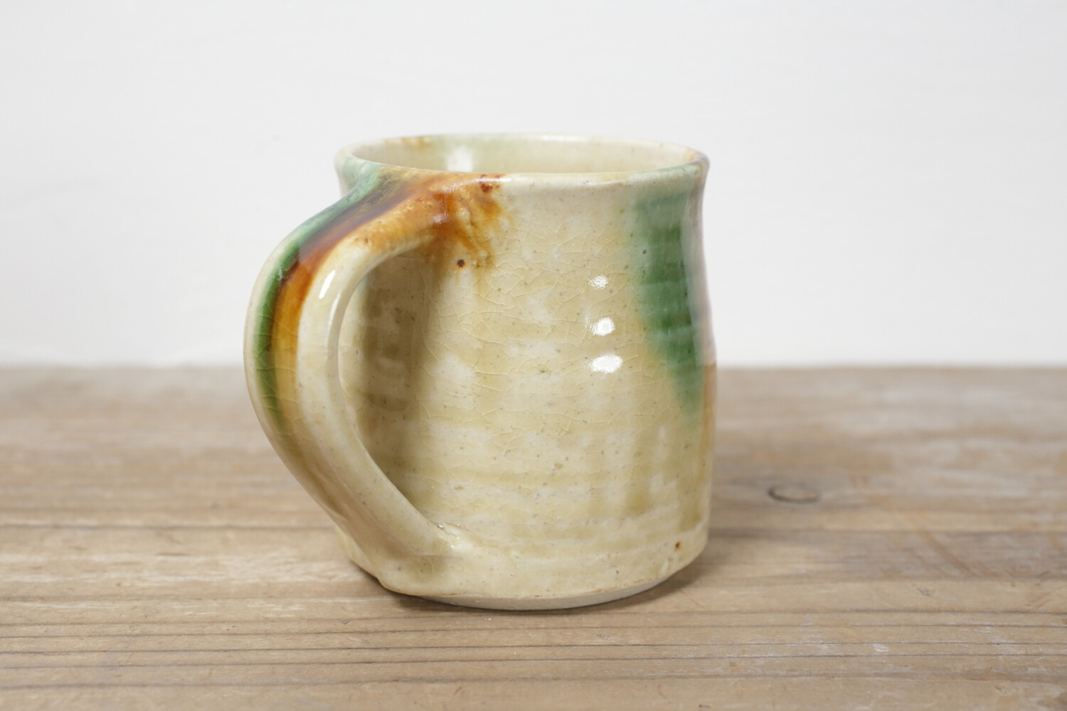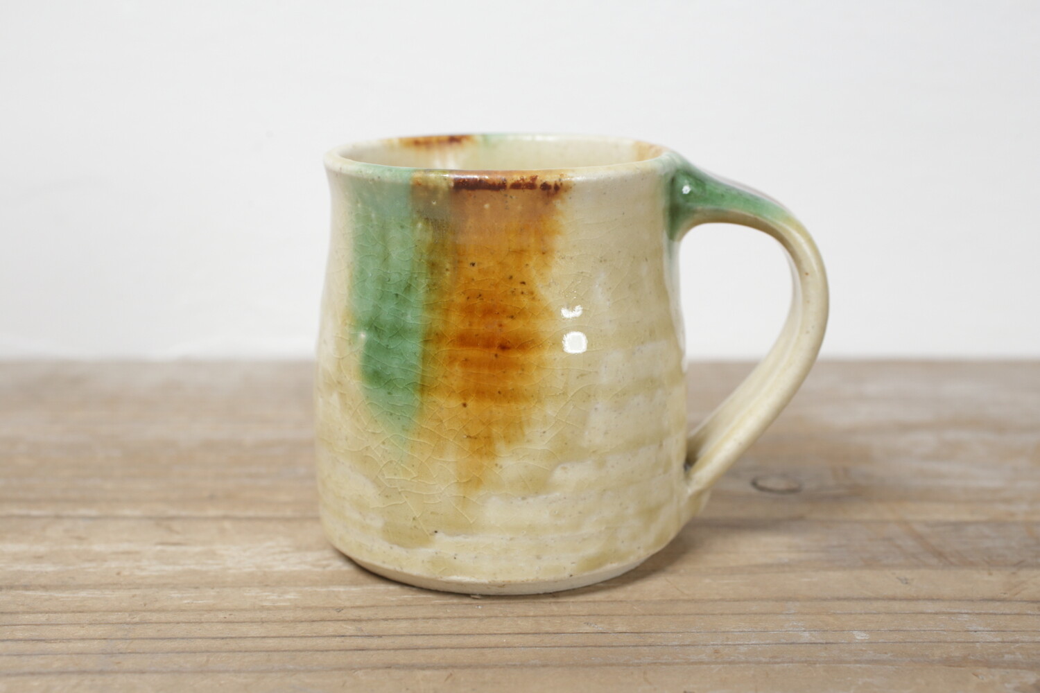 高麗茶碗の代表的な伊羅保(いらぼ)茶碗に使われる釉薬(ゆうやく)で、土灰釉の一種を指す伊羅保釉を掛けた後に、飴釉と緑釉の二彩を掛けたマグカップ。高さ8cmほどと現代のマグカップサイズですので、朝からたっぷりとコーヒー等を頂けます。