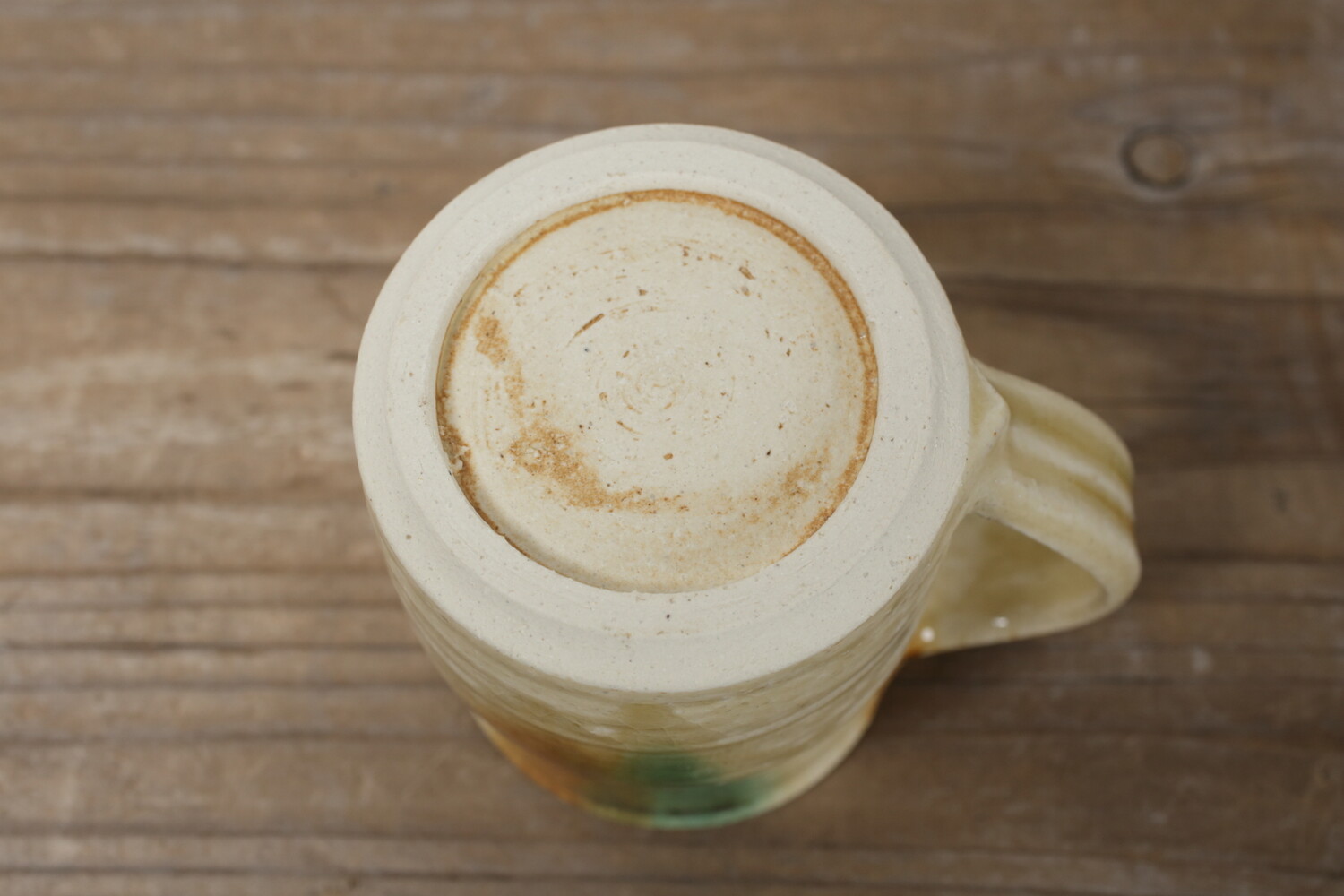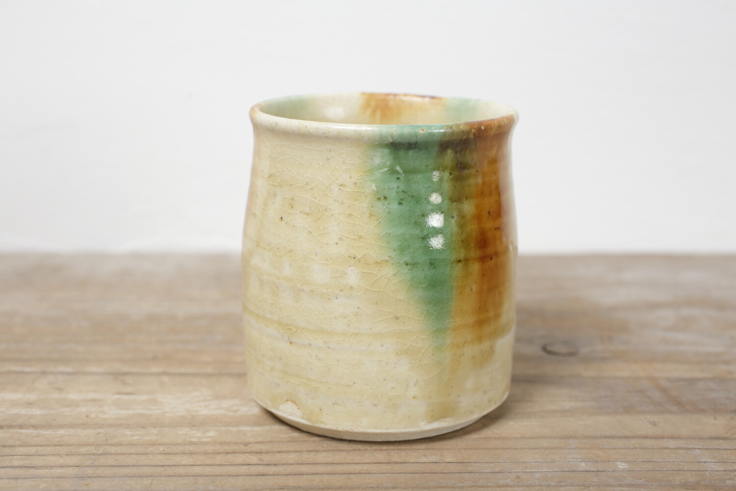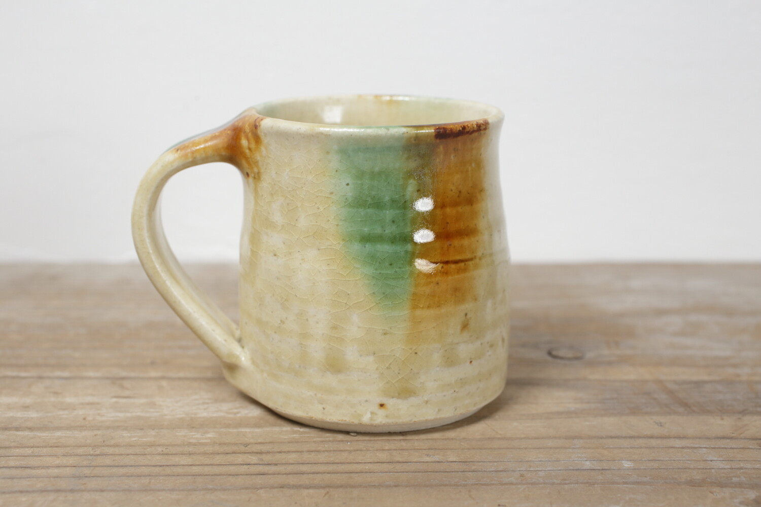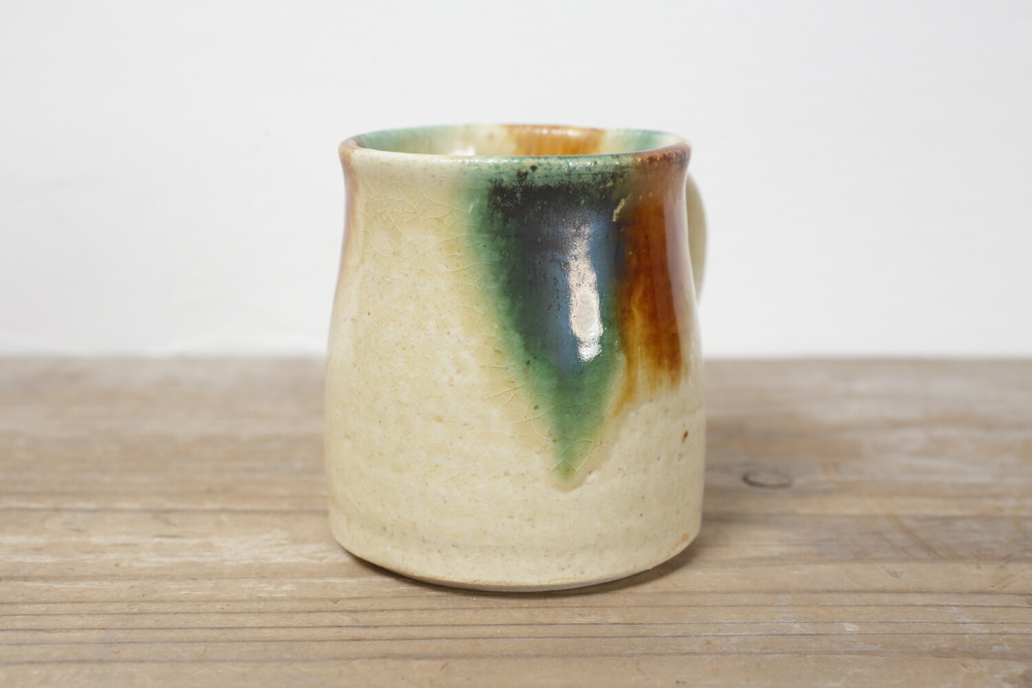 高麗茶碗の代表的な伊羅保(いらぼ)茶碗に使われる釉薬(ゆうやく)で、土灰釉の一種を指す伊羅保釉を掛けた後に、飴釉と緑釉の二彩を掛けたマグカップ。高さ8cmほどと現代のマグカップサイズですので、朝からたっぷりとコーヒー等を頂けます。