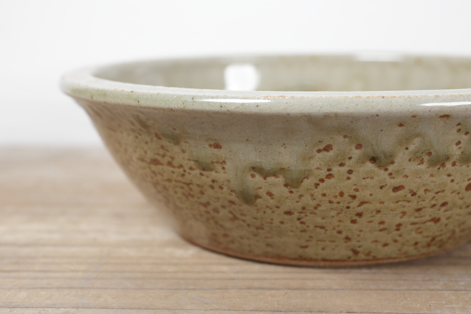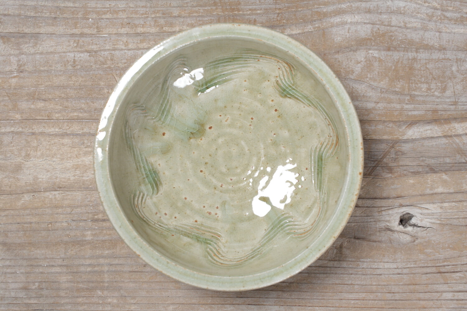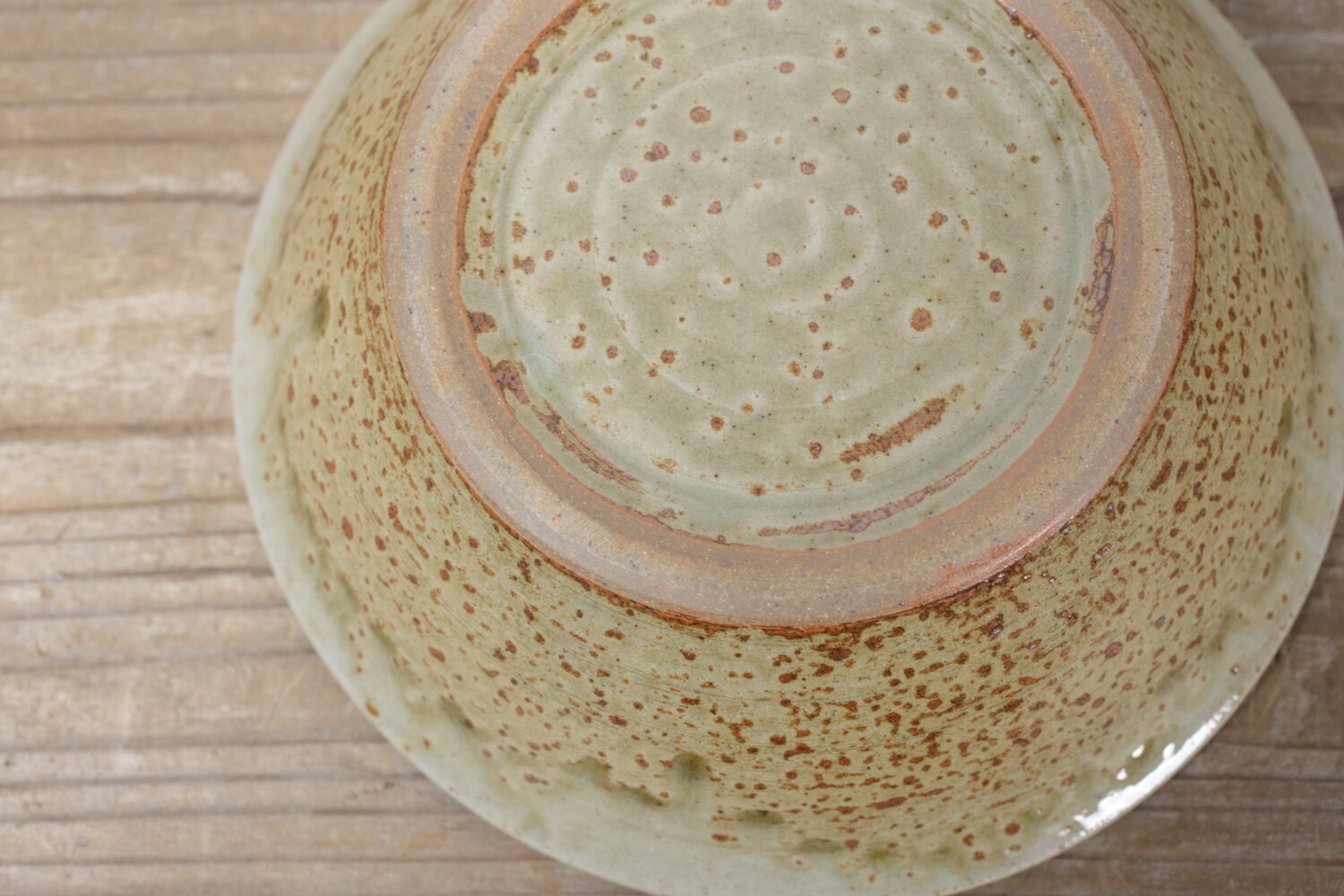 直径19.5cmほどの大きさにころんと厚みのある造形の6.5寸鉢。ご家族のおかずにいいサイズ感です。陶土は地元島根のものを使い松灰に長石などを合わせることで、緑みのある食材とも合わせやすい落ち着いた色味に仕上がっています。