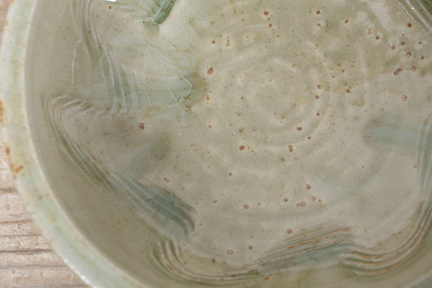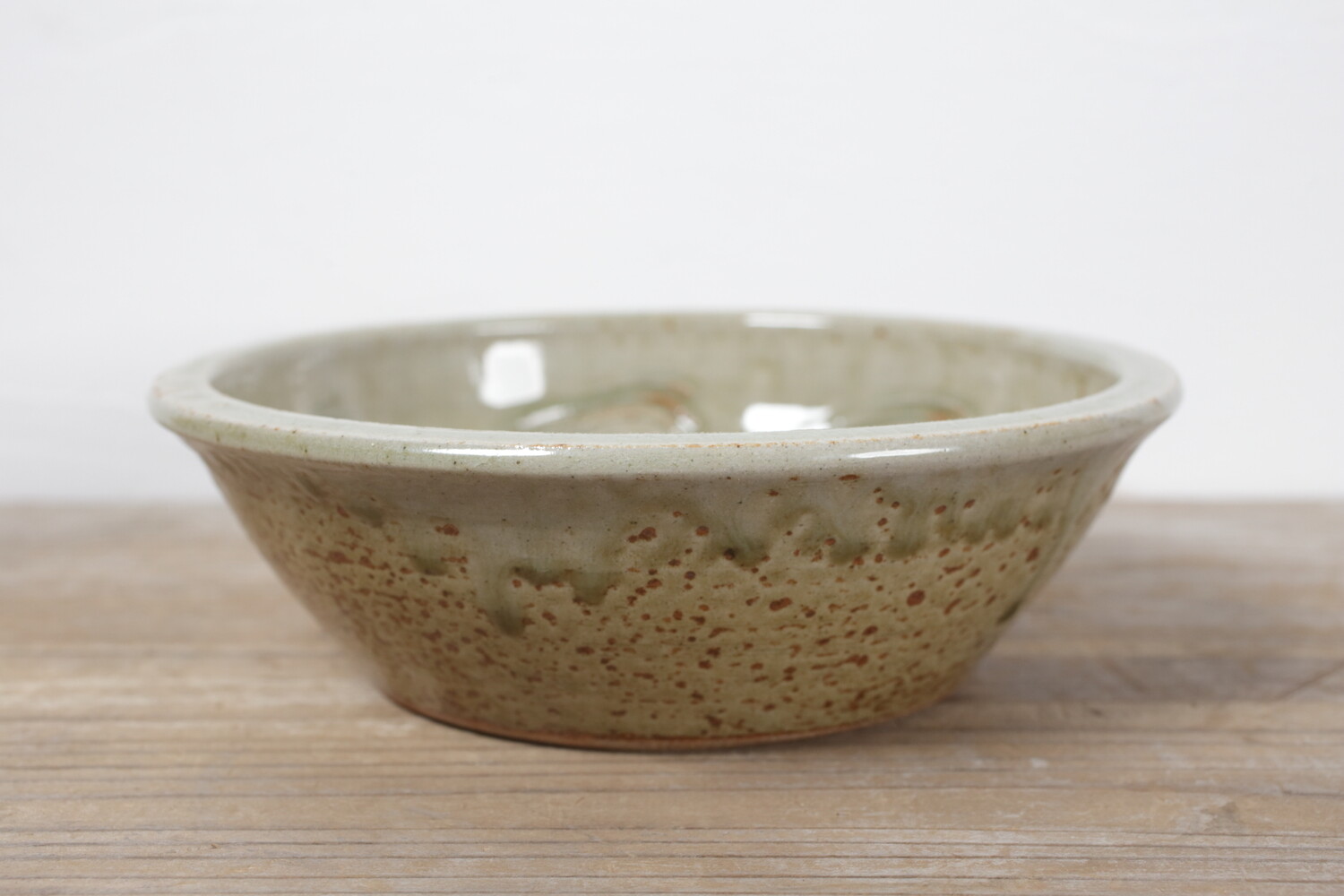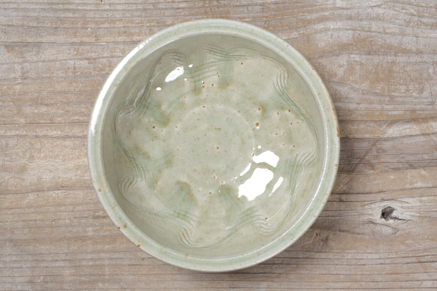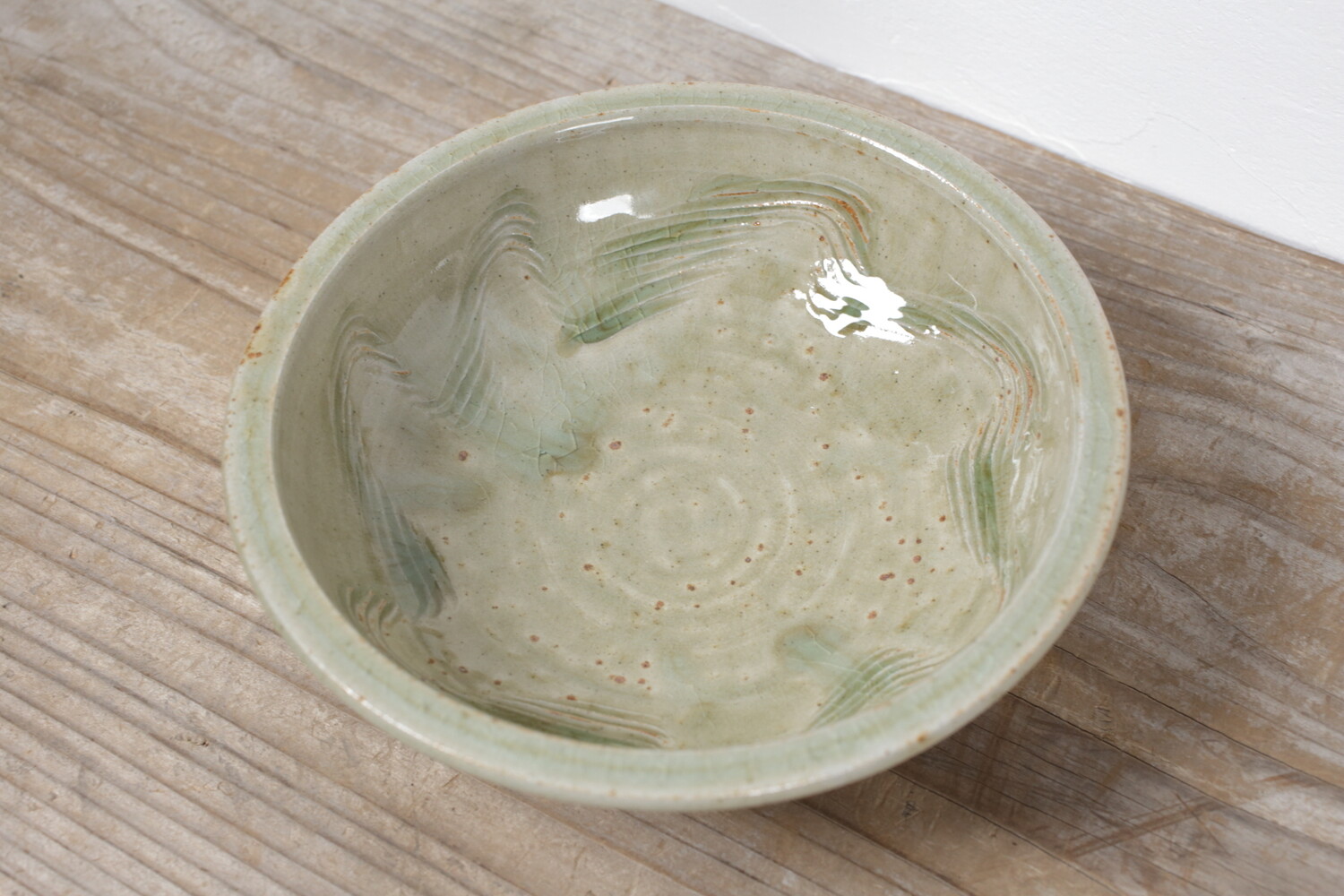 直径19.5cmほどの大きさにころんと厚みのある造形の6.5寸鉢。ご家族のおかずにいいサイズ感です。陶土は地元島根のものを使い松灰に長石などを合わせることで、緑みのある食材とも合わせやすい落ち着いた色味に仕上がっています。