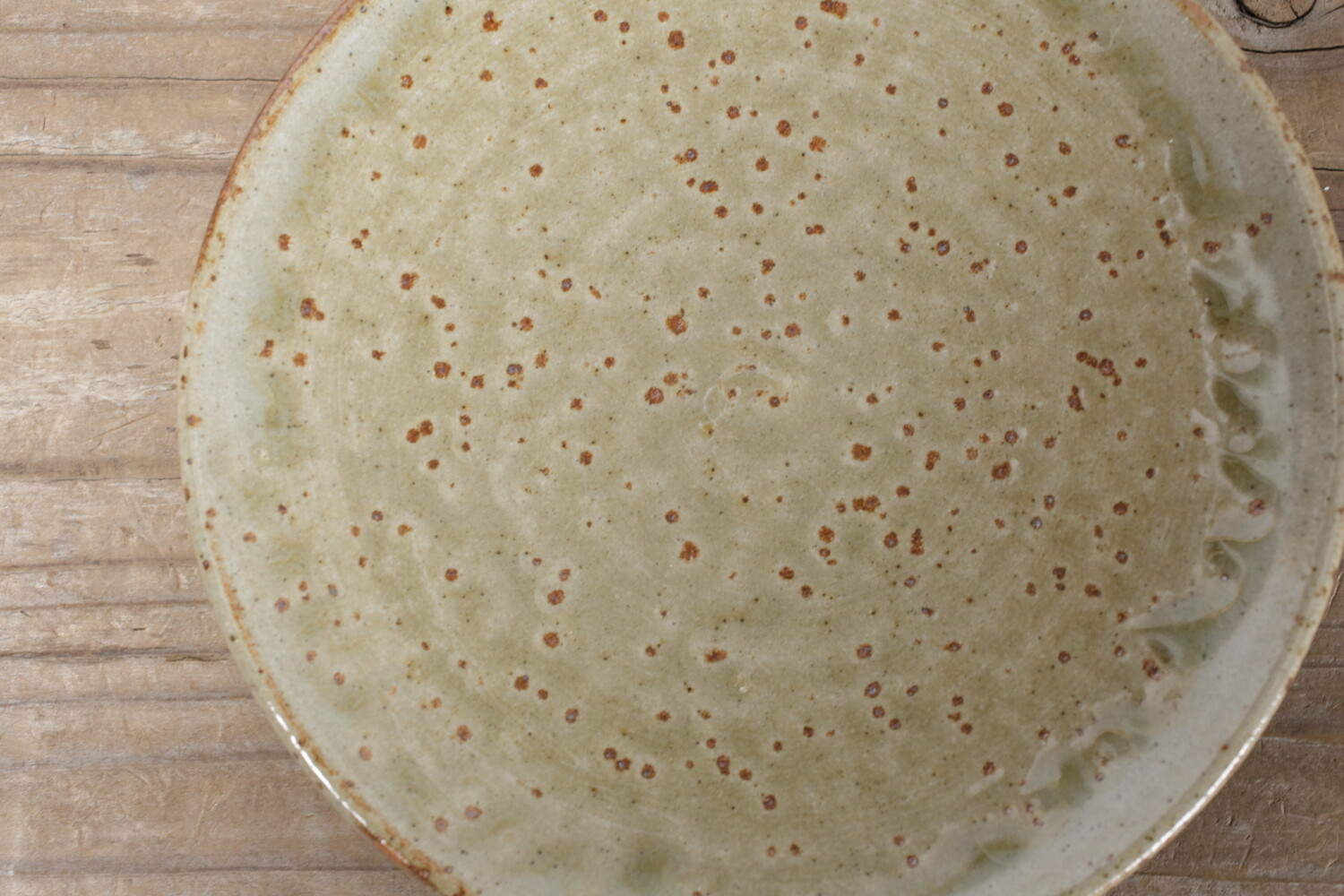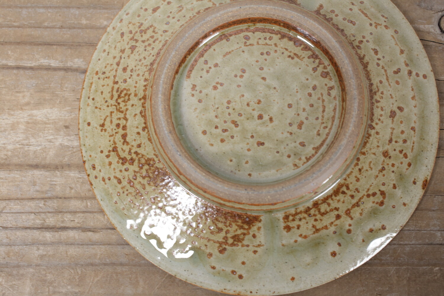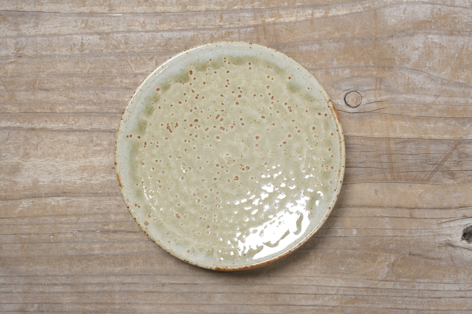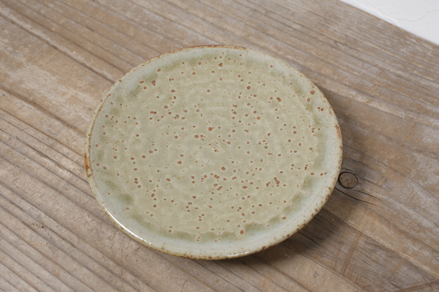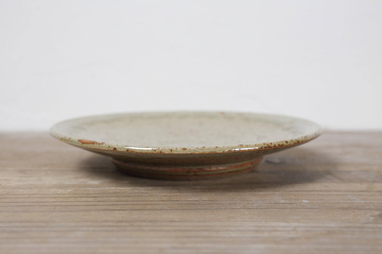 灰釉の美しい上がり具合に、厚みを持たせずにすっきりとした轆轤(ろくろ)による造形の組み合わせは、現代の居住空間に合うようにと考えられています。陶土は地元島根のものを使い松灰に長石などを合わせることで、緑みのある落ち着いた灰釉に仕上がっています。平皿ですので、取り皿としてはもちろん小ぶりのケーキ皿、お菓子皿としてもいいでしょう。