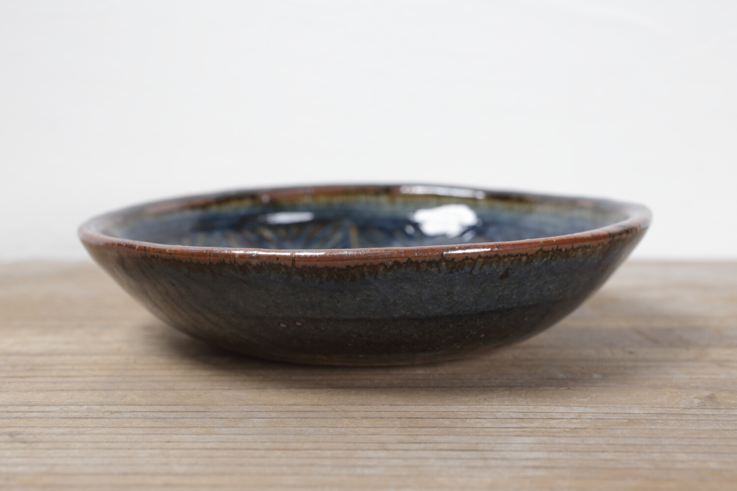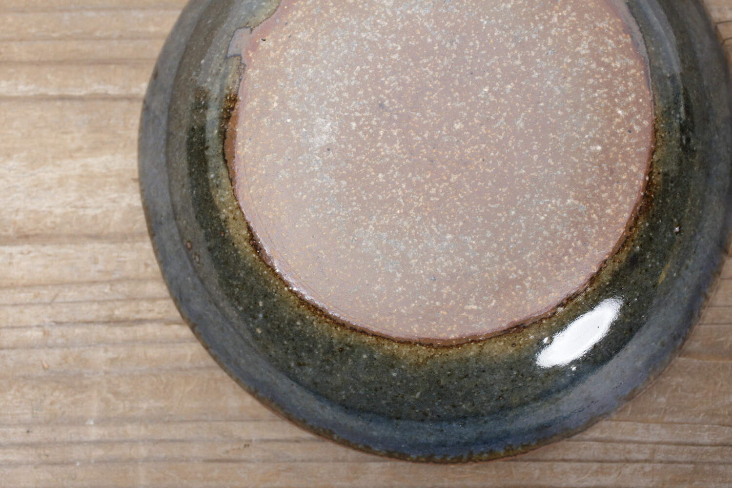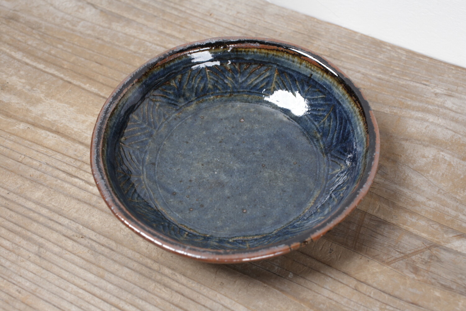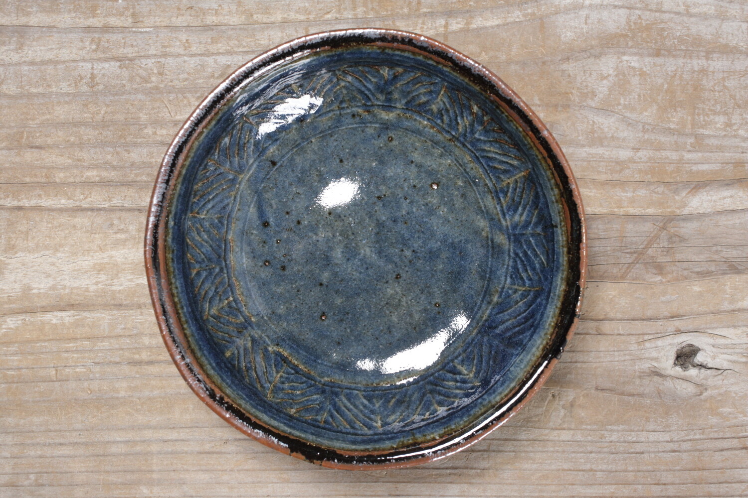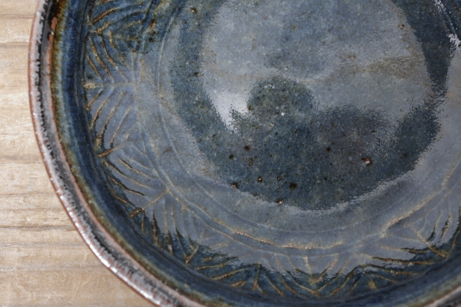 直径18.5cmほどの中鉢のふちに網代の押紋が施された6寸鉢。副菜のおかずの盛り鉢として、また果物や少しカレーやシチューを食べたいという時など、おでんやポトフなどもいいですね。あると重宝する大きさの中鉢です。緑みの中に青みが強く出た瑠璃釉は、色鮮やかな食材との組み合わせも美しいですし、同系色の茄子のお漬物なども美しいですね。