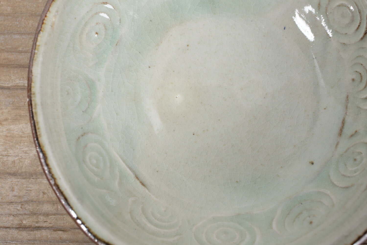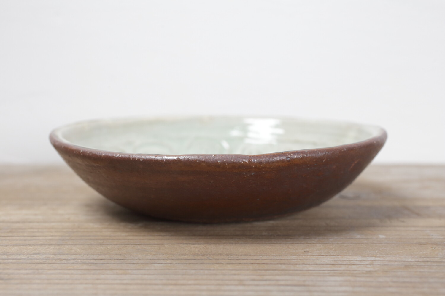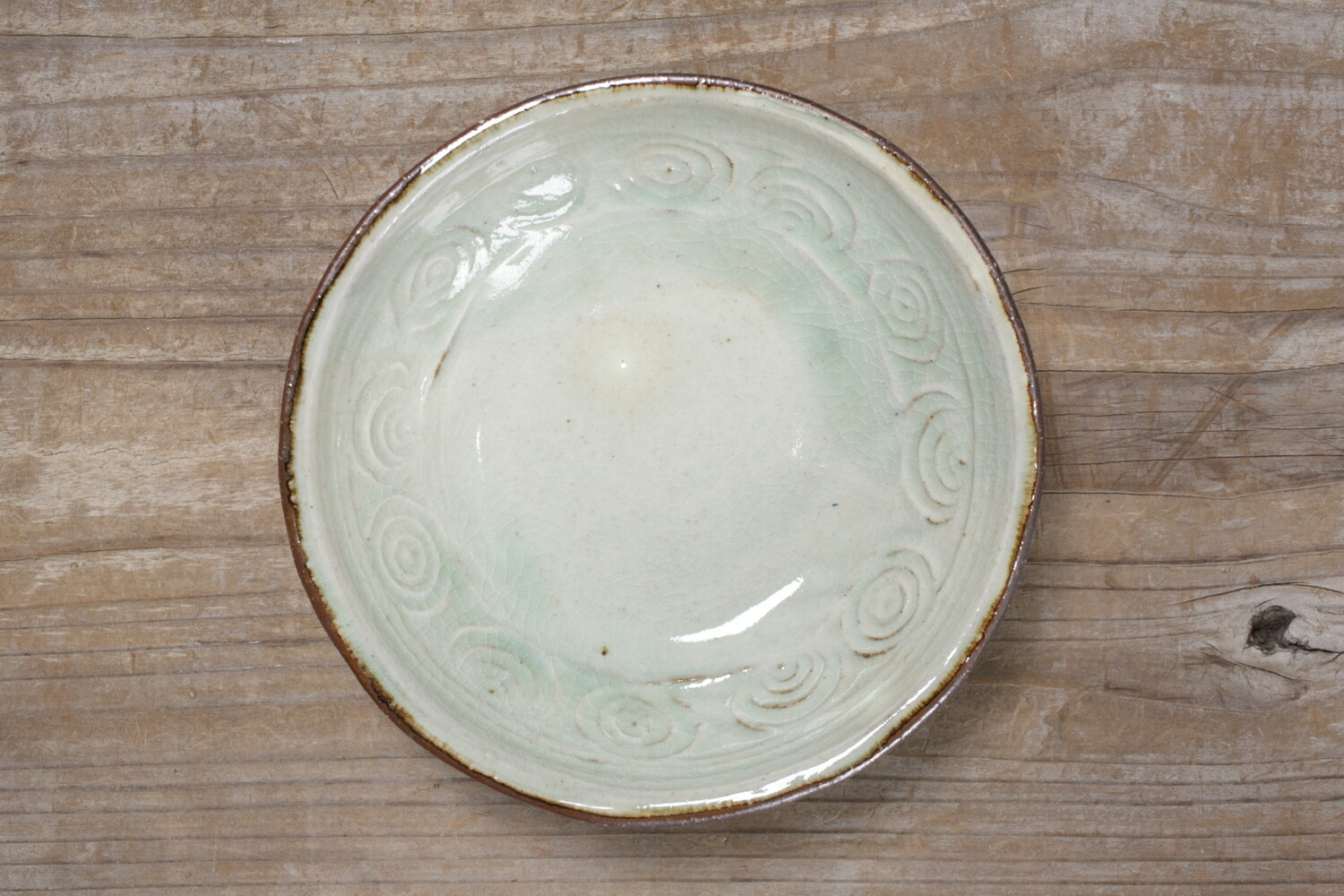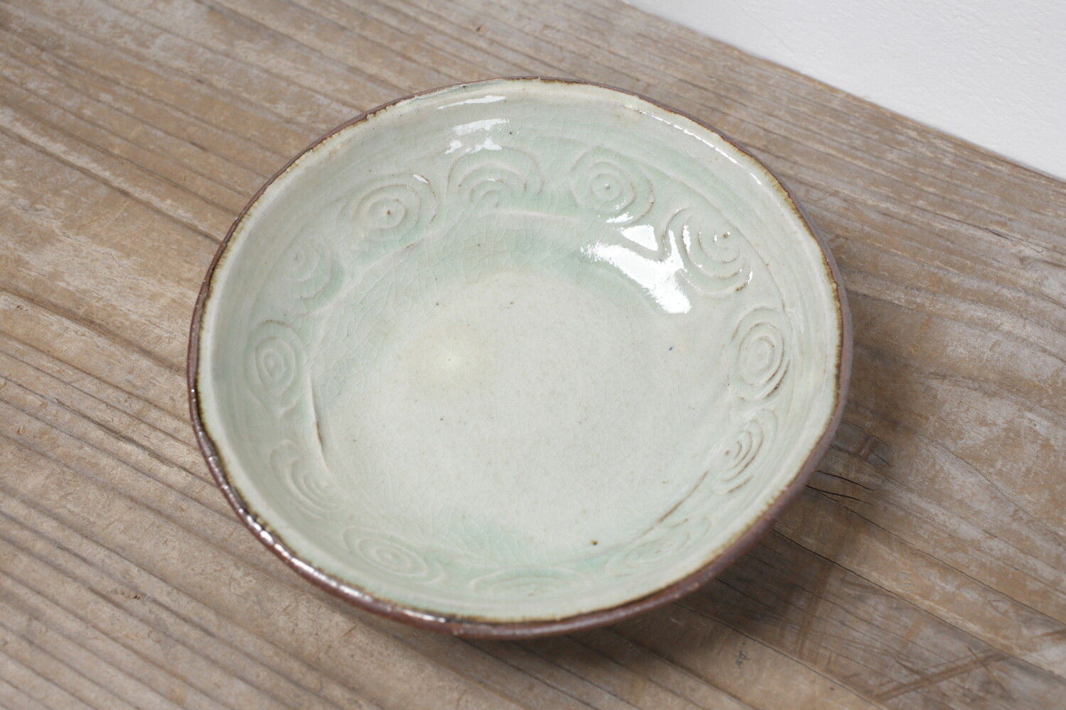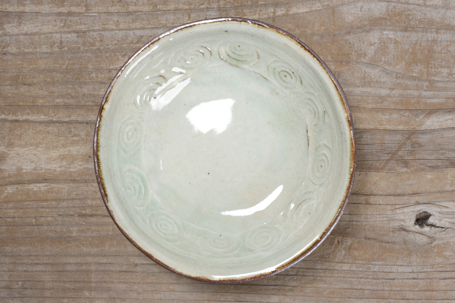 直径18cm弱ほどの型による形成の6寸鉢。縁には丸紋が型押しされています。森山窯の白は、真っ白ではなく白にうっすらと緑色が掛かった食器としてとても自然な色合いです。2〜3人分のおかずに、またお一人分のおでんやポトフ、シチューにもいいでしょう。同系色の食材でも、色鮮やかなコントラストのある食材を盛り付けてもいい白釉です。