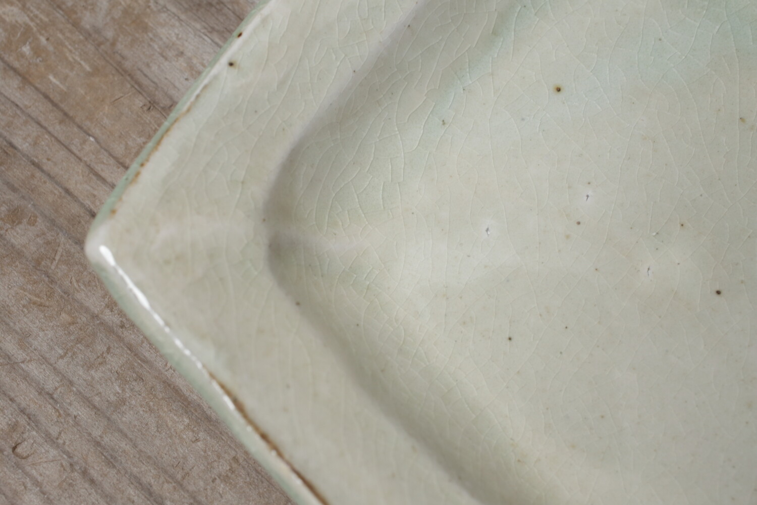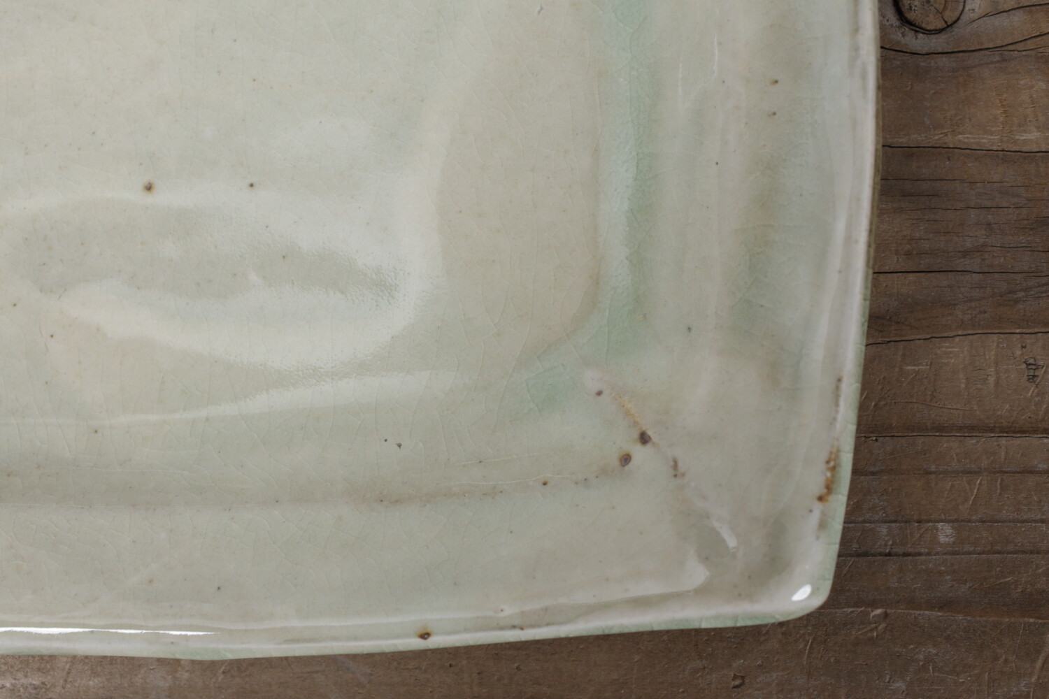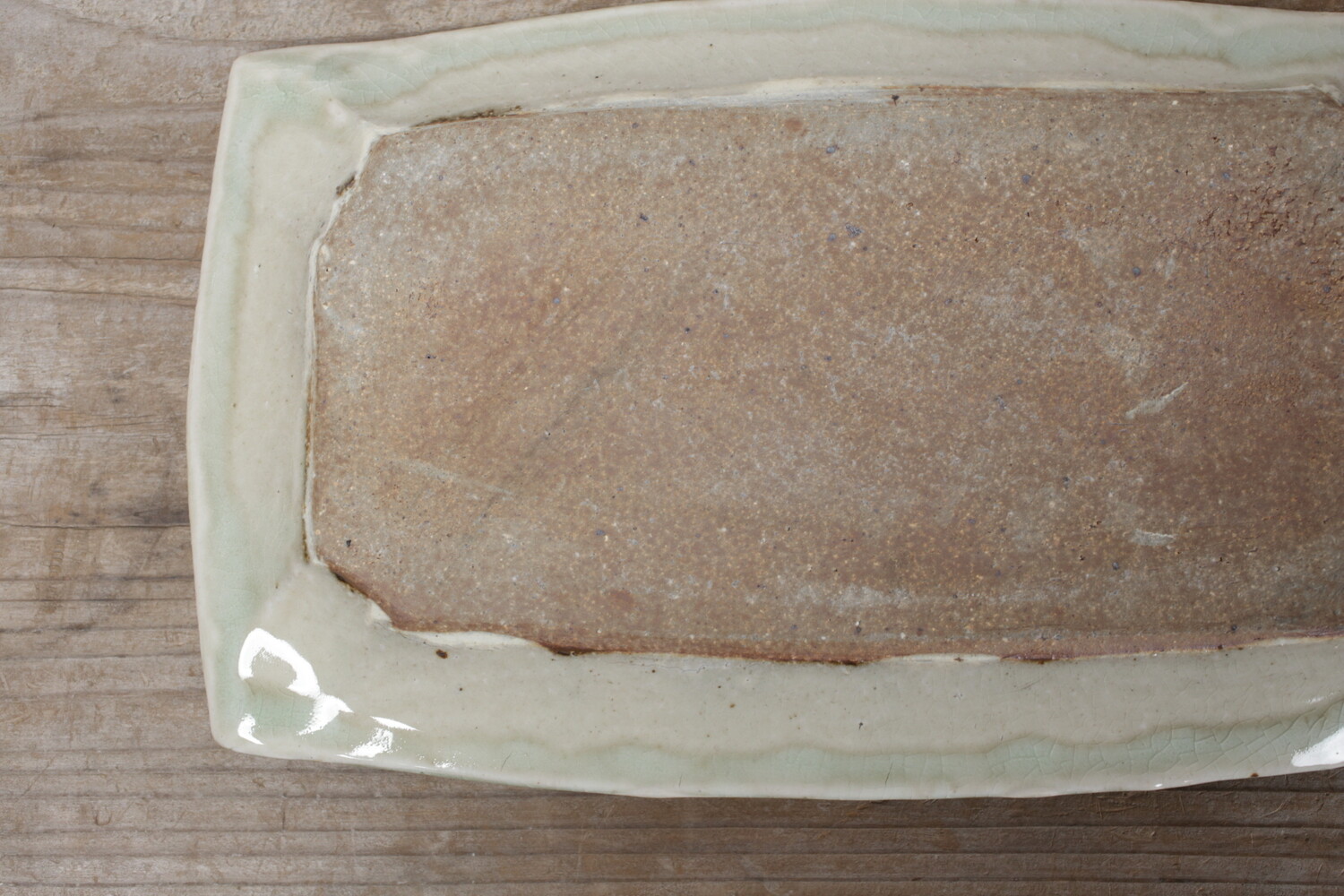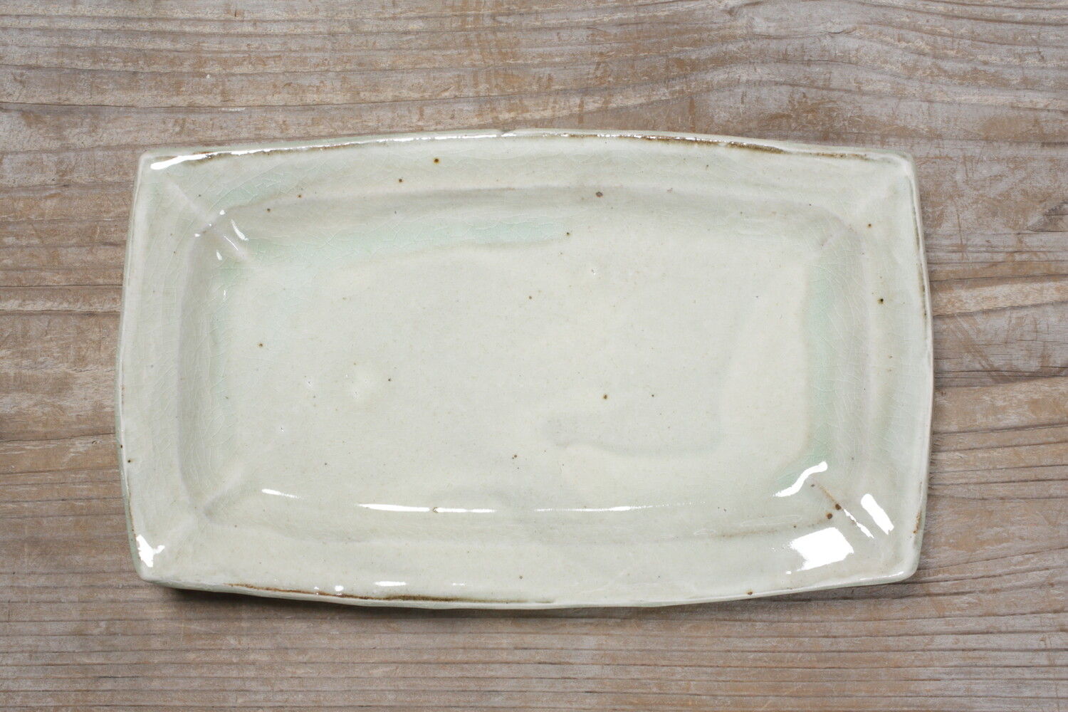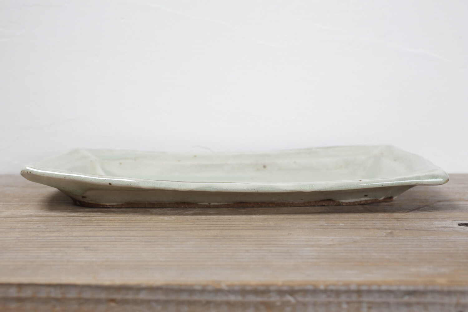 横幅31cmほど、縦幅28.5cmほどの特大長平皿。森山窯の白は、薄い緑青色の釉薬のたまりがあり自然な色合いの白ですので、白身魚などにもいいですね。ご家族のおかずの盛り皿として、またお刺身皿としてもいいでしょう。夏は切り揃えたメロンなどもいいですね。
