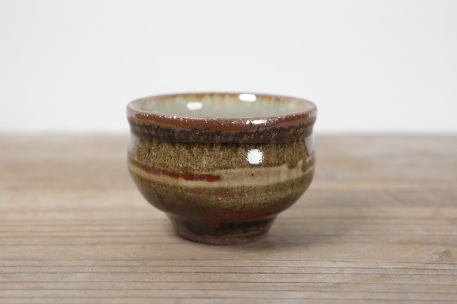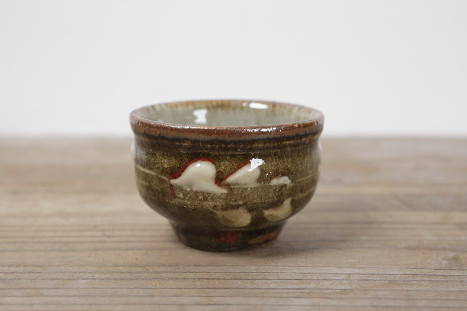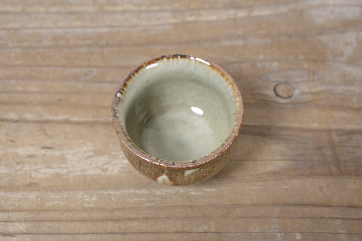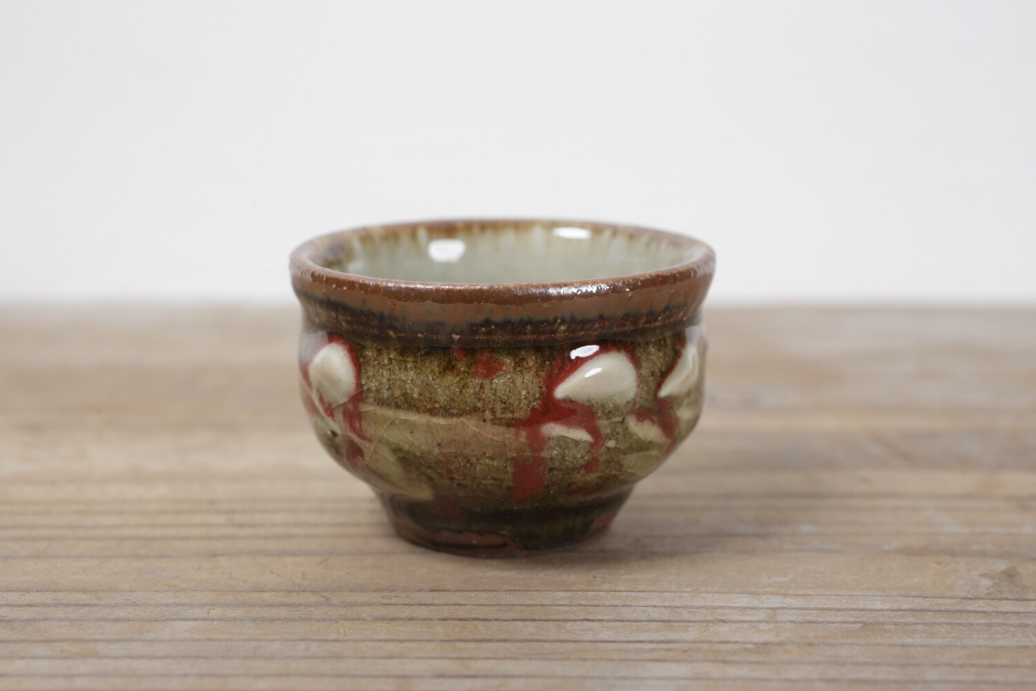 直径6.5cmほど、高さ4.5cmほどと小さ過ぎない大きさのぐい呑み。酸化銅が焼成の際の還元で赤く変化する辰砂釉に白のイッチンが何とも程よいアクセントとして描かれています。森山窯の定番ぐい呑みですが、毎度いいなと目にふと止まってしまうぐい呑みです。