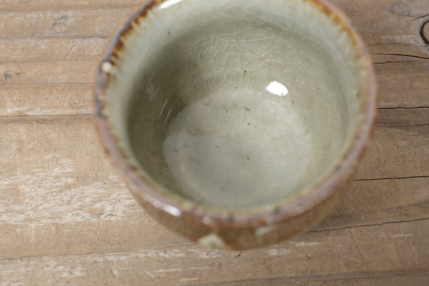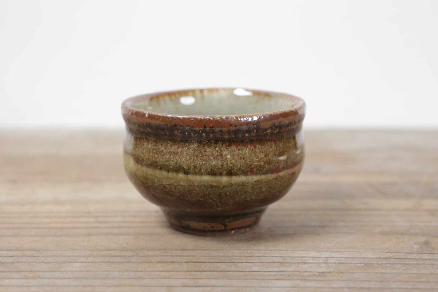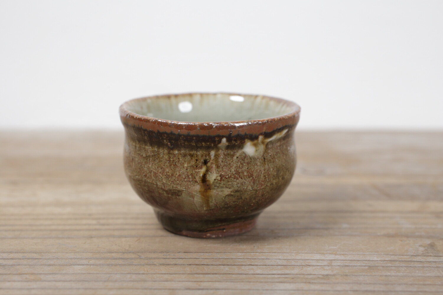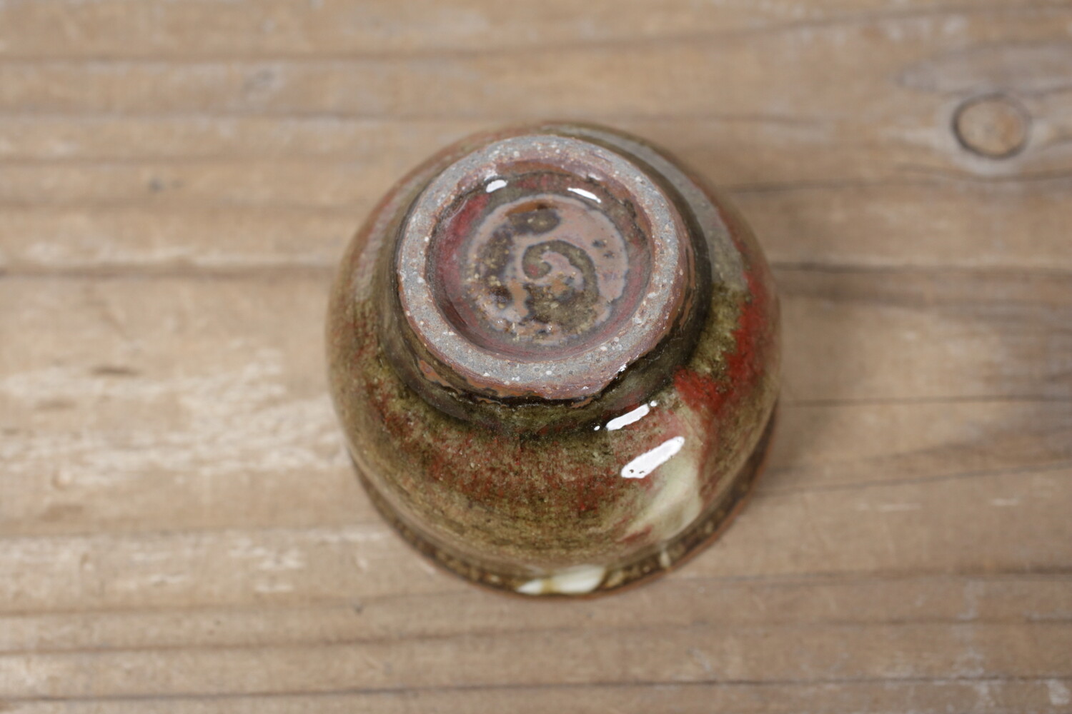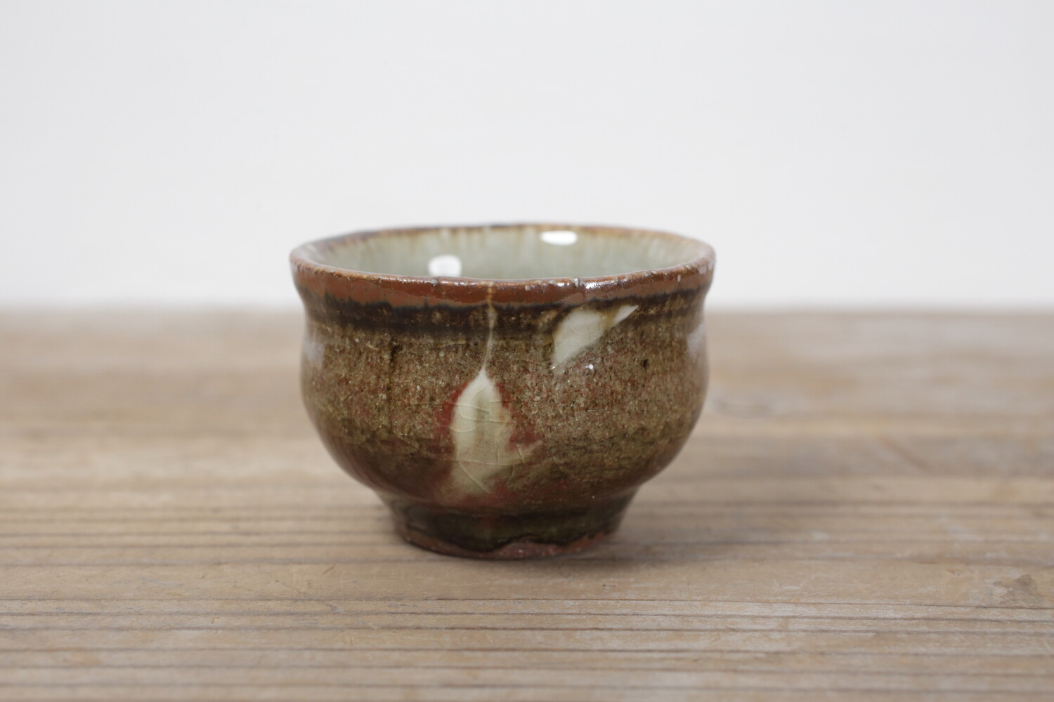 直径6.5cmほど、高さ4.5cmほどと小さ過ぎない大きさのぐい呑み。酸化銅が焼成の際の還元で赤く変化する辰砂釉に白のイッチンが何とも程よいアクセントとして描かれています。森山窯の定番ぐい呑みですが、毎度いいなと目にふと止まってしまうぐい呑みです。