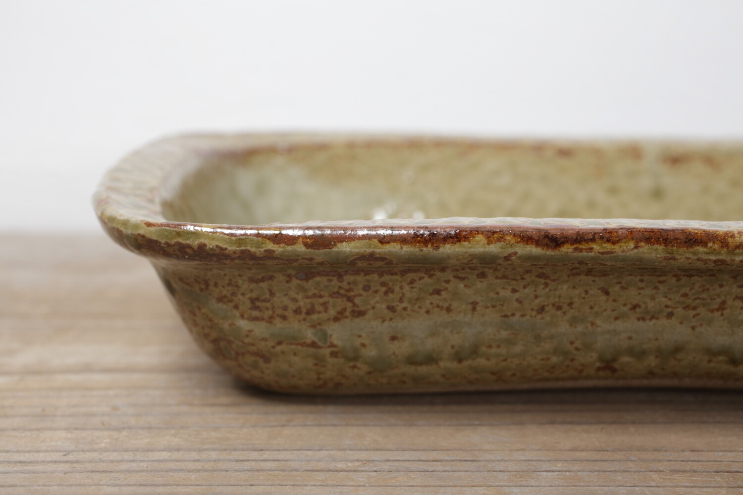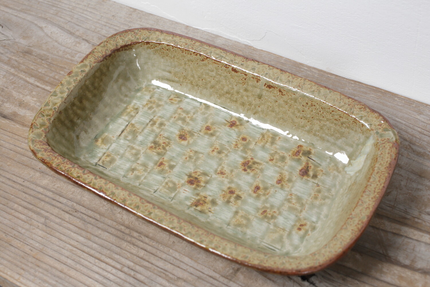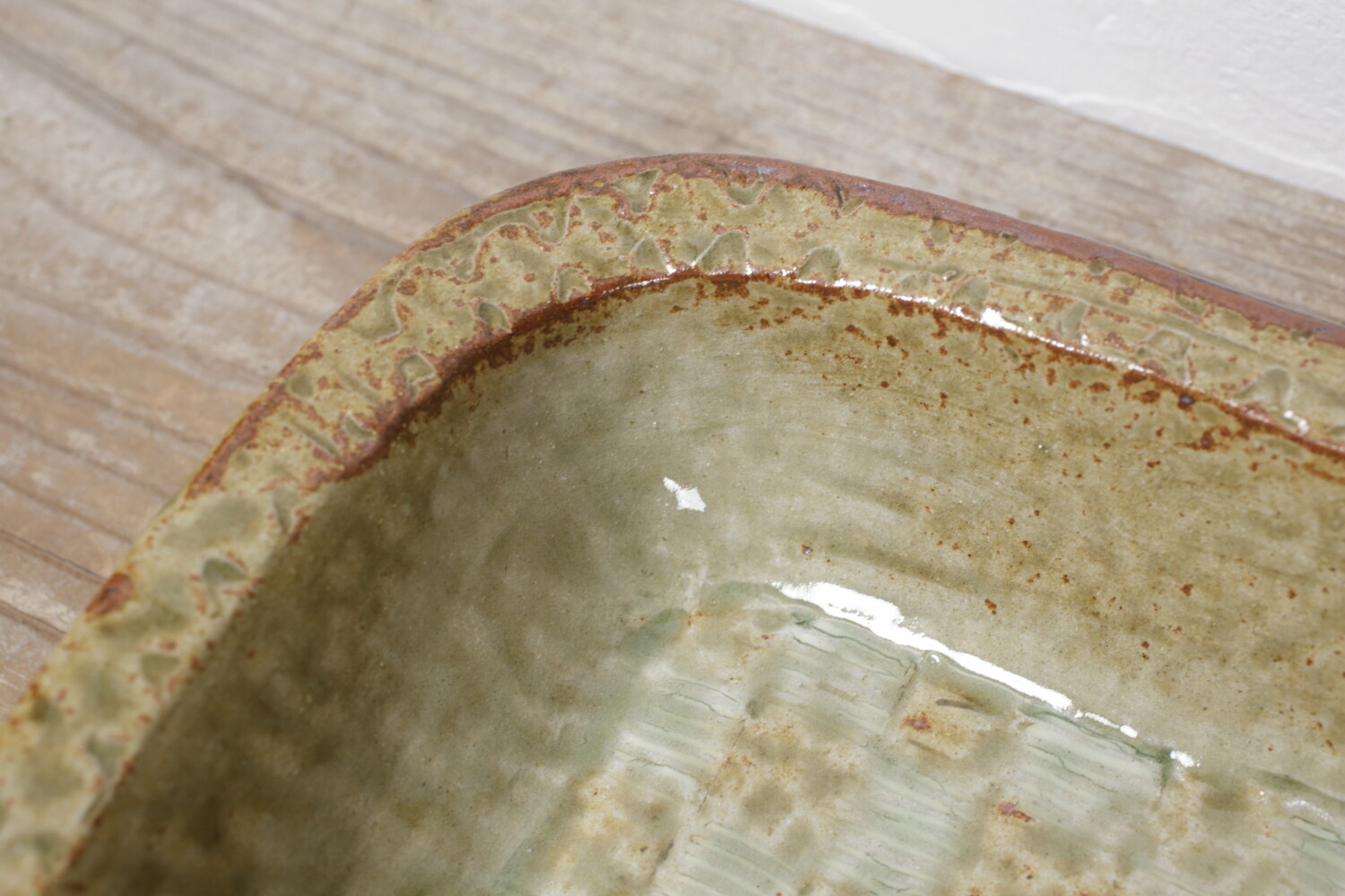模様を彫り、その上に白化粧を埋め込み柄をコントラストで表す象嵌(ぞうがん)と呼ばれる技法を用いた長角鉢。ご家族のメインのおかずにいい大きさです。釉薬は16世紀から17世紀に作られていた朝鮮由来の伊羅保茶碗(抹茶碗)などお茶の道具に用いられていた、表面がざらっと粗い「伊羅保(いらぼ)釉」と透明釉が用いられています。