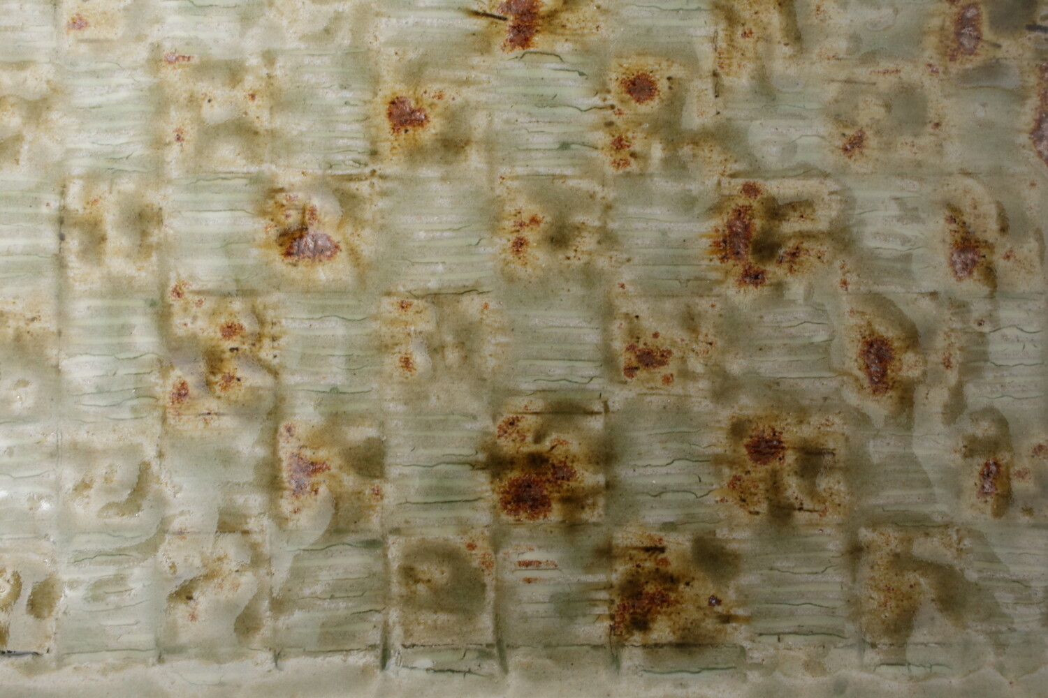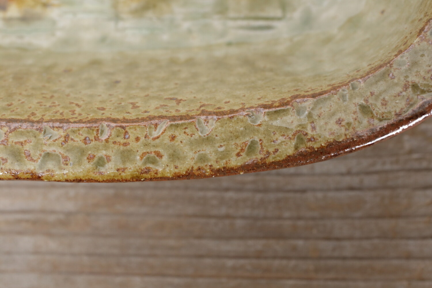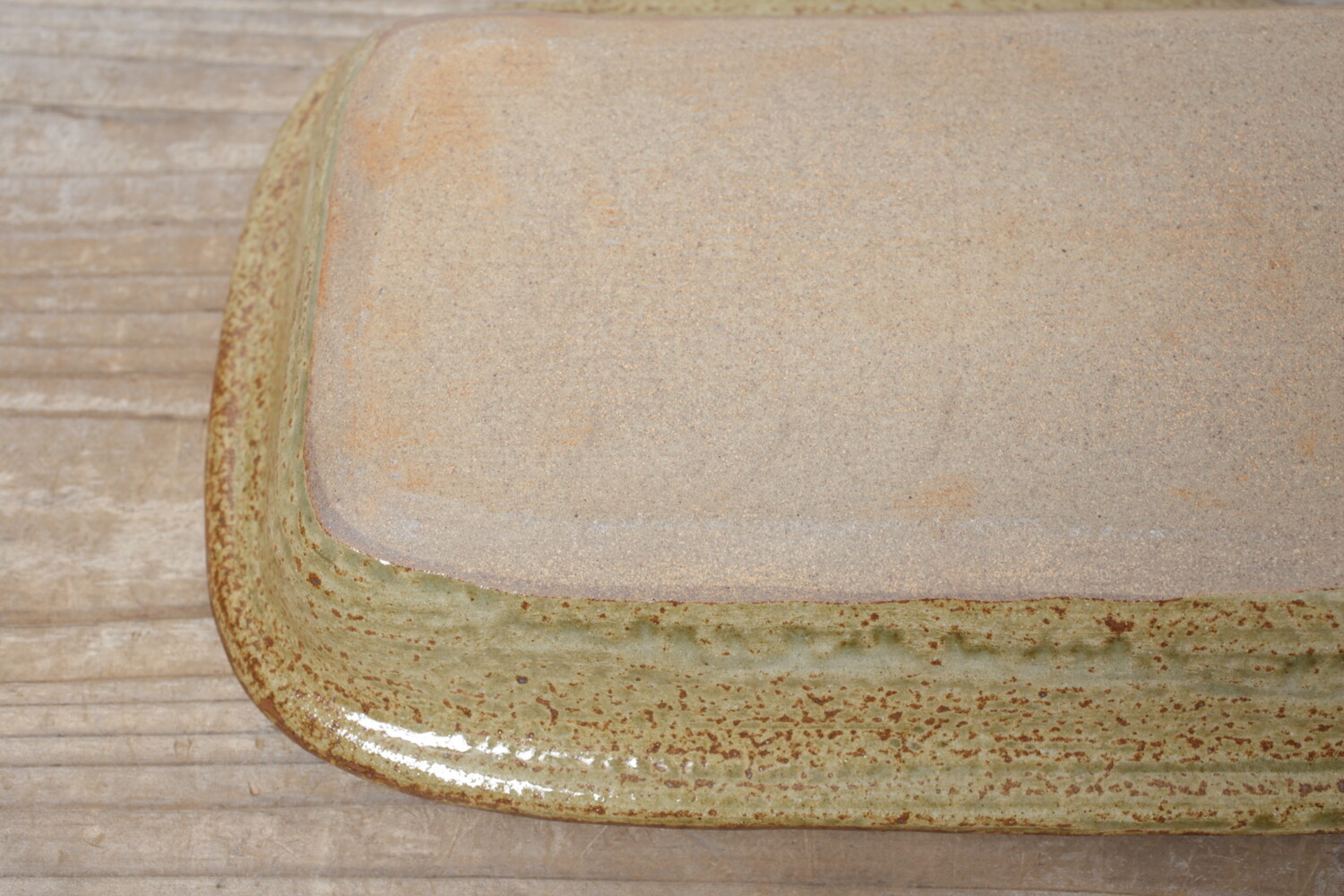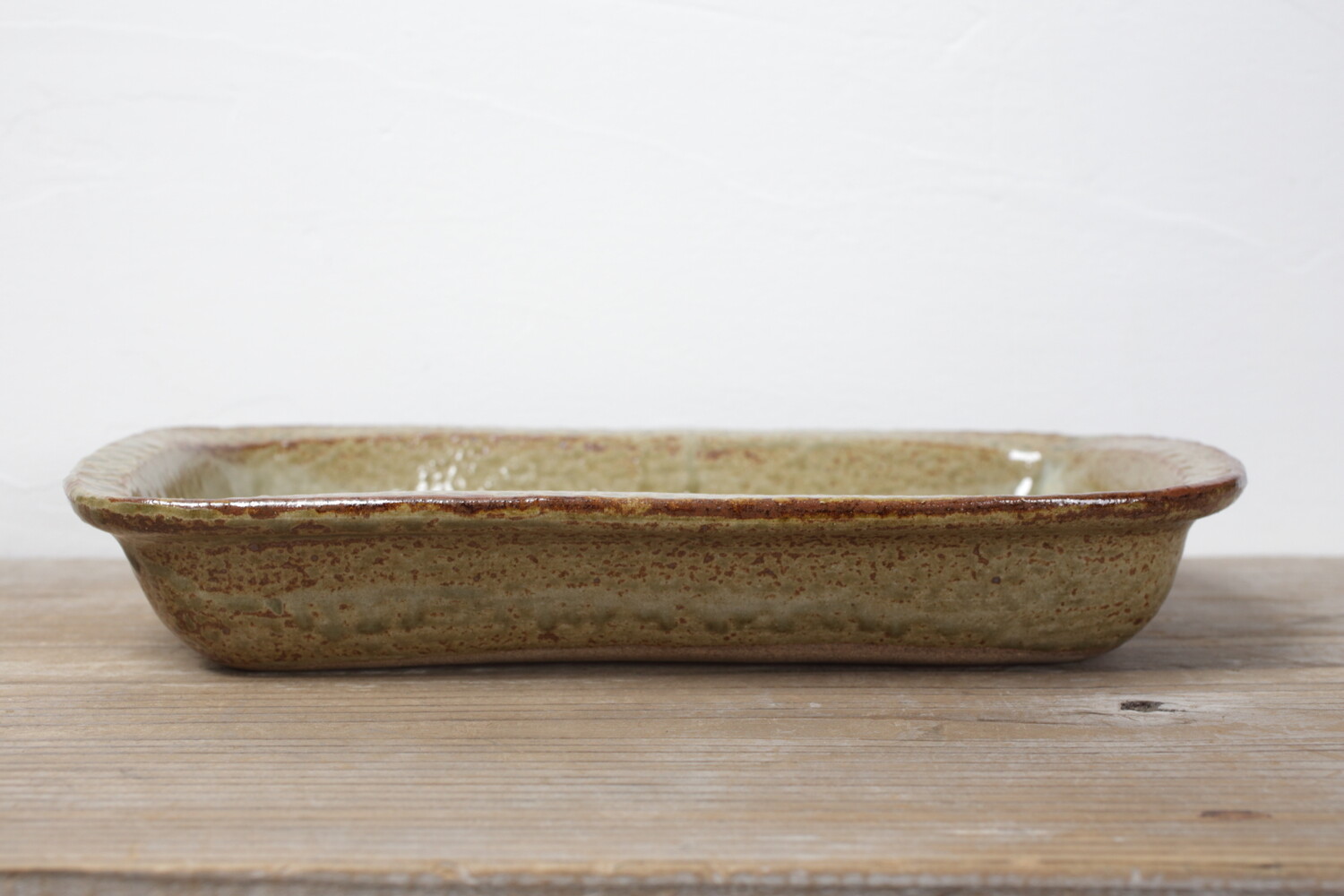 模様を彫り、その上に白化粧を埋め込み柄をコントラストで表す象嵌(ぞうがん)と呼ばれる技法を用いた長角鉢。ご家族のメインのおかずにいい大きさです。釉薬は16世紀から17世紀に作られていた朝鮮由来の伊羅保茶碗(抹茶碗)などお茶の道具に用いられていた、表面がざらっと粗い「伊羅保(いらぼ)釉」と透明釉が用いられています。