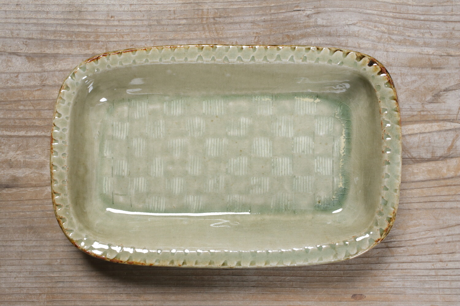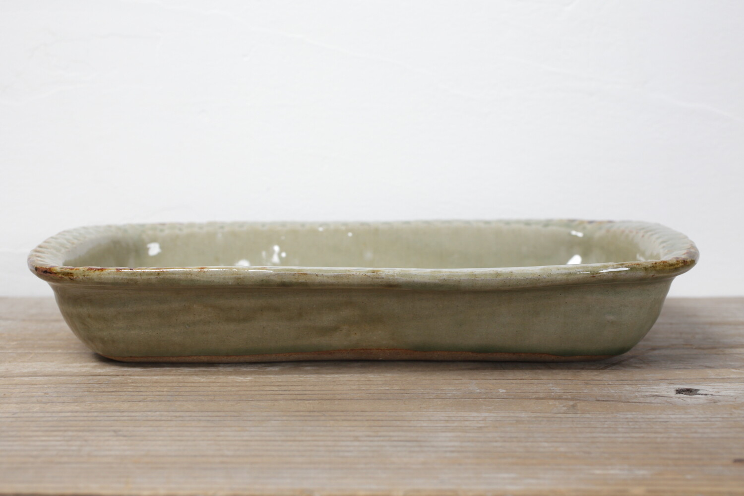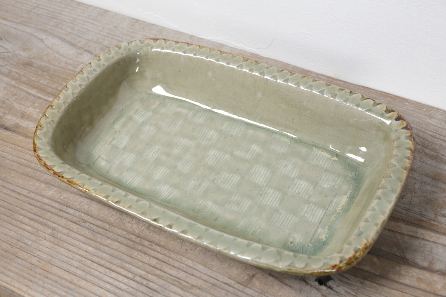 模様を彫った上に白化粧を埋め込み、柄をコントラストで表す象嵌(ぞうがん)と呼ばれる技法を用いた長角鉢。ふち飾りの押紋も愛らしく効いていますね。ご家族のメインのおかずにいい大きさです。
