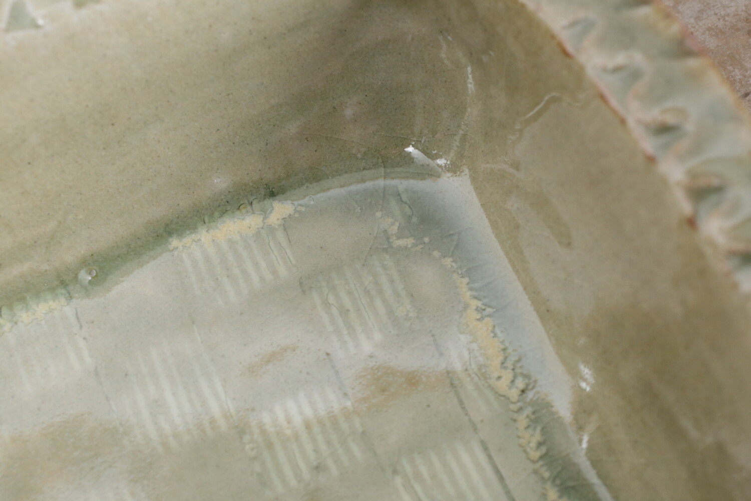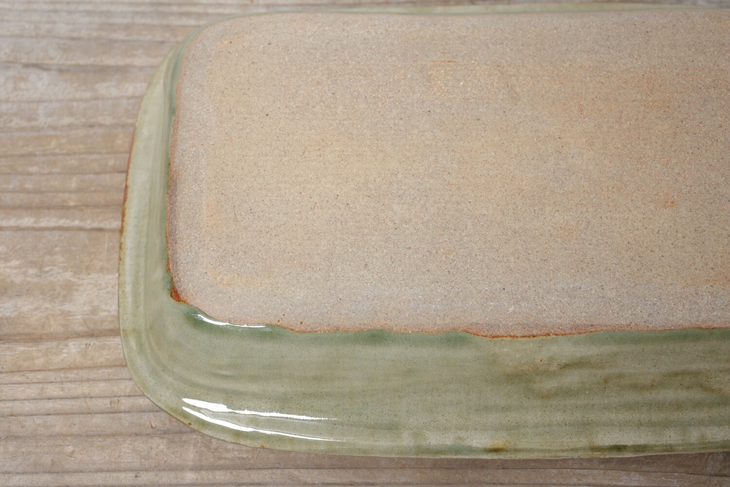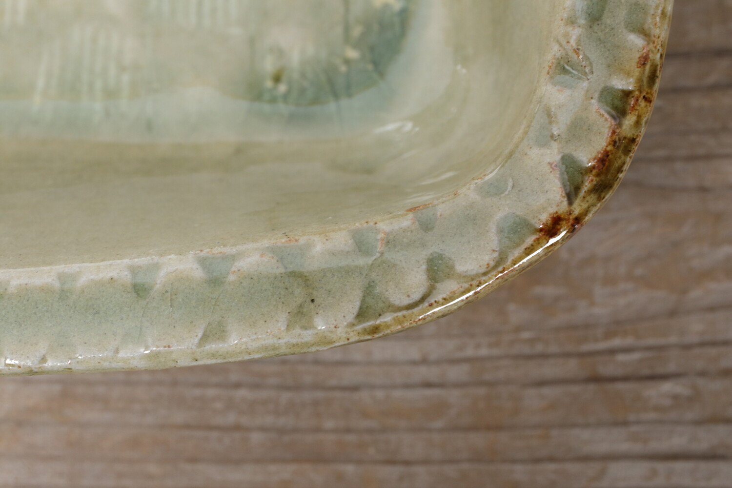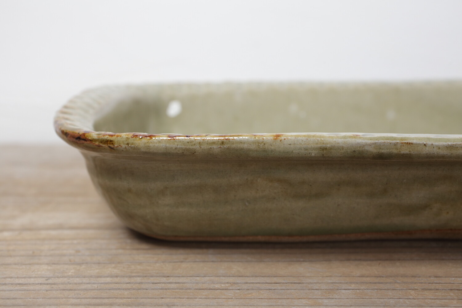 模様を彫った上に白化粧を埋め込み、柄をコントラストで表す象嵌(ぞうがん)と呼ばれる技法を用いた長角鉢。ふち飾りの押紋も愛らしく効いていますね。ご家族のメインのおかずにいい大きさです。