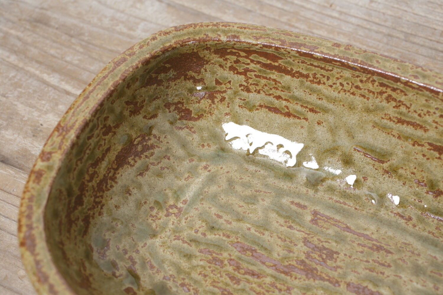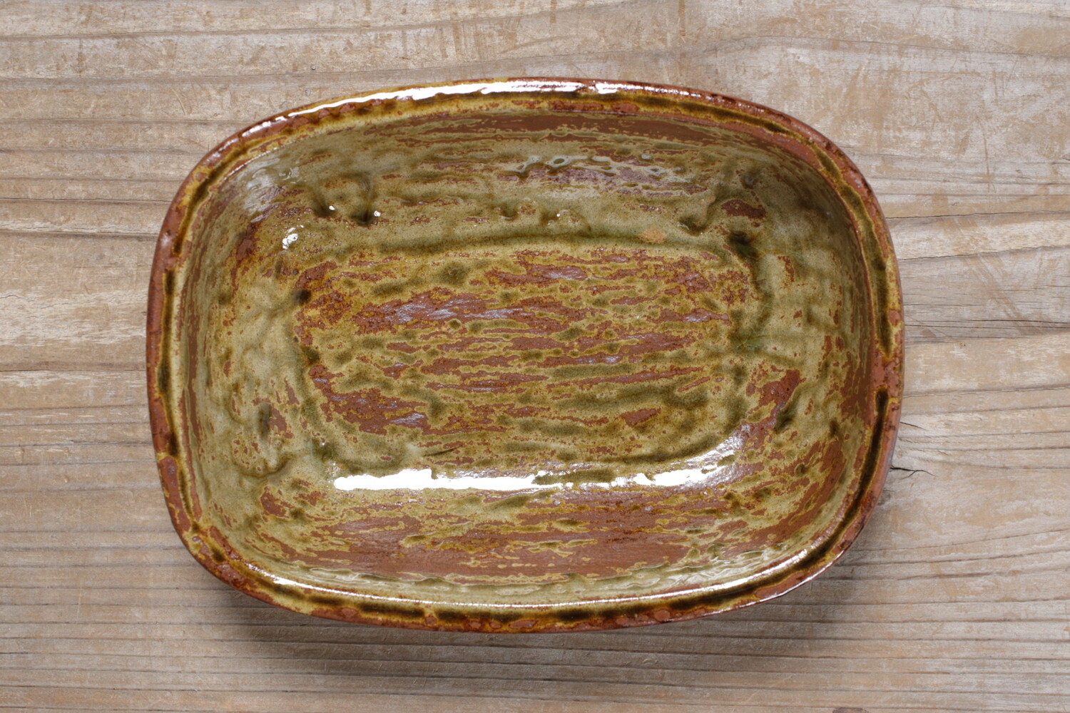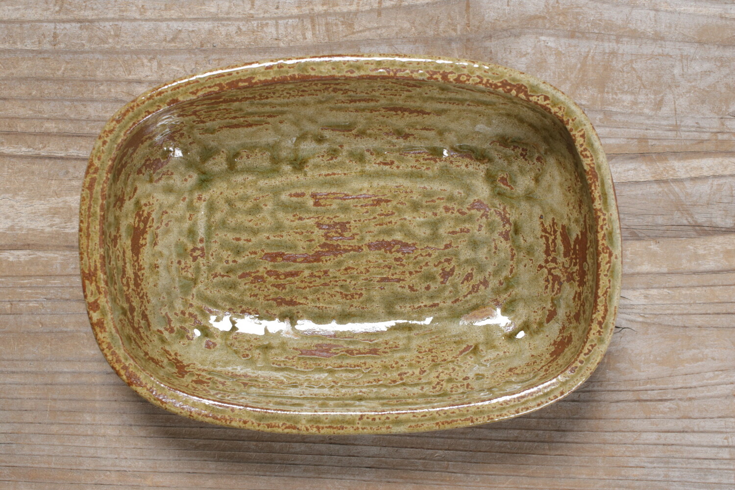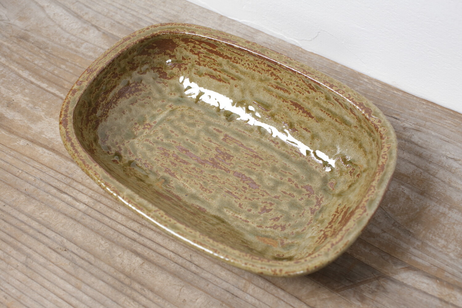 16世紀から17世紀に作られていた朝鮮由来の伊羅保茶碗(抹茶碗)などお茶の道具に用いられていた、表面がざらっと粗い「伊羅保(いらぼ)釉」の特徴を前面に生かした長角鉢。一般的なトースターにも入る大きさですので、かぶやじゃがいも、魚介類など季節の食材を用いたグラタンなどにもいいでしょう。ご家族のおかずの盛り鉢としてもいいですね。
