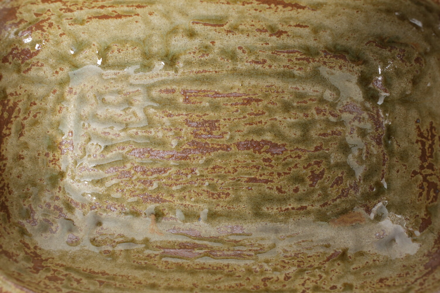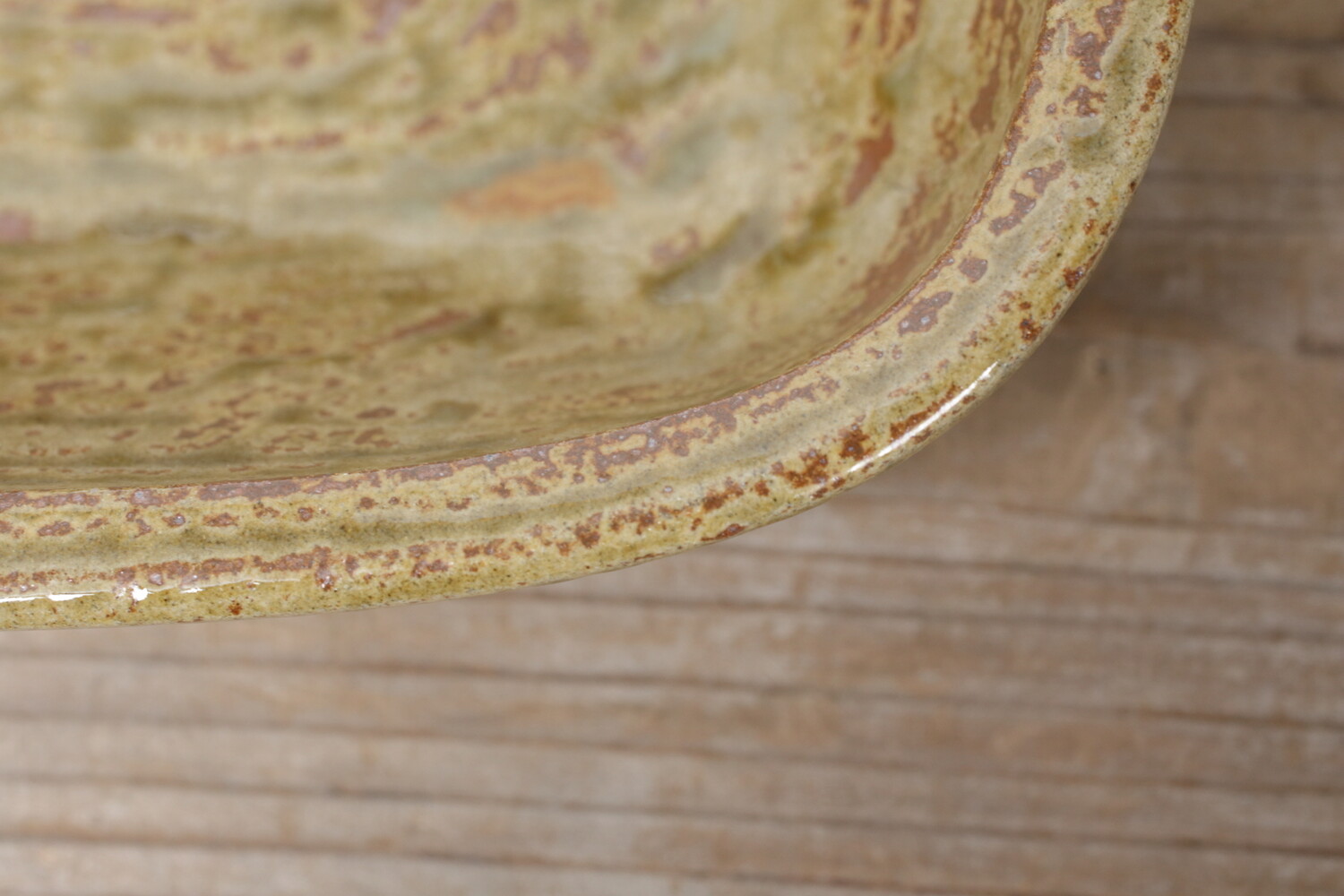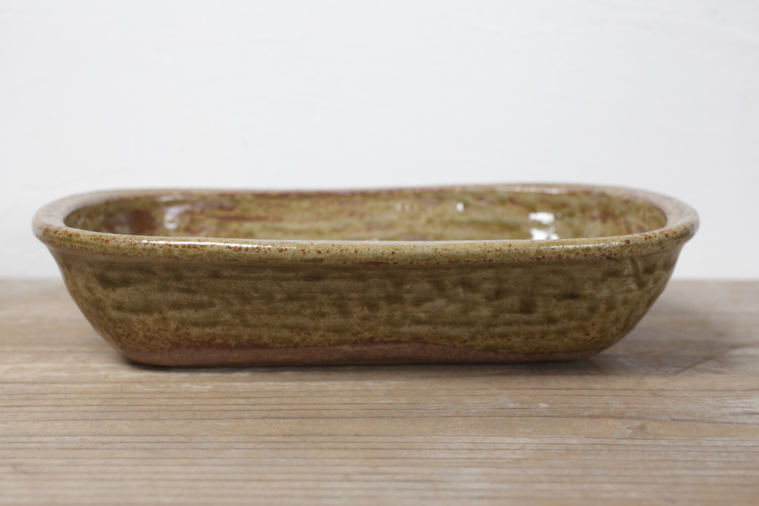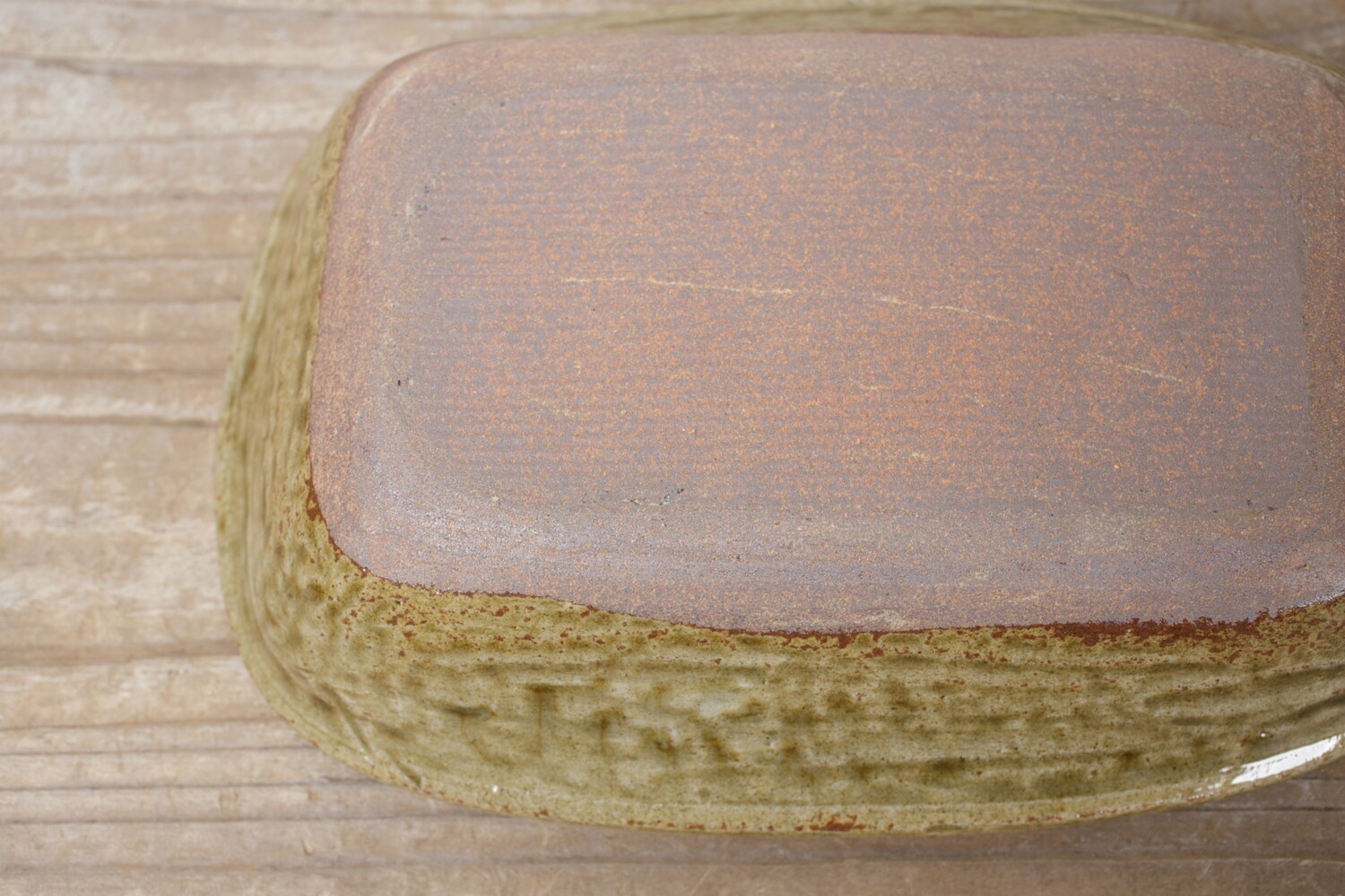 16世紀から17世紀に作られていた朝鮮由来の伊羅保茶碗(抹茶碗)などお茶の道具に用いられていた、表面がざらっと粗い「伊羅保(いらぼ)釉」の特徴を前面に生かした長角鉢。一般的なトースターにも入る大きさですので、かぶやじゃがいも、魚介類など季節の食材を用いたグラタンなどにもいいでしょう。ご家族のおかずの盛り鉢としてもいいですね。