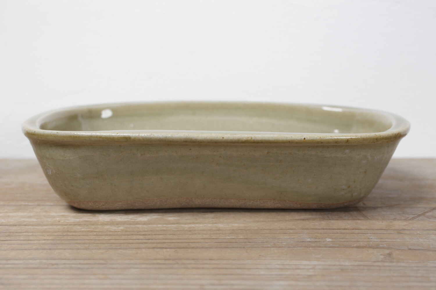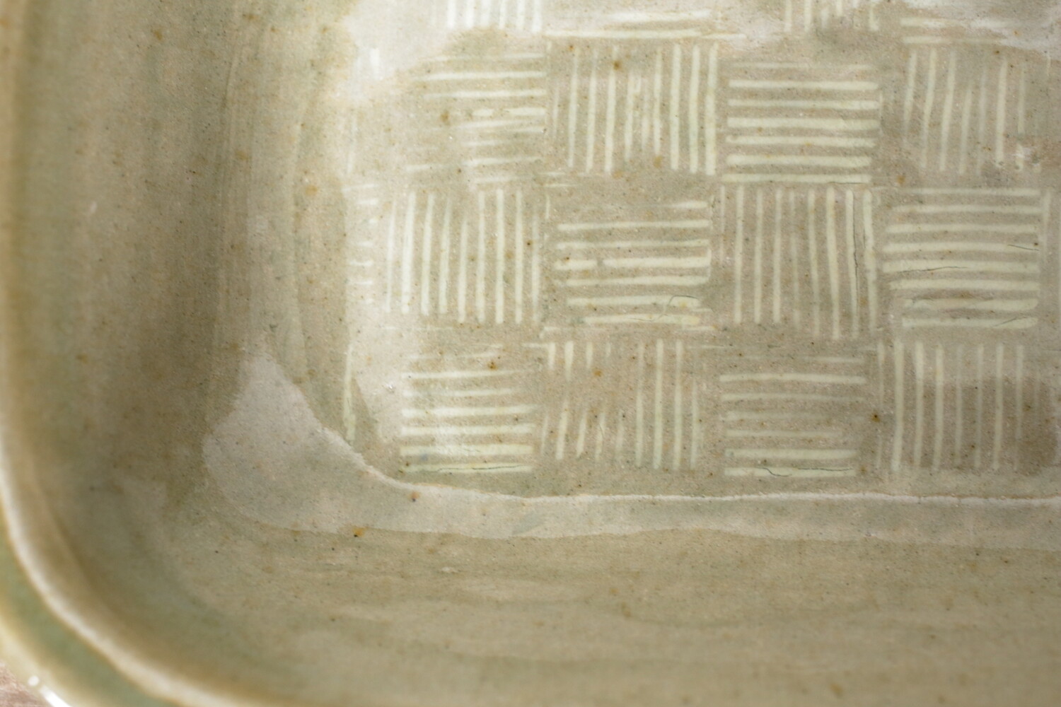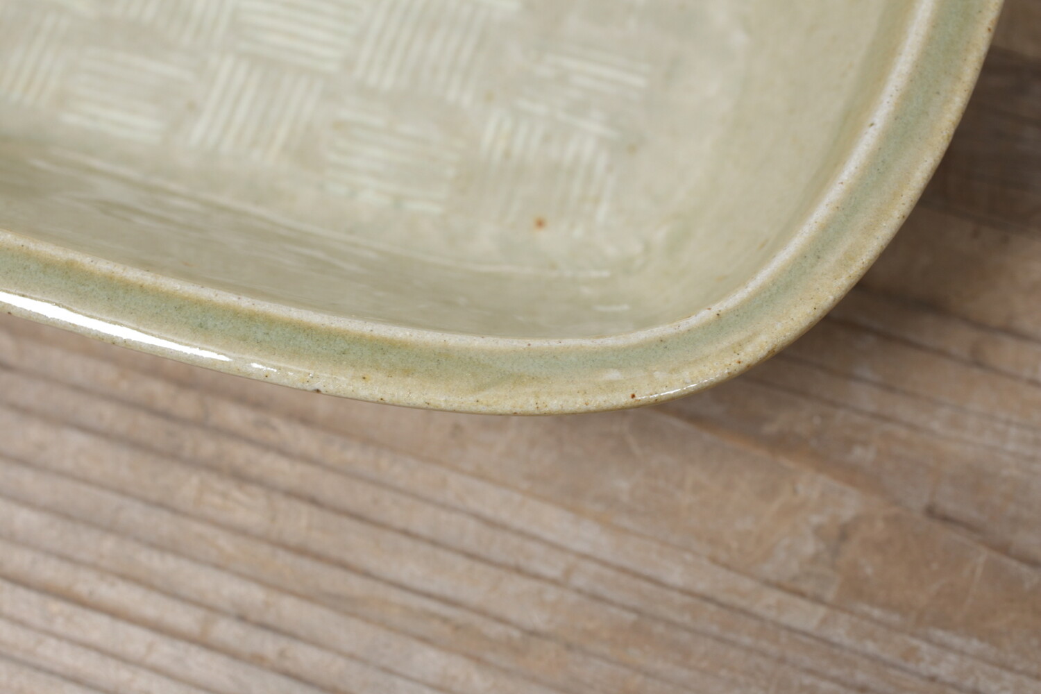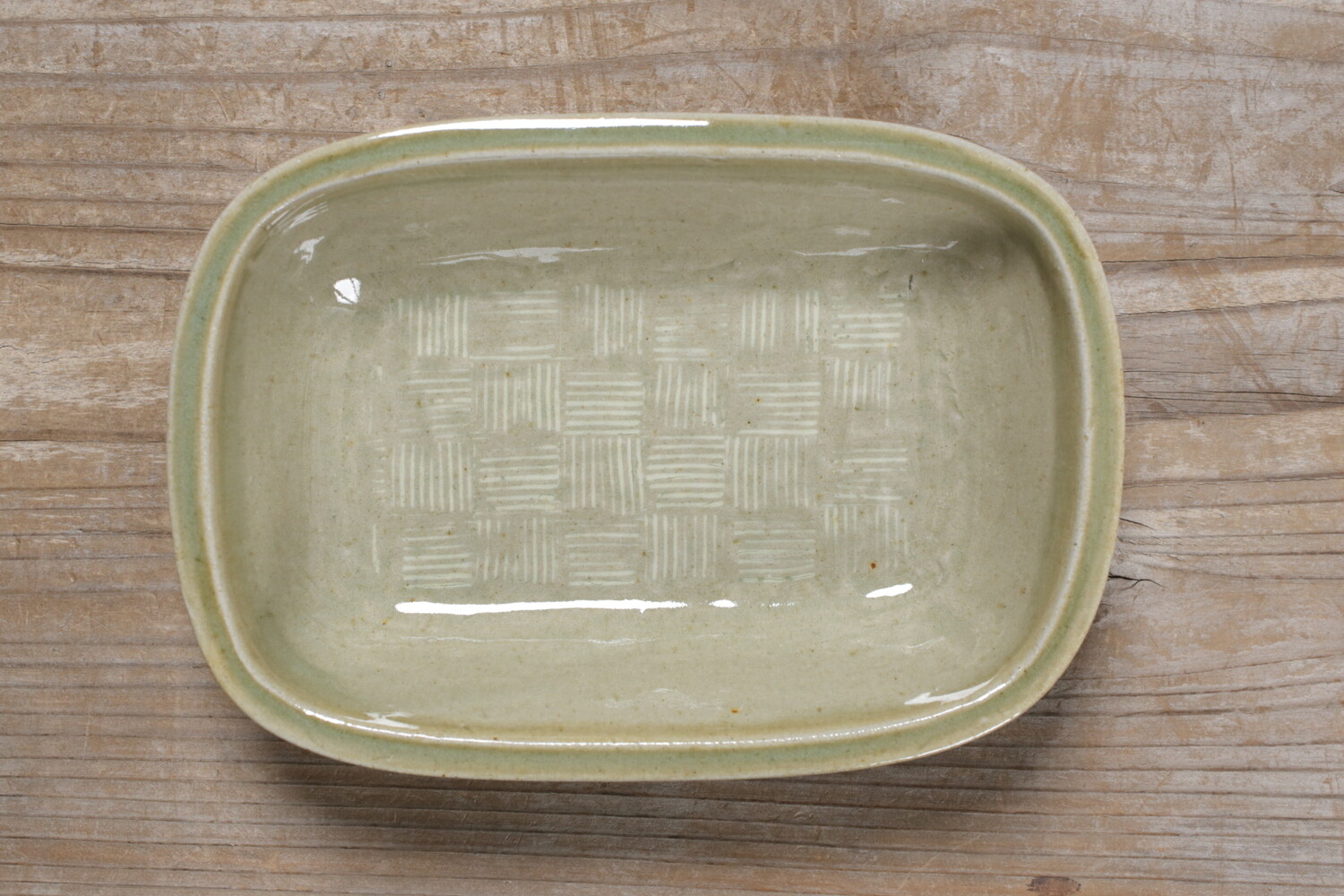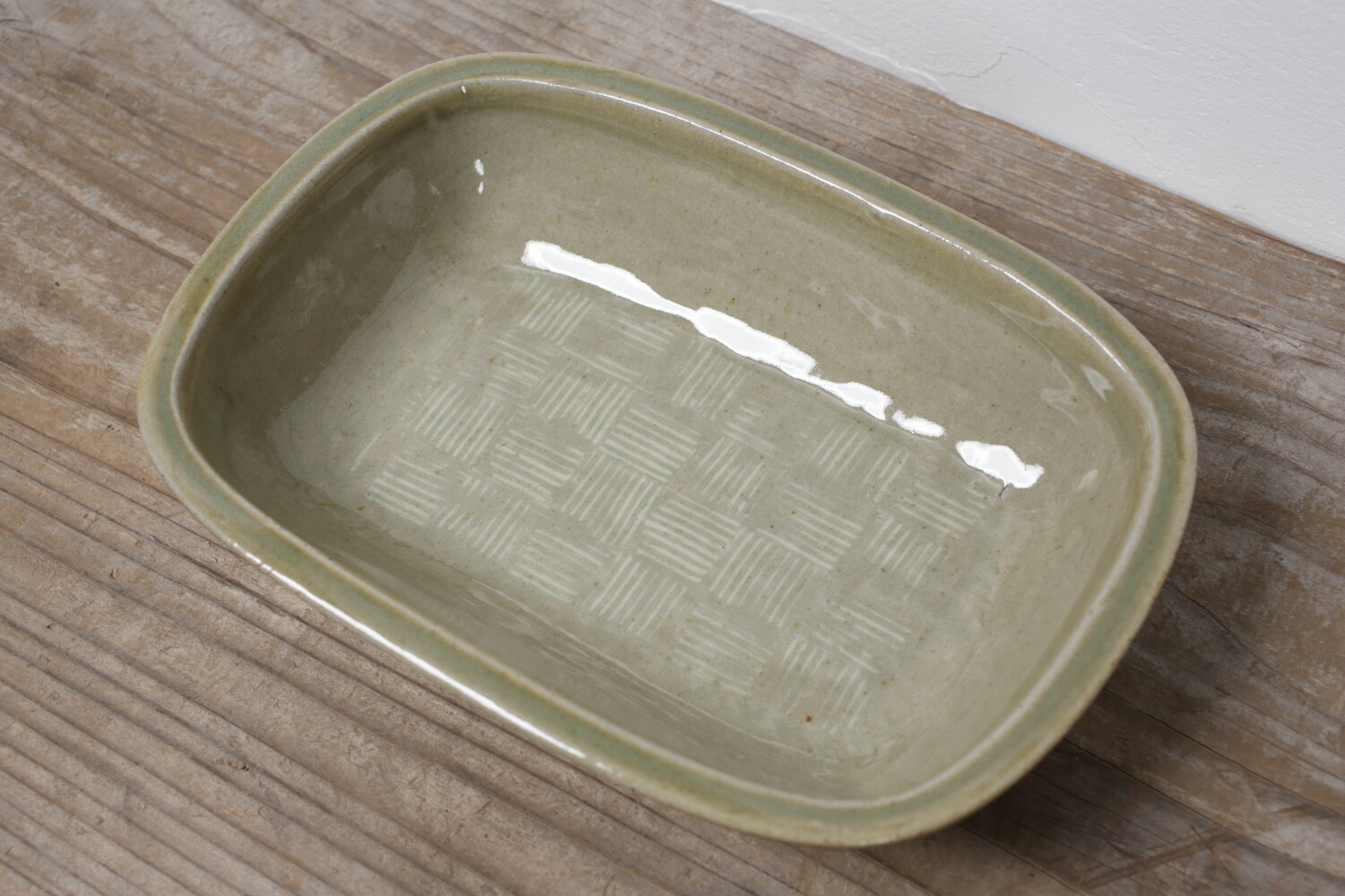 模様を彫った上に白化粧を埋め込み、柄をコントラストで表す象嵌(ぞうがん)と呼ばれる技法を用いた長角鉢。市松模様も象嵌で表現すると軽やかな印象です。3,4人分のおかずにいいですね。