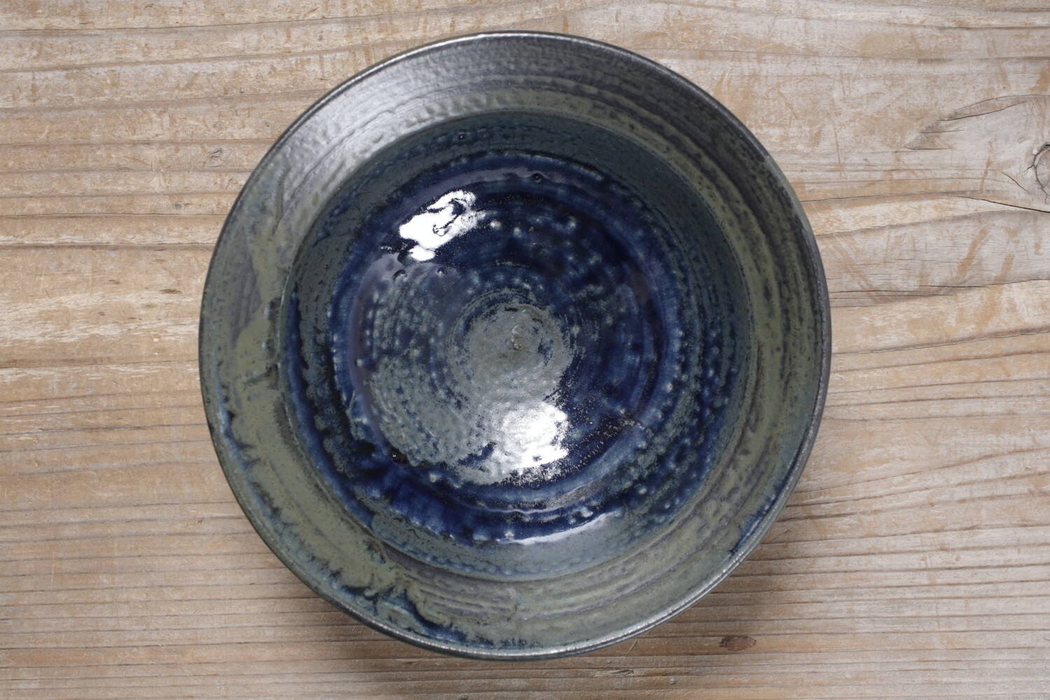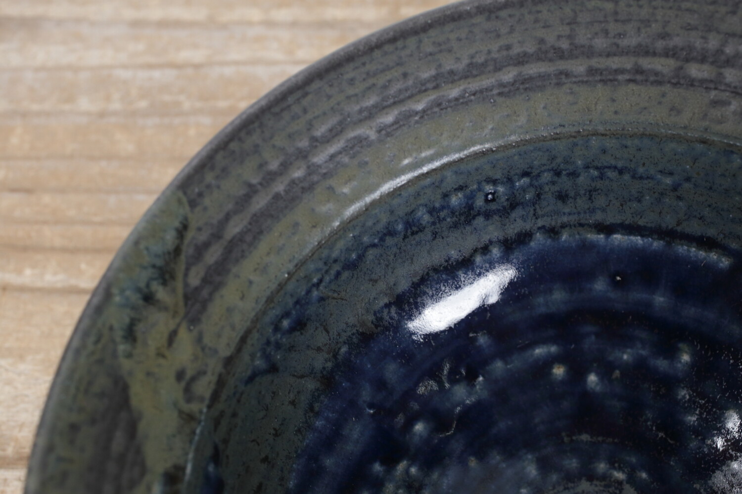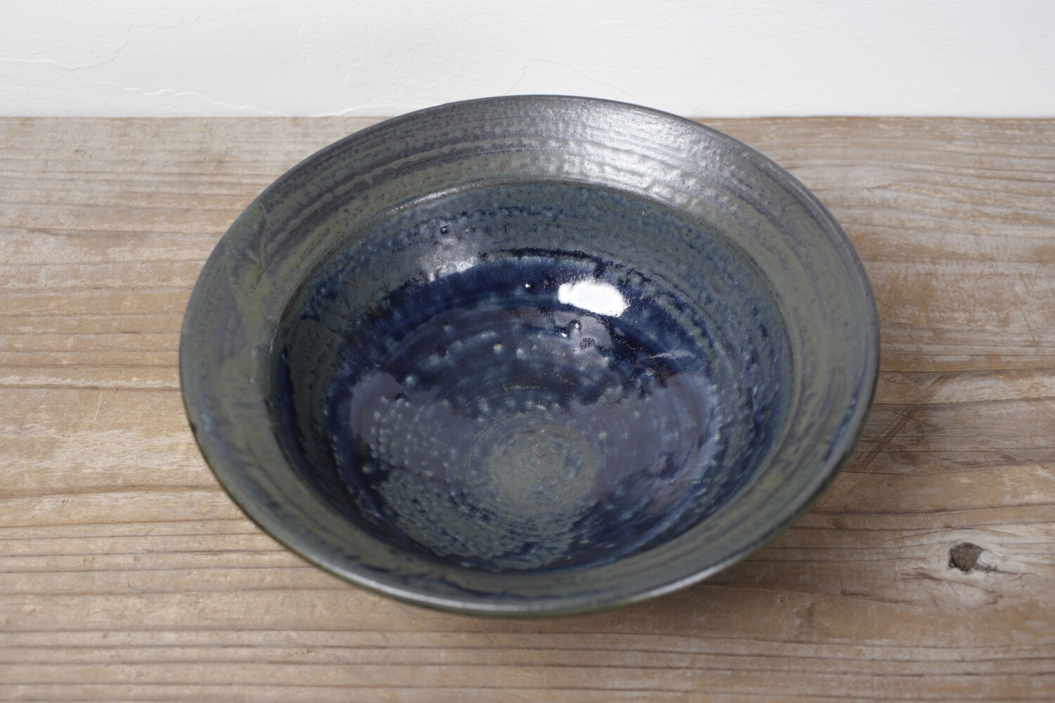 兜に形が似ていることから兜鉢と呼ばれているリム付き鉢。直径21.5cmほどの七寸サイズは2,3人分のご家族のおかずに、またお一人分の冷やし中華や和え麺などにもいいでしょう。色は呉須釉と呼ばれる藍色と深緑を混ぜたような色合いの釉薬にざらっとした質感の伊羅保釉を混ぜることで特徴的な表情に仕上がっています。