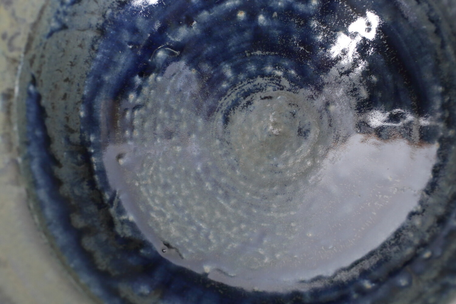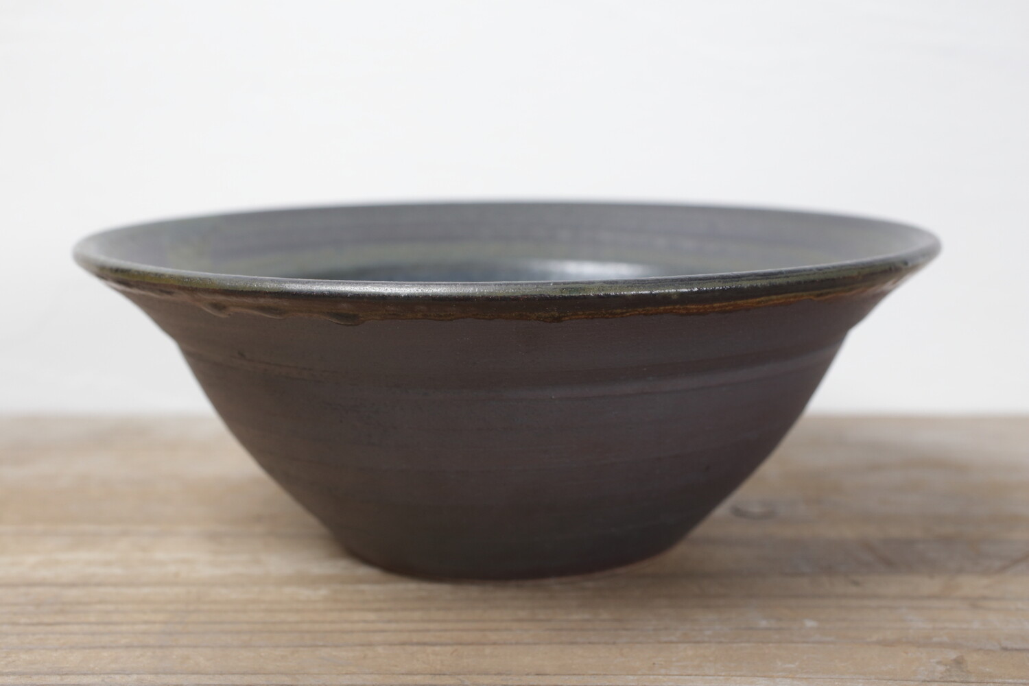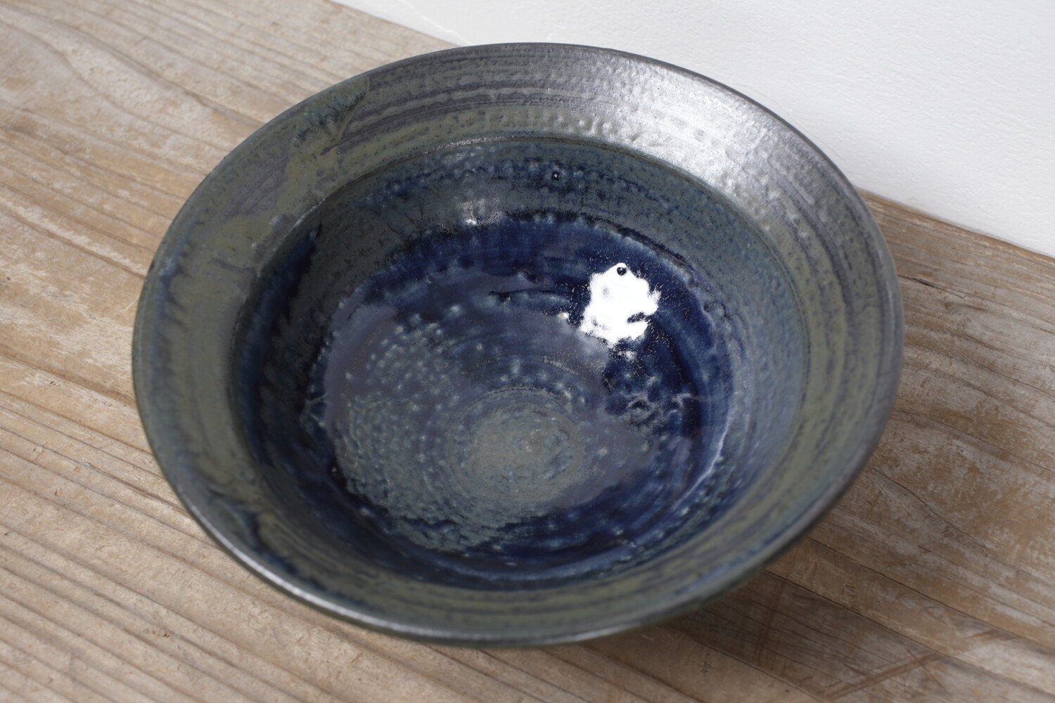 兜に形が似ていることから兜鉢と呼ばれているリム付き鉢。直径21.5cmほどの七寸サイズは2,3人分のご家族のおかずに、またお一人分の冷やし中華や和え麺などにもいいでしょう。色は呉須釉と呼ばれる藍色と深緑を混ぜたような色合いの釉薬にざらっとした質感の伊羅保釉を混ぜることで特徴的な表情に仕上がっています。