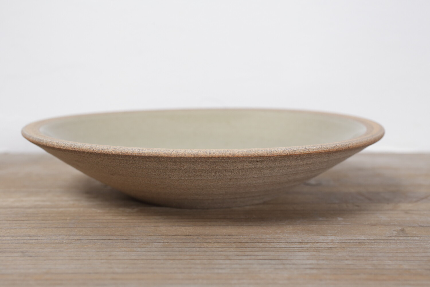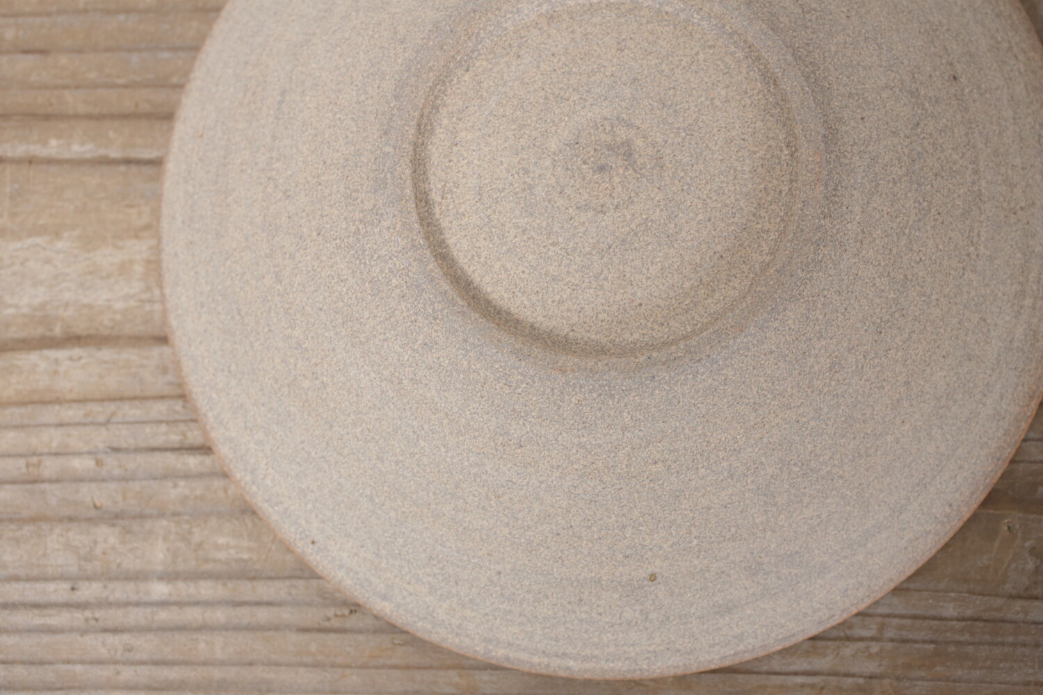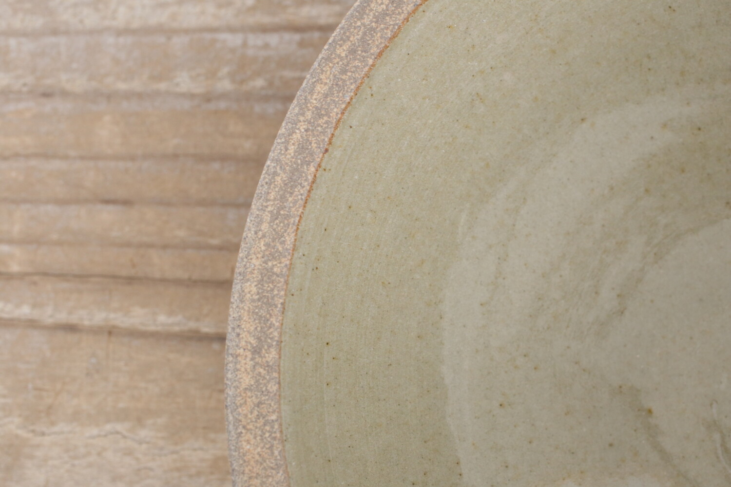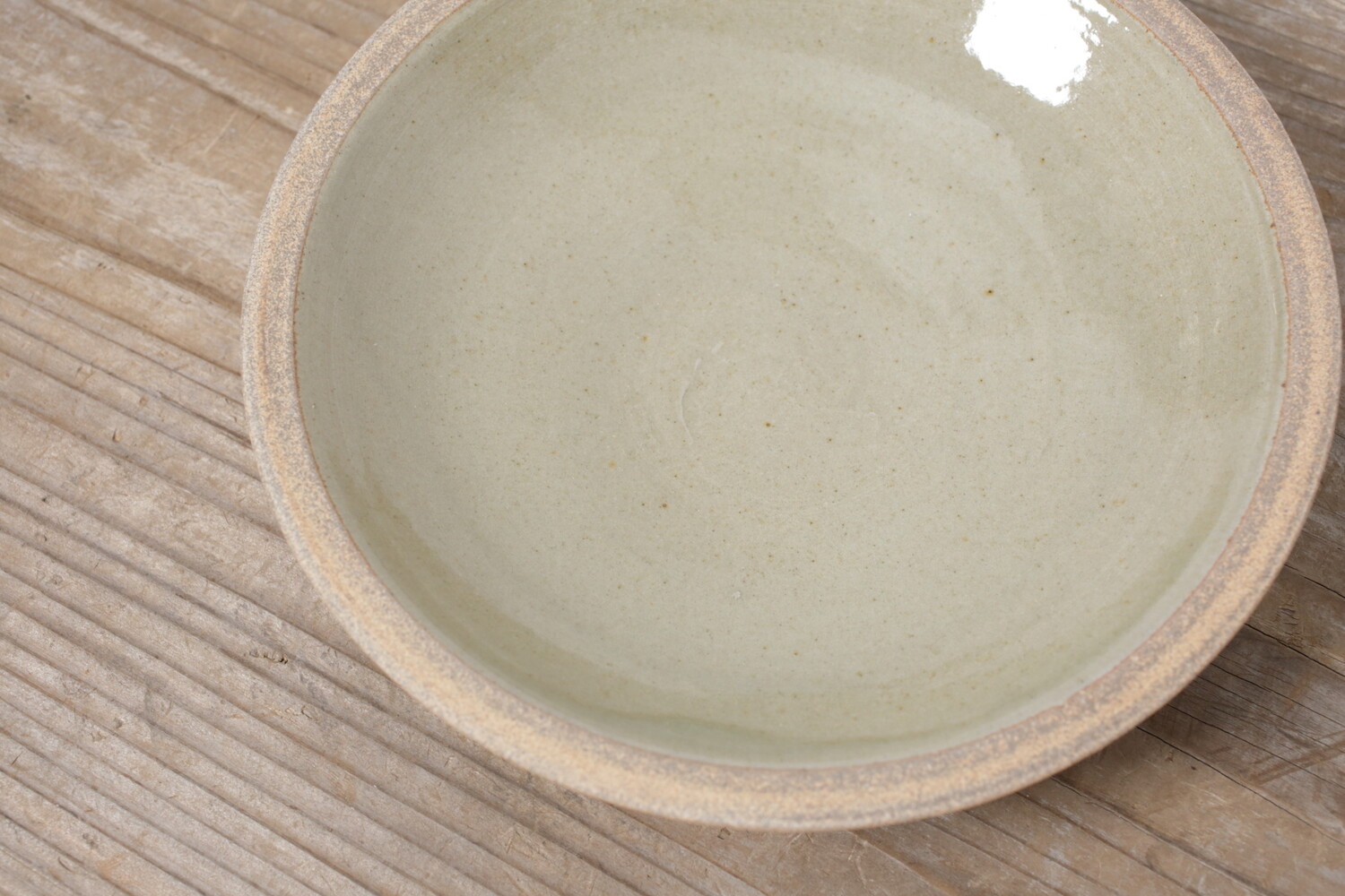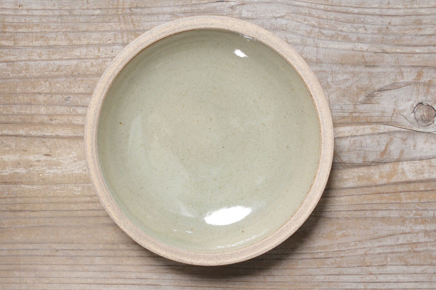 うっすらと緑色の優しい色合いの透明釉をふちには釉薬をかけないことで、柔らかい色合いがとても引き立っている七寸皿。プレートとして、また2,3人のおかずやご家族の果物にもいいでしょう。
