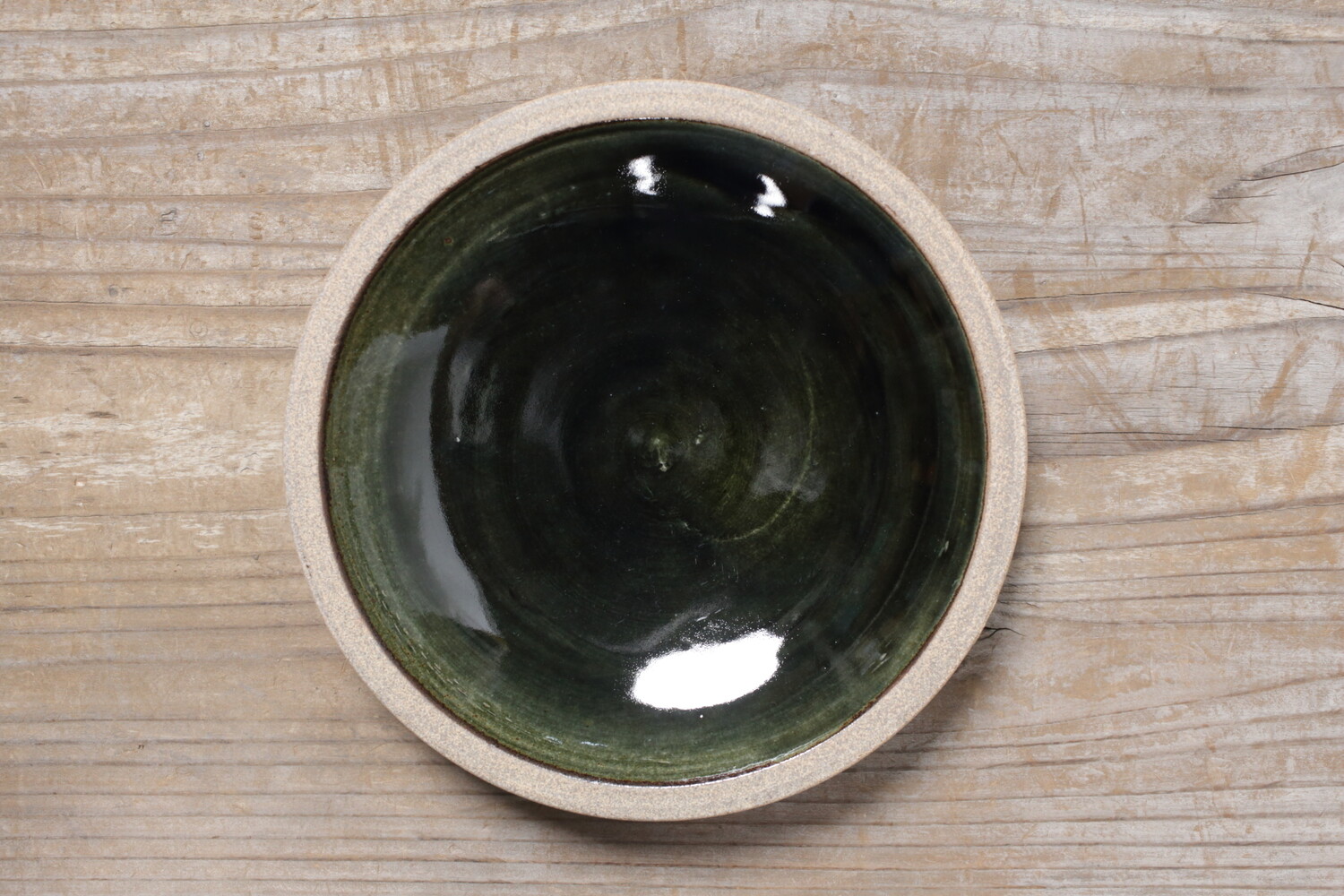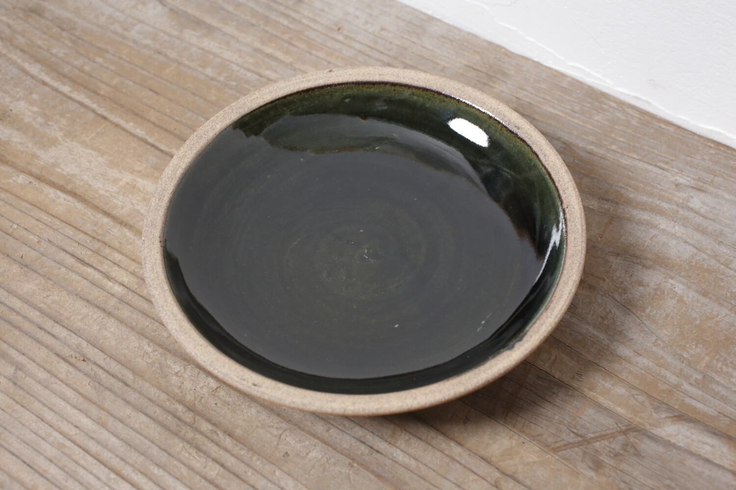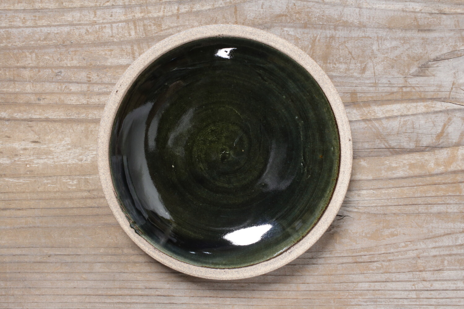 藍色と深緑を混ぜたような奥行きのある色合いが印象的な呉須釉のふち無し六寸皿。少し大きめの取り分け皿として複数のおかずに、またサラダやパン皿、果物やお漬物などにもいいでしょう。