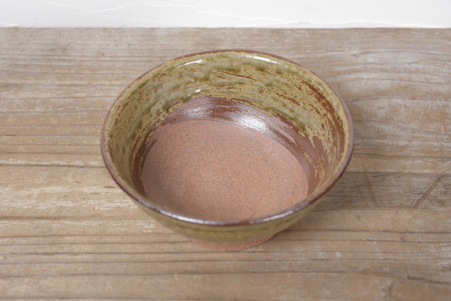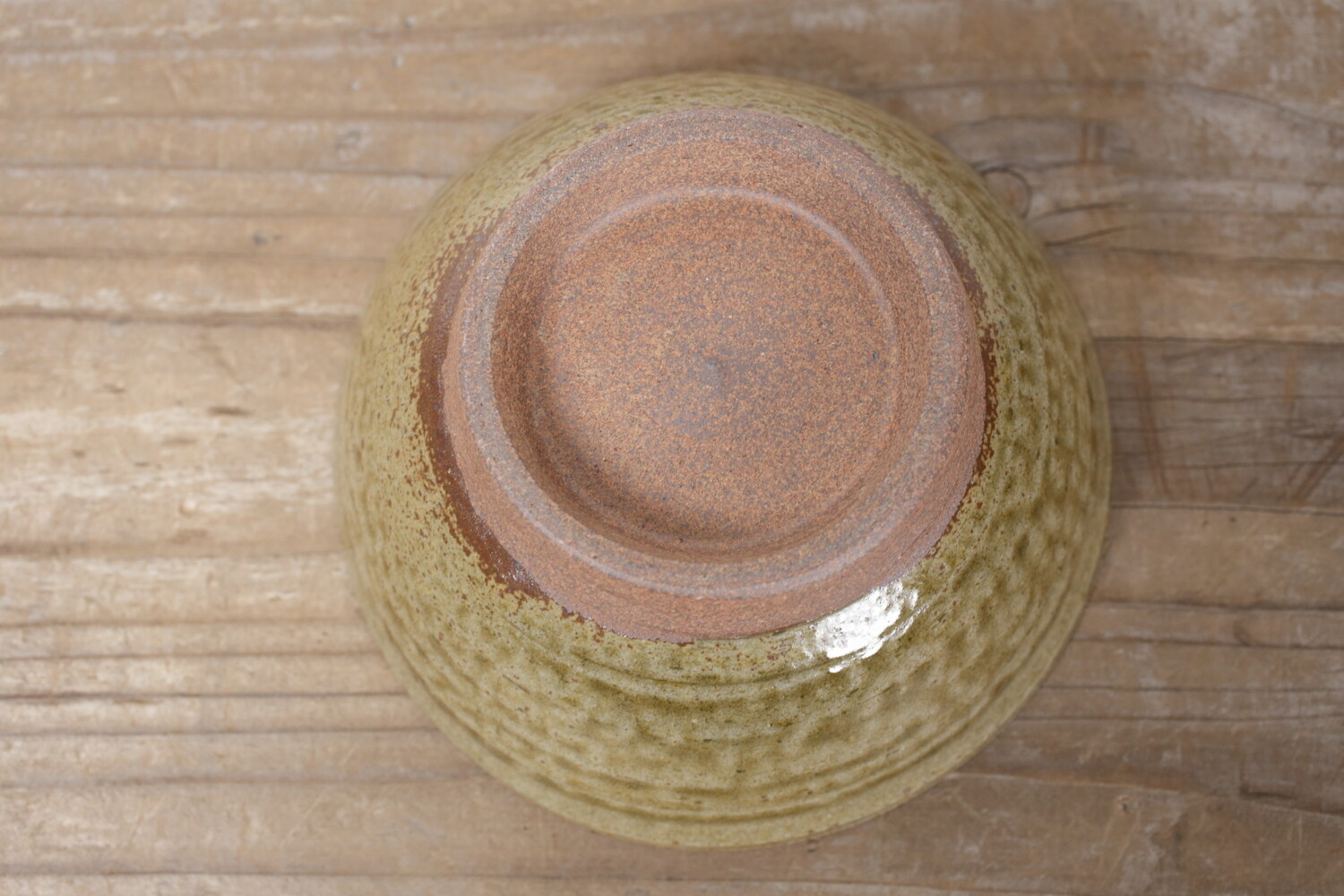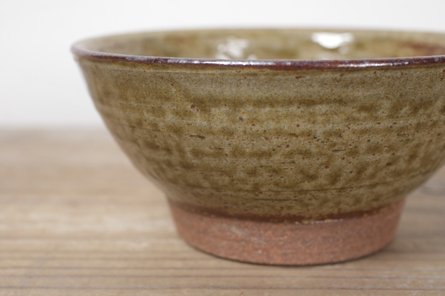 涌田型(わくた)と呼ばれ高台が広く口元に向かって直線的に広がる沖縄の伝統的な形のお碗です。またg16世紀から17世紀に作られていた朝鮮由来の伊羅保茶碗(抹茶碗)などお茶の道具に用いられていた、表面がざらっと粗い「伊羅保(いらぼ)釉」が用いられているため、どこかお茶の世界観も感じます。店頭ではお鍋の取り鉢として購入される方が多かったのも特徴です。