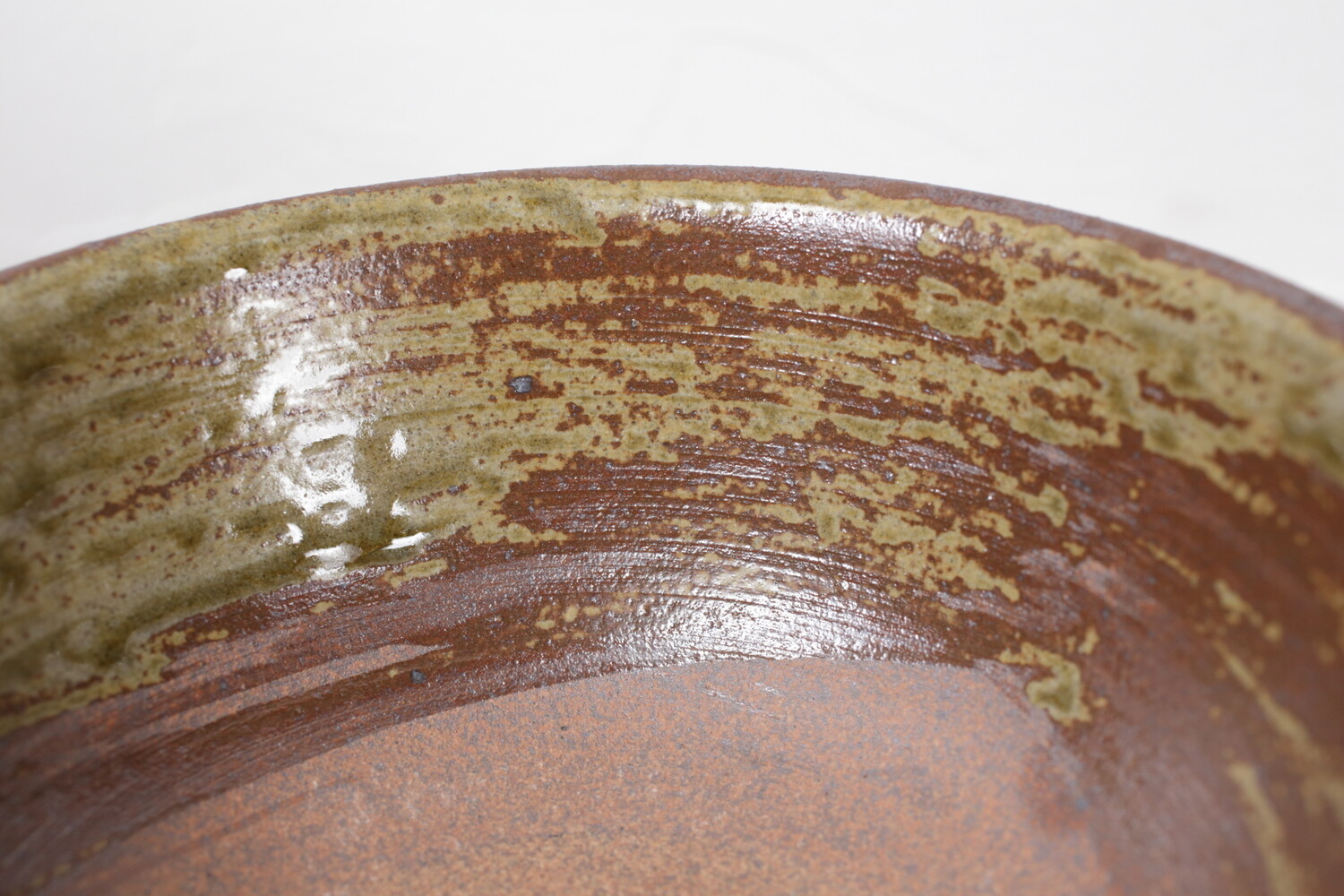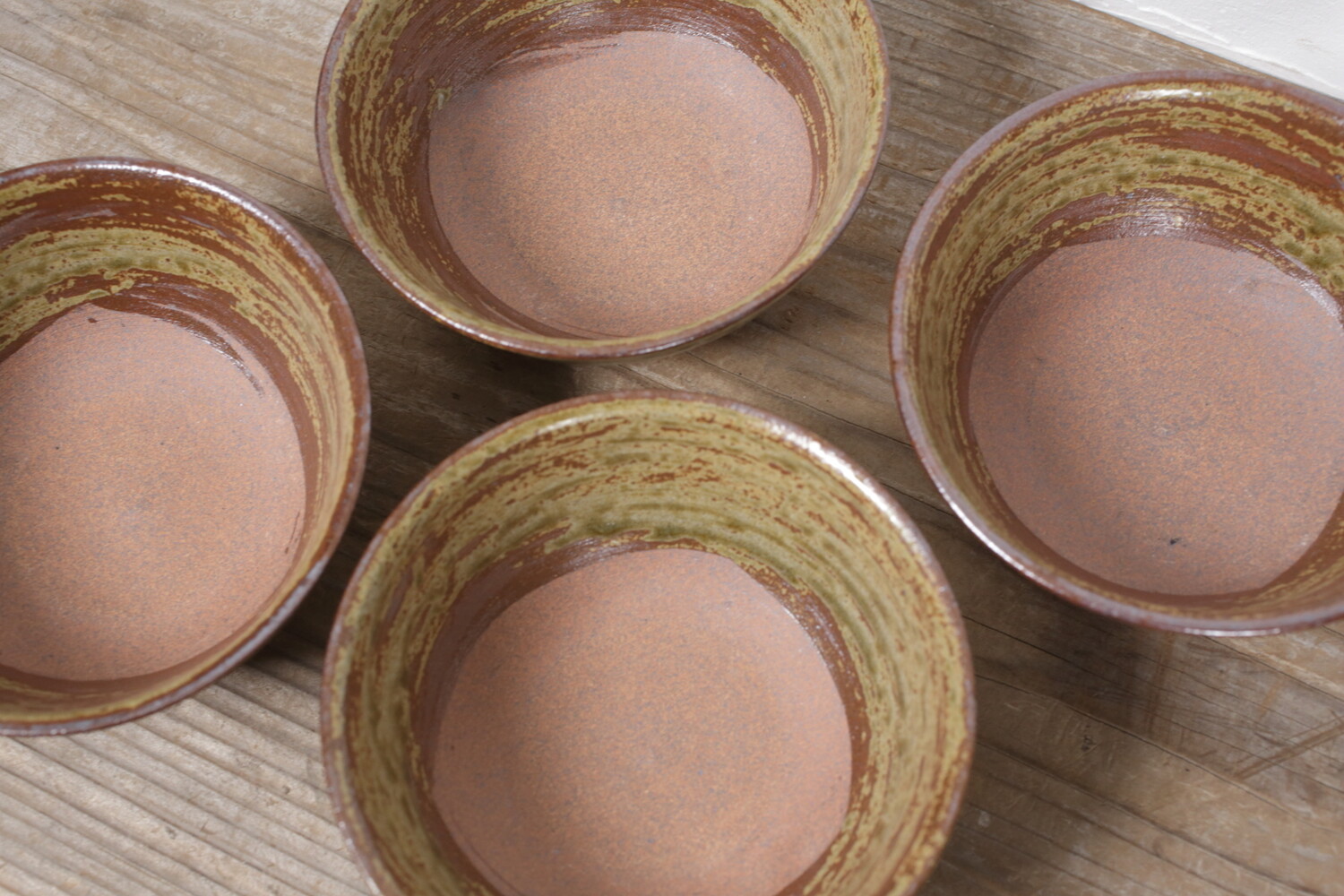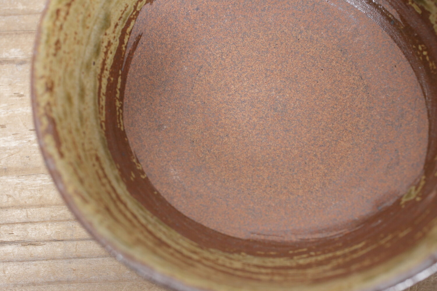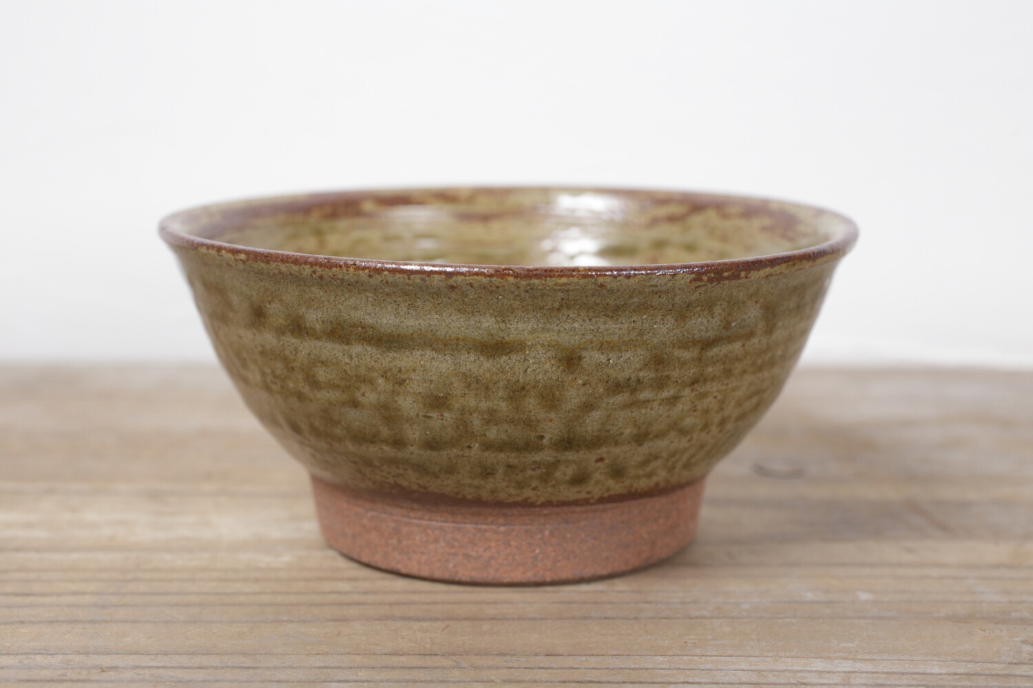 涌田型(わくた)と呼ばれ高台が広く口元に向かって直線的に広がる沖縄の伝統的な形のお碗です。またg16世紀から17世紀に作られていた朝鮮由来の伊羅保茶碗(抹茶碗)などお茶の道具に用いられていた、表面がざらっと粗い「伊羅保(いらぼ)釉」が用いられているため、どこかお茶の世界観も感じます。店頭ではお鍋の取り鉢として購入される方が多かったのも特徴です。