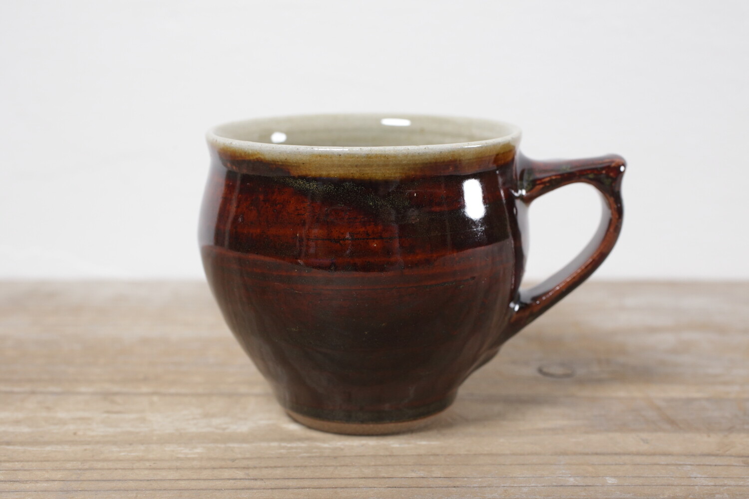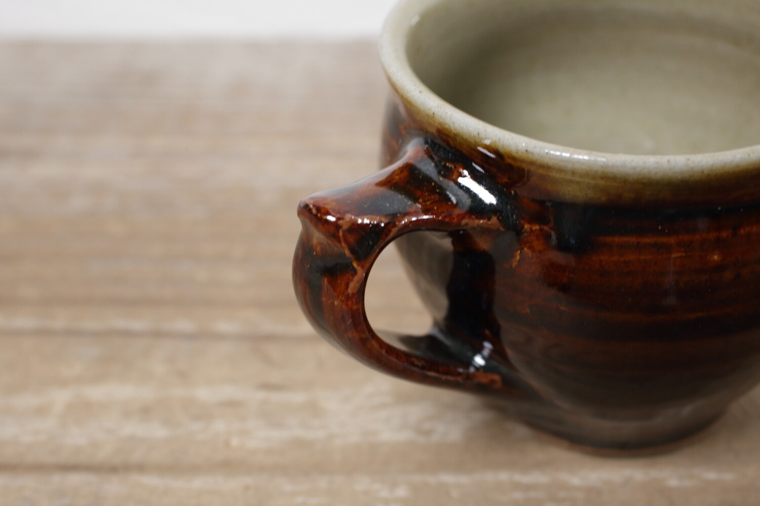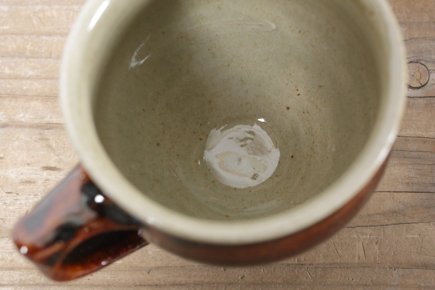 直径9.5cmほどのマグカップは特大と名付けられていますが、8分目ほどの計量で270mlと大サイズほどの大きさです。外側と内側の釉薬の色味が調和していて気持ちがいいですね。