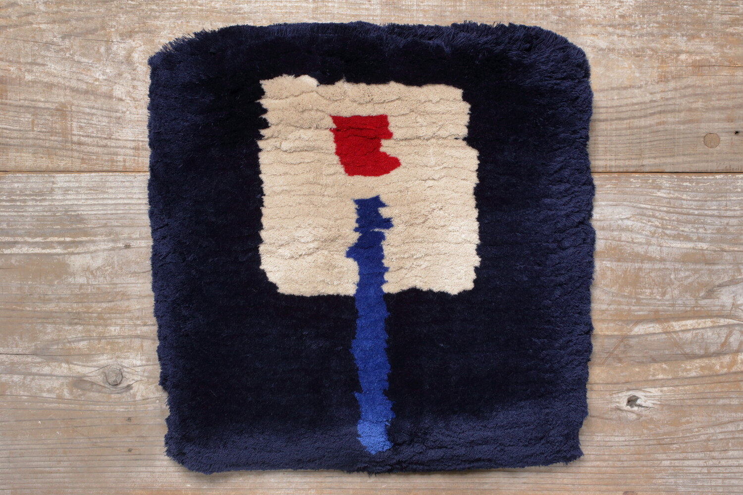 佐藤さんの糸を無駄にしないという考えに基づき、他のノッティングの作家さんと比較すると糸を切り込み過ぎず毛足が長いのが特徴です。そのためどうしても毛足が短いノッティングより毛足が倒れやすいのですが、圧倒的な座り心地のよさは一度座って頂くと皆さん驚かれるほどです。糸はウール100%ですので、しっとりとした座り心地です。手で糸の向きと反対方向にならして頂くと柄に対して毛並みが整い綺麗になります。コロコロなどをお使い頂いてもいいでしょう。通常お洗濯は必要ありませんが、飲み物をこぼしてしまったなど汚れが気になるという方は、薄めた中性洗剤で手揉み洗いをした後、しっかりと乾かして下さい。乾かした後はウールのため毛玉が出ますので、コロコロ等で取り除いてください。