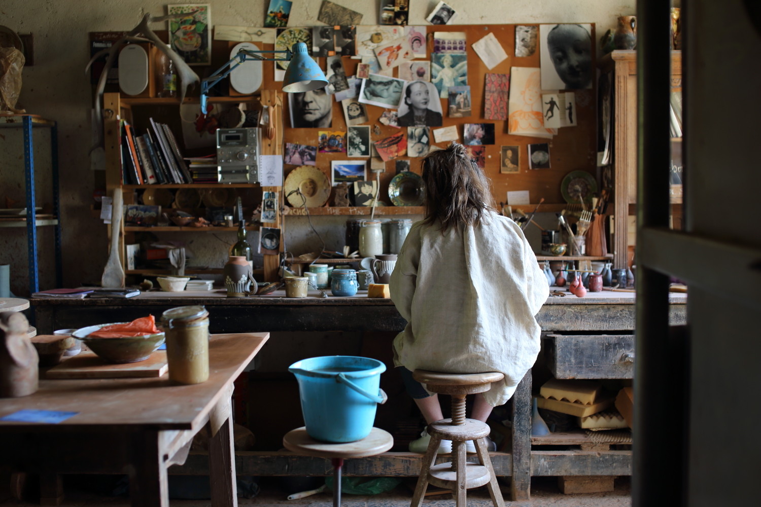 1980年代を代表するフランスのスリップウェアの工房として取り上げられるサンピニーポッタリーは、フランス中のセラミストと交流があり、工房内の敷地では定期的に世代を超えたアーティスト(セラミスト、かご職人、彫刻家、画家、フラワーアーティスト、アーティストなどなど)たちとマルシェやフェスティバル、展示会などを企画しています。そのため、友人たちの彫刻やガーデニング飾り。また旅先で一目惚れした海外の焼き物やマルシェで手に入れたオブジェなども中庭のあちらこちらで見て取れます。